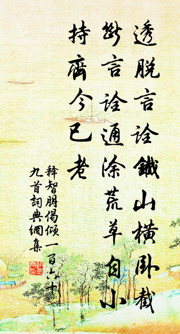 詩詞名句歷史字典書法欣賞書法字典國語詞典說文解字康熙字典古漢語字典標 題 作 者 詩 句 偈傾一百六十九首作者:釋智朋 朝代:宋代偈傾一百六十九首原文透脫言詮,鐵山橫臥。截斷言詮,通塗荒草。自小持齊今已老。詩詞問答問:偈傾一百六十九首的作者是誰?答:釋智朋問:偈傾一百六十九首寫於哪個朝代?答:宋代釋智朋偈傾一百六十九首書法欣賞偈傾一百六十九首書法作品詩詞推薦荼蕊花宋祁〔宋代〕媚叢無奈密,柔蔓不勝長。非鄰粉自白,似俠骨中香。不分櫻桃艷,名先播樂章。自笑陸游〔宋代〕諸公袞袞幾金貂,自笑無材負聖朝。老氣醉中猶跌宕,閒身夢裡亦逍遙。舊書日伴吾兒讀,薄飯時從野叟招。病後點絳唇陳景沂〔宋代〕今古凡花,詞人尚作詞稱慶。紫薇名盛。似得花之聖。為底時人,一曲稀流詠。花端正。花無郎病。病亦歸之命。為救一後生作釋道濟〔宋代〕後生後生,忽犯天嗔。前生惡業,今生縹身。老僧救汝,歸奉母親。諸惡莫作,免得禍臨。經吳真君舊宅施肩吾〔唐代〕古仙煉丹處,不測何歲年。至今空宅基,時有五色煙。題孫母陳孺人墓誌劉克莊〔宋代〕誨子如陶母,持身比伯姬。攜扶同出峽,僑寄未還枝。阡有時而表,魂無所不之。一端差慰意,徐字與楊碑。天寒偶成舒邦佐〔宋代〕雲凍長空鋪水墨,風鳴破屋響琅玕。憶梅探梅春已露,欲雪不雪天正寒。呵筆豈能詩句好,擁爐偏怕酒瓶乾。太平送胡季昭謫象州次王盧溪送澹庵眨新州韻李元實〔宋代〕知公不怕鬼門關,直氣橫乾清禁閒。雕嘴明知林甫毒,鯁言要與澹班。一身渠任黃茆里,千古名標青史間。非晚清春到村居好四絕鄭剛中〔宋代〕春到村居好,茅檐日漸長。杯深新酒滑,焙暖早茶香。夜坐有懷曹鄴〔唐代〕悄悄月出樹,東南若微霜。愁人不成寐,五月夜亦長。佳期杳天末,骨肉不在旁。年華且有限,厥體難久康。人言良嗣以予生朝將至以古賦一首為壽作三絕與這鄭剛中〔宋代〕乳燕飛飛竹色深,阿樞嬌賀想同斟。要知此日婦姑意,便是南方子父心。歷陽寄定城尉彥逢弟王之道〔宋代〕故園鵯鵊久催耕,休戀公田秫與秔。別恨久隨黃耳去,歸心應望白雲生。干戈叢里三書考,春夏交來幾閉城。我亦明妃怨楊凌〔唐代〕漢國明妃去不還,馬駝弦管向陰山。匣中縱有菱花鏡,羞對單于照舊顏。西園招陳彥招同飲黃公度〔宋代〕稻粱未飽且紛紛,鴻鵠低徊雞鶩群。萬里歸心閩嶠月,十年旅夢瘴溪雲。鄰諳好事頻賒酒,家不全貧肯賣文。未用濠梁凱歌胡榘〔宋代〕春殘天氣何佳哉,捷書夜自濠梁來。將軍生擒偽駙馬,虜兵十萬冰山摧。何物輕獧挑胡羯,萬里煙塵暗邊徼。邊臣翠蛟亭呈孫元素鍊師張蘊〔宋代〕剡剡星虹白日寒,山香一曲落雲端。乘虬道士排空去,怒雨聲搖碧玉巒。句陳至〔唐代〕藻井尚寒龍跡在,紅樓初施日光通。用前韻酬鄭山長楊公遠〔宋代〕短鬢蕭蕭已半霜,從教憔悴勝東陽。磨穿老硯畫成趣,撚斷吟髭句不香。月下行歌閒放逸,酒邊起舞發清狂。欲過送知全禪師南遊劉得仁〔唐代〕師譽振京城,談空萬乘聽。北行山已雪,南去木猶青。夜岳禪銷月,秋潭汲動星。回期不可定,孤鶴在高冥。逍遙詠宋太宗〔宋代〕恍惚人難曉,天仙語默玄。修心無道理,終日自忙然。我命真中趣,長生認宿緣。機權饒使用,聖事不虛傳。名句推薦鴻雁向西北,因書報天涯。李白《千里思》 欲加之罪,其無辭乎?左丘明《左傳·僖公·僖公十年》 夜闌更秉燭,相對如夢寐杜甫《羌村》 白雲回望合,青靄入看無。王維《終南山》 天寒水鳥自相依,十百為群戲落暉。秦觀《還自廣陵》 陰壑生虛籟,月林散清影杜甫《游龍門奉先寺》 言者異,則人心變矣。劉向《戰國策·趙三·秦攻趙於長平》 日下壁而沉彩,月上軒而飛光。江淹《別賦》 不期修古,不法常可。韓非及後人《韓非子·五蠹》 煙霏雲斂;其容清明,天高日晶;歐陽修《秋聲賦》