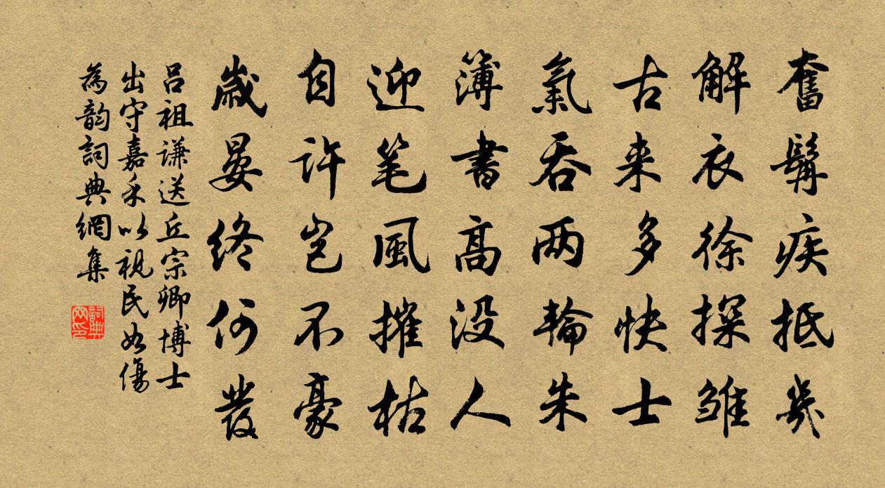 詩詞名句歷史字典書法欣賞書法字典國語詞典說文解字康熙字典古漢語字典標 題 作 者 詩 句 送丘宗卿博士出守嘉禾以視民如傷為韻作者:呂祖謙 朝代:宋代原文奮髯疾抵幾,解衣徐探雛。古來多快士,氣吞兩輪朱。簿書高沒人,迎筆風摧枯。自許豈不豪,歲晏終何發。詩詞問答問:《送丘宗卿博士出守嘉禾以視民如傷為韻》的作者是誰?答:呂祖謙問:該詩寫於哪個朝代?答:宋代書法欣賞送丘宗卿博士出守嘉禾以視民如傷為韻書法作品詩詞推薦謝亭送別徐渾〔唐代〕勞歌一曲解行舟,紅葉青山水急流。日暮酒醒人已遠,滿天風雨下西樓。鶴林寺陳均〔宋代〕知有楓林坐竹間,每尋紆路試登山。虛檐忽風籠中鶴,似我愛閒身未閒。齊天樂楊無咎〔宋代〕疏疏數點黃梅雨。殊方又逢重五。角黍包金,草蒲泛玉,風物依然荊楚。衫裁艾虎。更釵鳧朱符,臂纏紅縷。撲粉貞元十四年旱甚,見權門移芍藥花呂溫〔唐代〕綠原青壟漸成塵,汲井開園日日新。四月帶花移芍藥,不知憂國是何人。過塗荊二山遇暗石梅堯臣〔宋代〕淮流兩山間,勢束秋漲急。聚石如伏兵,斂斂波下立。輕舟不可防,而況昧所習。暗值柂已毀,後者戒前及。同發念奴嬌趙善括〔宋代〕江南到處,被波光雲影,留人行色。昔我來時春正好,舞絮□飛南陌。今日登臨,讀書齋上,重作憑欄客。清溪轂龍眼李劉〔宋代〕絳衣搖曳綻冰肌,依約華清出浴時。何物鴉兒驅不去,前身恐是食酥兒。題自畫大樹項聖謨〔清代〕風號大樹中天立,日落西山四海孤。短策且隨時旦暮,不堪回首望菰蒲。僧院影堂許渾〔唐代〕香銷雲凝舊僧家,僧剎殘燈壁半斜。日暮松煙空漠漠,秋風吹破妙蓮華。垂絲釣趙彥端〔宋代〕莫愁有信。全勝春夢無準。篆縷欲銷,衣粉堪認。殘夢醒。枕夜涼滿鬢。想香逕。正垂垂美蔭。晚花在否,朱闌誰喜見呂元錫聞往謁李仁甫奉簡短作晁公溯〔宋代〕關塞三峨北,山川五渡西。喜逢連璧友,來自釣璜溪。先世施行馬,高才滯割雞。平生李元禮,好士必提攜。題燕邸洋川公養浩堂畫二首黃庭堅〔宋代〕擁膝度殘臘,攀條驚早春。陳郎浮竹葉,著我北歸人。發楊港渡入交石夾四首楊萬里〔宋代〕山斷情相接,江同泒暫分。無風猶細浪,有日卻輕雲。生熟衣中半,陰晴氣兩熏。還家渾欲早,徐掉也堪欣。風徐夤〔唐代〕城上寒來思莫窮,土囊萍末兩難同。飄成遠浪江湖際,吹起暮塵京洛中。飛雪蕭條殘臘節,落花狼藉古行宮。春能郊祀慶成三首任希夷〔宋代〕溫溫和氣襲龍斿,薄晚輕雲忽便收。穆若清躬升午陛,爛然華月滿圓丘。燭光不動風前影,星彩交輝冕上旒。拜貺菩薩蠻(送劉帥)袁去華〔宋代〕重湖草木威名熟。兒童猶唱平郴曲。宴寢靜愔愔。恩波湘水深。舉頭天尺五。穩步煙霄去。三柱黑頭公。朔庭談笑寄李校書游簡寂觀黃滔〔唐代〕古觀雲溪上,孤懷永夜中。梧桐四更雨,山水一庭風。詩得如何句,仙遊最勝宮。卻愁逢羽客,相與入煙空。自永康還連日又告旱懇祈勤恪初四五日再得甘程公許〔宋代〕茂陵何識瑞乾封,遑恤蕭條四海空。魴尾如今較勞止,廟謨端不倖邊功。秋日同覺公上人眺慈恩塔六韻李洞〔唐代〕九級聳蓮宮,晴登袖拂虹。房廊窺井底,世界出籠中。照牖三山火,吹鈴八極風。細聞槎客語,遙辨海魚沖。禁靜南來苦熱戲作二首黃公度〔宋代〕農夫烈日夏畦耕,仙家九轉丹灶成。阿奴投燭婢翻羹,飛蛾赴焰雞遭烹。湯為池兮火為城,未如三伏南州行。名句推薦忽大風起,塵氣莽莽然,城市依稀而已。蒲松齡《山市》 更滿眼、殘紅吹盡,葉底黃鸝自語。韓元吉《薄倖·送安伯弟》 見侮而不鬥,辱也!公孫龍《公孫龍子·跡府》 每見寒士將達,必有一段謙光可掬。袁黃《了凡四訓·謙德之效》 吹到一片秋香,清輝了如雪。納蘭性德《琵琶仙·中秋》 無為其所不為,無欲其所不欲。孟子《孟子·盡心章句上·第十七節》 微陽下喬木,遠色隱秋山。馬戴《落日悵望》 今日雲景好,水綠秋山明。李白《九日》 幸非一人,專固害。來俊臣《羅織經·治下卷第三》 荊吳相接水為鄉,君去春江正淼茫。孟浩然《送杜十四之江南 / 送杜晃進士之東吳》