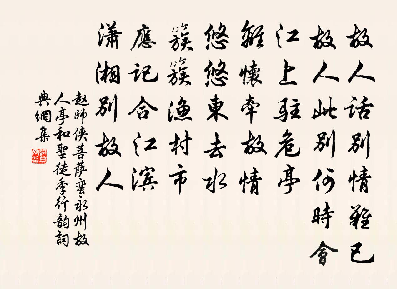 詩詞名句歷史字典書法欣賞書法字典國語詞典說文解字康熙字典古漢語字典標 題 作 者 詩 句 菩薩蠻(永州故人亭和聖徒季行韻)作者:趙師俠 朝代:宋代原文故人話別情難已。故人此別何時會。江上駐危亭。離懷牽故情。悠悠東去水。簇簇漁村市。應記合江濱。瀟湘別故人。詩詞問答問:《菩薩蠻(永州故人亭和聖徒季行韻)》的作者是誰?答:趙師俠問:該詩寫於哪個朝代?答:宋代問:該詩是什麼體裁?答:詞書法欣賞菩薩蠻(永州故人亭和聖徒季行韻)書法作品詩詞推薦謁金門(晚春)李流謙〔宋代〕行不記。貪看遠峰顰翠。風約柳花吹又起。故黏行客袂。老大渾無歡意。不為傷春憔悴。茅屋數間修竹里。日長春試墨三首陳著〔宋代〕兔毫染上何妨淺,蟬翼寫來可放輕。為愛淡中多醞藉,卻嫌濃處太分明。題岳陽樓馮時行〔宋代〕洞庭涵浸八百里,岳陽樓高跨湖尾。天空地迥豁疏襟,有客臨風來徙倚。是時窮冬天氣昏,慘澹愁殺湘君魂。層欄初夏張嵲〔宋代〕孟夏忽已至,雨余草木荒。俯澗有驚泉,仰林無遺芳。山中歲事晚,是日農始忙。布穀鳴遠林,田家競農桑。故園訓子詹初〔宋代〕呼爾群兒,示爾兒知。儉則本立,學則智資。時逐勿逐,古聖是規。守道安貧,我所慕思。競勢趨豪,我心實悲。題吳田園雜興詩顧逢友〔宋代〕一卷田園雜興詩,世人傳誦已多時。其中字字有來處,不是箋來不得知。將適天台,留別臨安李主簿孟浩然〔唐代〕枳棘君尚棲,匏瓜吾豈系。念離當夏首,漂泊指炎裔。江海非墮游,田園失歸計。定山既早發,漁浦亦宵濟。泛泛題劉泰娘舍孫棨〔唐代〕尋常凡木最輕樗,今日尋樗桂不如。漢高新破鹹陽後,英俊奔波遂吃虛。悼劉謙之知錄陳傅良〔宋代〕海內多吾友,飄零今幾人。相忘尤墮淚,欲誄輒傷神。才力矜餘地,心期恥後塵。溘然無一語,愁殺白頭親。書扇二首趙文〔宋代〕明月何時掇,秋風幾日還。若教人不熱,敢怨我長閒。題梨嶺馮唐調盧篆〔宋代〕五原塞外驕兒悍,萬死台前女子多。聞道中郎知魏尚,不教天子憶廉頗。又贈術士薛鏡台二首徐元傑〔宋代〕儒流今以術為資,滿腹星躔洞隱微。自號鏡台須自照,逢人休浪泄天機。予己未十月二十有二日去涪上越明年八月二十晁公溯〔宋代〕重來閒曳杖藜行,白帽依前似管寧。風雨只如當日恨,江山不改故時青。天寒未夕窗先暝,霜晚無聲葉自零。詩罷李士宏得薌林五老石地野人趙文〔宋代〕薌林兒童醜石何曾兒童醜,化為五老如此壽。高低俯仰各有意,清潤堅貞皆可友。剜劖刻削巧戲劇,誰為此者鴻蒙論詩三十首·其九元好問〔金代〕斗靡夸多費覽觀,陸文猶恨冗於潘。心聲只要傳心了,布穀瀾翻可是難。靈岩寺薛令之〔唐代〕草堂棲在靈山谷,勤苦詩書向燈燭。柴門半掩寂無人,惟有白雲相伴宿。閨思施樞〔宋代〕簾底臨鸞惜歲華,鬢雲慵掠寶釵斜。落梅香斷無訊息,一樹春風屬杏花。過九嶺徐璣〔宋代〕斷岸橫路水潺潺,行到山根又上山。眼看別峰雲霧起,不知身也在雲間。寄題程氏菊莊馬廷鸞〔宋代〕一觴浥露餐英美,八表同昏履運艱。芳節不隨籬下老,悠悠嘉氣眼中山。賀新郎黃人傑〔宋代〕突屼金仙屋。素秋深、長空霽雨,萬山如浴。驚破元戎呼小隊,來看飛泉噴玉。正晚谷,清鏡圓熟。還是紫微初度名句推薦離愁萬種,醉鄉一夜頭白。施耐庵《念奴嬌·天南地北》 如何亡國恨,盡在大江東!屈大均《秣陵》 鶯啼燕語報新年,馬邑龍堆路幾千。皇甫冉《春思》 山檣谷塹依然在,弱吐強吞盡已空。杜牧《題武關》 玉在山而草木潤,淵生珠而崖不枯。荀子《荀子·勸學》 年少萬兜鍪,坐斷東南戰未休。辛棄疾《南鄉子·登京口北固亭有懷》 慘慘時節盡,蘭葉復凋零。徐幹《室思》 道同方獲其利,道異惟受其害。來俊臣《羅織經·察奸卷第八》 燈前目力雖非昔,猶課蠅頭二萬言。陸游《讀書》 泛菊杯深,吹梅角遠,同在京城。劉過《柳梢青·送盧梅坡》