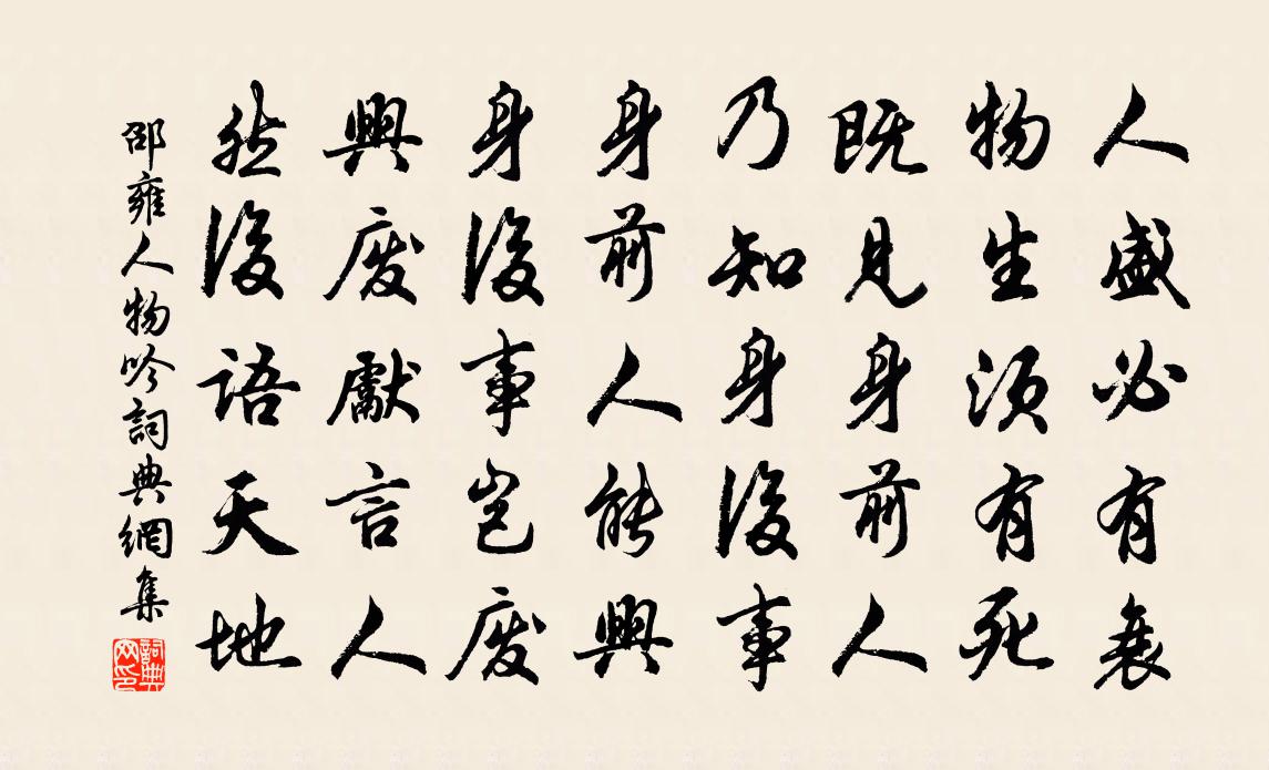 詩詞名句歷史字典書法欣賞書法字典國語詞典說文解字康熙字典古漢語字典標 題 作 者 詩 句 人物吟作者:邵雍 朝代:宋代人物吟原文人盛必有衰,物生須有死。既見身前人,乃知身後事。身前人能興,身後事豈廢。興廢先言人,然後語天地。詩詞問答問:人物吟的作者是誰?答:邵雍問:人物吟寫於哪個朝代?答:宋代邵雍人物吟書法欣賞人物吟書法作品詩詞推薦西省對花憶忠州東坡新花樹因寄題東樓白居易〔唐代〕每看闕下丹青樹,不忘天邊錦繡林。西掖垣中今日眼,南賓樓上去年心。花含春意無分別,物感人情有淺深。最憶元夕周端臣〔宋代〕小院春寒月到遲,閉門閒課上元詩。南來父老消磨盡,耳畔無人說舊時。題覺海寺黃庭堅〔宋代〕爐香滔滔水沈肥,水遶禪床竹遶溪。一段秋蟬思高柳,夕陽原在竹陰西。挽樂應乃堂陽枋〔宋代〕高堂憶昨燕春風,雙老怡愉生桂棹東。藍衲歸時饒榜綠,橘香懷處少萱紅,悲纏忍舟中藏壑,德感還知月在空。挽徐郎中王柏〔宋代〕郎潛不復坦衿期,留得清名舉世知。老矣空還新虎節,歸來只是舊鴻禧。危言寧免班行忌,已死猶聞海內推。病里集英殿賜第出馬上口占王之道〔宋代〕鞭絲曳雪繚官槐,綠陣中間一道開。高下未勞輕喜慍,相公曾作榜梢來。得建業倅鄭覺民書言虜亂自淮以北民苦徵調皆陸游〔宋代〕邦命中興漢,天心大討曹。風雲助開泰,河渭盪腥臊。日避揮戈勇,山齊積甲高。煌煌祖宗業,只在馭群豪。鷓鴣天朱敦儒〔宋代〕至節先庚欲雪天。玳筵圍錦帳青氈。嫖姚副帥招佳客,太守高明別乘賢。歌宛轉,舞蹁遷。金釵十二擁嬋娟。老人再用前韻張九成〔宋代〕野澗江灣三兩枝,一時清絕破愁思。纖纖弄蕊霜秋里,滴滴開花葉落時。借問喔詩記幽夢,何如把酒對東籬。不然雁來紅孫吳會〔宋代〕訾碧成朱被眼瞞,分明是葉作花看。道人本不知香色,只與窗前草一般。送湯希賢晦庵書院山長仇遠〔宋代〕文公闕里女星源,手澤遺書尚有傳。精舍三年常作主,修程千里若登仙。青衫槐笏存家譜,練帶花屏擁客船。故老洛城秋雨宋庠〔宋代〕霜月兼寒雨,高齋伴寂寥。已能陰漠漠,更自韻蕭蕭。宮迥天低闕,津長霧失橋。蘆灰迷桂暈,梁屋掩霞朝。煙重題唐希雅畫寒江圖陳與義〔宋代〕江頭雲黃天醖雪,樹枝慘慘凍欲折。耐寒野鴨不知歸,猶向沙邊弄羽衣。黃茅母日不自力,影亂弱藻相因依。惟有送孟孺卿落第歸濟陽岑參〔唐代〕獻賦頭欲白,還家衣已穿。羞過灞陵樹,歸種汶陽田。客舍少鄉信,床頭無酒錢。聖朝徒側席,濟上獨遺賢。送田使君牧蔡州馬戴〔唐代〕主意思政理,牧人官不輕。樹多淮右地,山遠汝南城。望稼周田隔,登樓楚月生。懸知蔣亭下,渚鶴伴閒行。題珣師休牧軒宗澤〔宋代〕一乘休去已忘機,恰似當初未牧時。雲起雲消本無跡。有為全體是無為。贈杜二拾遺高適〔唐代〕傳道招提客,詩書自討論。佛香時入院,僧飯屢過門。聽法還應難,尋經剩欲翻。草玄今已畢,此外復何言。和趙茂州即事六首郭印〔宋代〕前世愚夫哂鄧通,即山鼓鑄死飢窮。貪名勿羨青雲士,守道甘為白髮翁。日月賓士駒過隙,乾坤跼蹐鳥居籠。反觀次韻陳茲明五絕句史彌寧〔宋代〕幾年枉掛右丞圖,未辨家山瓜芋區。騎馬紅塵歸計晚,逢人囁囁話江湖。次韻許子大李丞相宅牡丹芍藥詩洪炎〔宋代〕次韻許子大李丞相宅牡丹芍藥詩山丹麗質冠年華,復有餘容殿百花。看取三春如轉影,折來一笑是生涯。綺羅不妒名句推薦綺席象床寒玉枕,美人何處醉黃花。汪元量《望江南·幽州九日》 中池所以綠,待我泛紅光。沈約《詠芙蓉》 窮冬烈風,大雪深數尺,足膚皸裂而不知。宋濂《送東陽馬生序》 山中相送罷,日暮掩柴扉。王維《送別 / 山中送別 / 送友》 記得武陵相見日,六年往事堪驚周紫芝《臨江仙·送光州曾使君》 滄海月明珠有淚,藍田日暖玉生煙。李商隱《錦瑟》 來說是非者,便是是非人。佚名《增廣賢文·上集》 窗間梅熟落蒂,牆下筍成出林。范成大《喜晴》 林深藏卻雲門寺,回首若耶溪。張可久《人月圓·會稽懷古》 春悄悄,夜迢迢。碧雲天共楚宮遙。晏幾道《鷓鴣天·小令尊前見玉簫》