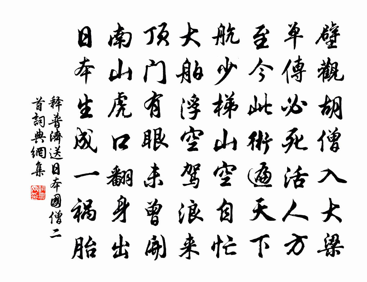 詩詞名句歷史字典書法欣賞書法字典國語詞典說文解字康熙字典古漢語字典標 題 作 者 詩 句 送日本國僧二首作者:釋普濟 朝代:宋代送日本國僧二首原文壁觀胡僧入大梁,單傳必死活人方。至今此術遍天下,航少梯山空自忙。大舶浮空駕浪來,頂門有眼未曾開。南山虎口翻身出,日本生成一禍胎。詩詞問答問:送日本國僧二首的作者是誰?答:釋普濟問:送日本國僧二首寫於哪個朝代?答:宋代釋普濟送日本國僧二首書法欣賞送日本國僧二首書法作品詩詞推薦鄭侍郎招賞瑞香曾幾〔宋代〕浮花雖不多,要是乏美質。前庭錦烘籠,君向何許得。色香極穠麗,裁翦極細密。複幕重簾開,毋令犯風日。滿路花/促拍滿路花楊 * 〔宋代〕愁得鬢絲斑,沒得心腸破。上梢恩共愛,忒過火。一床錦被,將為都包裹。剛被旁人隔,不似鴛鴦,等閒常得雙臥初伏大雨戲呈無咎四首鄧忠臣〔宋代〕汗流龜趺如炊釜,蜉蝣飛空蚊運土。眼看織雲上太清,曾不崇朝八荒雨。金柔火老旱太甚,咀嚼冰雪如餳乳。豐隆答杜孝錫觀鄉老堂韓維〔宋代〕華發蒼然亮直身,誰將彩筆欲傳神。論功顧我常流汗,好事煩君為拂塵。漢閣寂寥班氏贊,伊川瀟灑白公真。懷賢夜坐梅堯臣〔宋代〕夜久方慮寂,空堂燈燭明。落葉有暫響,暗蟲無停聲。力學不為己,甘貧且徇名。聊為詠懷篇,還想阮步兵。出軍戎昱〔唐代〕龍繞旌竿獸滿旗,翻營乍似雪中移。中軍一隊三千騎,儘是并州遊俠兒。頌古釋雲〔宋代〕狗子無佛性,泥捏活大聖。不是泗州人,說著也不信。和司徒侍中壬子寒食會壓沙寺詩二首強至〔宋代〕四照梨花一色中,他時珍賞有雌雄。高牙就景開芳宴,皓齒停歌誦正風。樂極光陰窮日御,詩成造化奪春工。佳辰梅答方蒙仲〔宋代〕人言是金屋,我見即柴門。但認安身處,區區何足論。飛行二首白玉蟾〔宋代〕劍光長笑古劉家,不斬流星只斬蛇。從得歷年三四百,蟠桃猶自未開花。寄潘子善徐寶之〔宋代〕少陽一疏折 * ,拂袖歸來日月閒。誤國小人猶法從,扣閽諸子自賢關。是非頗亦通千古,義利那能立兩間。若向澄清閣祖無擇〔宋代〕范滂雅志在澄清,今日廉車命閣名。華榜高標雖具美,奈何長是困蒼生。雪晴游惠山劉過〔宋代〕松杉如立密當門,長在山中管送迎。棲石草根留雪在,響階檐溜滴春聲。簿書撥置君能到,碑刻摩挲眼倍明。欲作羅壽可再如舊都作歸來窗以為親悅勸之歸者皆陳杰〔宋代〕玉門關冷風低草,浪泊水西看飛鳥。柴桑松菊坐來荒,杜曲桑麻隨分有。封侯作夢嗟晚歲,吟詩無功成白首。驀波和虞使君春雨程公許〔宋代〕詩翁高臥滄江上,幾為憂民霜鬢毛。推枕中宵賦春雨,筆鋒如瑩鸊鵜膏。贈鳥窠和尚詩白居易〔唐代〕空門有路不知處,頭白齒黃猶念經。何年飲著聲聞酒,迄至如今醉未醒。 殊不惡齋秋晚閒吟五絕范成大〔宋代〕好風入簾圖畫響,斜照穿隙網絲明。檐間雙雀有時斗,壁下一蛩終日鳴。相和歌辭善哉行僧貫休〔唐代〕有美一人兮婉如清揚,識曲別音兮令姿煌煌。繡袂捧琴兮登君子堂,如彼萱草兮使我憂忘。欲贈之以紫玉尺,白銀浙西刈禾以高竹叉在水田中望之如群駝曹勛〔宋代〕浙西純種晚秋禾,更得明年雨不多。且刈且歌豐歲甚,平洋彌望列明駝。大義庵主釋智愚〔宋代〕山根旋縛尖頭屋,溪上新開數畝田。老矣不能得殿手,倚筇凝目送寒煙。名句推薦鳥飛反故鄉兮,狐死必首丘。屈原《九章》 貧居鬧市無人問,富在深山有遠親。佚名《增廣賢文·上集》 我今因病魂顛倒,唯夢閒人不夢君。元稹《酬樂天頻夢微之》 記得年時臨上馬,看人眼淚汪汪。劉彤《臨江仙·千里長安名利客》 辭柯霜葉,飛來就我題紅。朱庭玉《天淨沙·秋》 青蒲銜紫茸,長葉復從風。佚名《拔蒲二首》 專一則勝,離散則敗。尉繚《尉繚子·兵令上》 輕汗微微透碧紈,明朝端午浴芳蘭。蘇軾《浣溪沙·端午》 君看石芒碭,掩淚悲千古李白《丁督護歌》 鹹言上國繁華,豈謂帝城羈旅。子蘭《秋日思舊山》