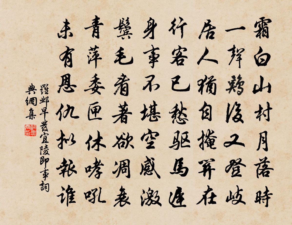 詩詞名句歷史字典書法欣賞書法字典國語詞典說文解字康熙字典古漢語字典標 題 作 者 詩 句 早發宜陵即事作者:羅鄴 朝代:唐代早發宜陵即事原文霜白山村月落時,一聲雞後又登岐。居人猶自掩關在,行客已愁驅馬遲。身事不堪空感激,鬢毛看著欲凋衰。青萍委匣休哮吼,未有恩仇擬報誰。詩詞問答問:早發宜陵即事的作者是誰?答:羅鄴問:早發宜陵即事寫於哪個朝代?答:唐代問:早發宜陵即事是什麼體裁?答:七律羅鄴早發宜陵即事書法欣賞早發宜陵即事書法作品注釋全唐詩:卷654-25詩詞推薦偈頌一百四十一首釋師範〔宋代〕一元正月半,燈火連霄漢。千人與萬人,聚頭相共看。隨牒至南康軍呈李宰四首曾豐〔宋代〕善刀初不露鋒芒,五柳圍門琴臥堂。百里桑麻春塞眼,四時風月夜搜腸。牽牛花陳景沂〔宋代〕牽牛易斯藥,固特取其義。安用柔軟蔓,曲為縈絆地。汝若不巧沿,何能可旁致。始者無附托,頭腦極細殢。一得復吳秘正五詩陳造〔宋代〕作宰古尚教,宓齊但橫琴。唐吏猶易為,讀書或松林。一從來海瀕,琴書暗塵侵。俗有隻今異,鞭撲違寸心。復用韻謝湯子才賀雨晁公溯〔宋代〕亢陽乃為災,正坐我德涼。有雲輒復散,南箕端{上竹下欺}揚。舊聞江都相,亦有請雨方。星符久未下,天意終喜雨陸游〔宋代〕幽人睡覺夜未央,四檐懸溜聲浪浪。樂哉甘澍及時至,九衢一洗塵沙黃。明朝鄰曲各驩喜,賽廟沽酒刲豬羊。不勞紫宸殿正旦宴教坊口號蘇頌〔宋代〕敦牂開歲斗回杓,共慶元正視朔朝。仗下法官陳禹會,宴開平樂奏虞韶。北邦膚使星持節,近侍詞臣頌獻椒。共效天龍恭敬贊釋智遇〔宋代〕去散千峰曉,神龍應念來。補陀岩上士,心識幾時灰。天辰歐陽修〔宋代〕天形如車輪,晝夜常不息。三辰隨出沒,曾不差分刻。北辰居其所,帝座嚴尊極。眾星拱而環,大小各有職。不動隱秀亭劉倓〔宋代〕一重一崦一岧嶢,隱秀寒光次第高。借得筍輿如小艇,晚風千里泛清濤。丁卯元日十首劉克莊〔宋代〕□□戴白蒼頭醜,筆禿無化藻思枯。惟有春風不知老,年年傅粉又施朱。送馮介迎覲魏野〔宋代〕離聲無管弦,空把指頻彈。惟子猶為客,何人不作官。前程貧豈易,後會老應難。拜想高堂下, * 淚始乾。伯常少留別業寄詩索酒因以奉報曾鞏〔宋代〕未擁雙騶謁漢庭,暫留車馬憩林坰。多情置驛邀佳客,好事磨鉛勘舊經。芳草連門三徑遠,朝雲臨幌數峰青。春醪賀李大著釋寶曇〔宋代〕眉山縣前江可憐,昔人飲此俱成仙。只今獨數蘇與李,豈伊親濯玻璃川。功名事業天所靳,況復真宰持其權。先公竹里館王維〔唐代〕獨坐幽篁里,彈琴復長嘯。深林人不知,明月來相照。簡江國韓尉謝珍惠二絕蘇籀〔宋代〕江國綿蠻登俎味,蒻缸漬畔糝鹽醯。坐愚糜殞追時好,嗟汝頭顱不自知。滿庭芳如愚居士〔宋代〕吾乃當塗,棄儒奉道,遵行聖誨多年。已逾三紀,截滅六塵緣。因習業、自營度日,未嘗謁見豪賢。般若力,掀翻春恨韓偓〔唐代〕殘夢依依酒力餘,城頭畫角伴啼烏。平明未卷西樓幕,院靜時聞響轆轤。書事李流謙〔宋代〕飽飯將何適,攜筇登翠微。江長仍曲折,樹遠欲依稀。煮井未休汲,田家初掩扉。驚心崖路險,隔岸喚船歸。江邊趙嘏〔唐代〕終日勞車馬,江邊款行扉。殘花春浪闊,小酒故人稀。戍鼓客帆遠,津雲夕照微。何由兄與弟,俱及暮潮歸。名句推薦夫謀必素見成事焉,而後履之左丘明《國語·吳語·越王勾踐命諸稽郢行成於吳》 試上吳門窺郡郭,清明幾處有新煙。張繼《閭門即事》 聞名不如見面,見面勝似聞名。施耐庵《水滸傳·第三回》 是非成敗轉頭空。楊慎《臨江仙·滾滾長江東逝水》 雍雍新雁咽寒聲,愁恨年年長相似。李煜《謝新恩·冉冉秋光留不住》 一朝春盡紅顏老,花落人亡兩不知。曹雪芹《紅樓夢·第二十七回》 雪洗虜塵靜,風約楚雲留張孝祥《水調歌頭·和龐佑父》 此中有真意,欲辨已忘言。陶淵明《飲酒·其五》 轉禍而為福,因敗而為功。劉向《戰國策·燕一·燕文公時》 雨恨雲愁,江南依舊稱佳麗。王禹偁《點絳唇·感興》