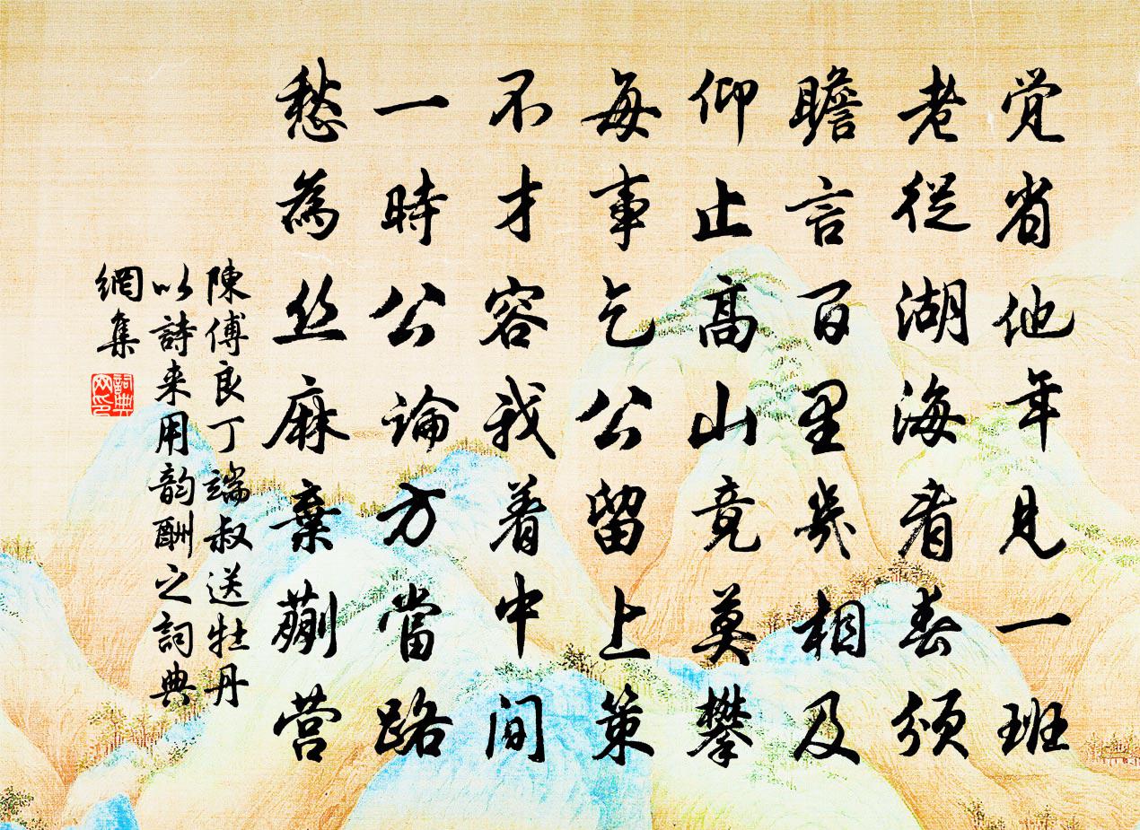 詩詞名句歷史字典書法欣賞書法字典國語詞典說文解字康熙字典古漢語字典標 題 作 者 詩 句 丁端叔送牡丹以詩來用韻酬之作者:陳傅良 朝代:宋代原文覺省他年見一班,老從湖海看春頒。瞻言百里幾相及,仰止高山竟莫攀。每事乞公留上策,不才容我著中間。一時公論方當路,愁為絲麻棄蒯營。詩詞問答問:《丁端叔送牡丹以詩來用韻酬之》的作者是誰?答:陳傅良問:該詩寫於哪個朝代?答:宋代書法欣賞丁端叔送牡丹以詩來用韻酬之書法作品詩詞推薦和座主尚書春日郊居吳融〔唐代〕海燕初歸朔雁回,靜眠深掩百花台。春蔬已為高僧掇,臘醞還因熟客開。檐外暖絲兼絮墮,檻前輕浪帶鷗來。謝公偈釋戒香〔宋代〕孟冬改旦曉天寒,葉落歸根露遠山。不是見聞生滅法,當頭莫作見聞看。杜門鄭剛中〔宋代〕柴門深閉豈須開,謂可張羅亦陋哉。閒聽竹間幽鳥語,絕勝門外俗人來。偈頌七十二首釋祖欽〔宋代〕同時啐啄不同時,石火電光猶較遲。燈影里行今已會,蹉跎非是落便宜。禪人寫真求贊釋正覺〔宋代〕眉低不愁,眼深非惡。鼻孔累垂,口唇齷齪。月明破夜兮野水懷秋,霽色摩霜閒雲投壑。能錯落縱橫十字兮,妙提和子由蠶市蘇軾〔宋代〕蜀人廢衣食常苦廢艱,蜀人遊樂不知還。千人耕種萬人食,一年辛苦一春閒。閒廢以廢為市,共忘辛苦逐欣歡。去東坡八首蘇軾〔宋代〕自昔有微泉,來從遠嶺背。穿城過聚落,流惡壯蓬艾。去為柯氏陂,十畝魚蝦會。歲旱泉亦竭,枯萍黏破塊。昨夜句仇遠〔宋代〕老尚留樊素,貧休比范丹。玉樓春歐陽修〔宋代〕芙蓉斗暈燕支淺。留著晚花開小宴。畫船紅日晚風清,柳色溪光晴照暖。美人爭勸梨花盞。舞困玉腰裙縷慢。莫交好事近(何希淵生日)王之道〔宋代〕春色到梅梢,人在東風清嚏。曾見少微初降,藹龍泉佳氣。功名富貴屬多才,如子已無幾。造物恰同予意,放驊騮送陸務觀赴七閩提舉常平茶事周必大〔宋代〕暮年桑薴毀茶經,應為征行不到閩。今有雲孫持使節,好因貢焙祀茶神。過左伯桃羊角哀墓周邦彥〔宋代〕古交久淪喪,末世尤反覆。谷風歌焚輪,黃鳥譬伐木。永懷羊與左,重義逾血屬。客行乾楚王,冬雪無斗粟。傾糧重送徐州李從事商隱薛逢〔唐代〕曉乘征騎帶犀渠,醉別都門慘袂初。蓮府望高秦御史,柳營官重漢尚書。斬蛇澤畔人煙曉,戲馬台前樹影疏。尺組劍池陸游〔宋代〕我壯喜學劍,十年客峨岷。毫髮恐未盡,屠釣求隱淪。今年獨何幸,見此度世人?夜深來較術,雷雨戰江津。劍客送外弟宇文挺臣二首張栻〔宋代〕漠漠灕江上,匆匆送客情。平原宵雨濕,絕壁野雲橫。世路多親轍,韋編有舊盟。中流屹砥柱,過浪豈能傾。烏烏歌樂雷發〔宋代〕莫讀書,莫讀書,惠施五車今何如。請君為我焚卻離騷賦,我亦為君劈碎太極圖。朅來相就飲斗酒,聽我仰天歌烏答林昌宗詩筌韻劉翼〔宋代〕經鋤小暇弄詩筌,老去仍知默是祥。滄海移舟盡琴趣,雖然終不似無弦。寄題福唐林迥南華洞陳襄〔宋代〕梅嶺峰前習隱亭,拂衣聊此玩真經。四時花木錦繡谷,十里江山水墨屏。猿鶴只愁空北嶽,鵾鵬終待化南溟。知君薦蓆釋慧開〔宋代〕亂草窠中,打成一片。坐臥寂然,真機頓現。念奴嬌范成大〔宋代〕水鄉霜落,望西山一寸,修眉橫碧。南浦潮生帆影去,日落天青江白。萬里浮雲,被風吹散,又被風吹積。尊前歌名句推薦金河秋半虜弦開,雲外驚飛四散哀。杜牧《早雁》 是故置本不安者,無務豐末。墨子《墨子·02章 修身》 送君歸去愁不盡,又惜空度涼風天。王昌齡《送狄宗亨》 後人收得休歡喜, 還有收人在後頭。范仲淹《書扇示門人》 酒濃春入夢,窗破月尋人。毛滂《臨江仙·都城元夕》 雁聲遠過瀟湘去,十二樓中月自明。溫庭筠《瑤瑟怨》 移舟水濺差差綠,倚檻風擺柄柄香鄭谷《蓮葉》 守分安命,順時聽天。朱柏廬《朱子家訓·全文》 勸君莫惜花前醉,今年花謝,明年花謝,白了人頭。趙秉文《青杏兒·風雨替花愁》 霜輕未殺萋萋草,日暖初乾漠漠沙。白居易《早冬》