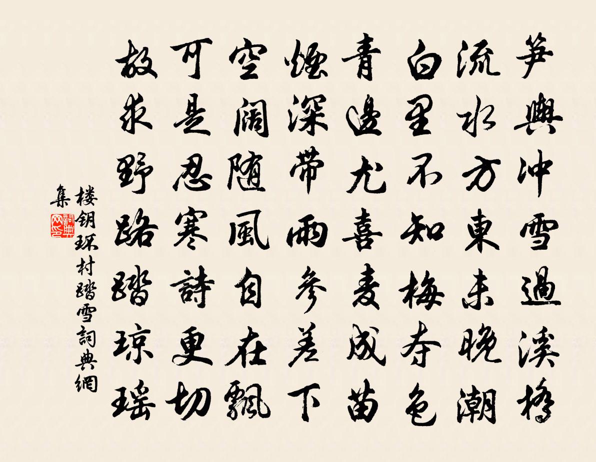 詩詞名句歷史字典書法欣賞書法字典國語詞典說文解字康熙字典古漢語字典標 題 作 者 詩 句 環村踏雪作者:樓鑰 朝代:宋代環村踏雪原文筍輿沖雪過溪橋,流水方東未晚潮。白里不知梅奪色,青邊尤喜麥成苗。煙深帶雨參差下,空闊隨風自在飄。可是忍寒詩更切,故求野路踏瓊瑤。詩詞問答問:環村踏雪的作者是誰?答:樓鑰問:環村踏雪寫於哪個朝代?答:宋代樓鑰環村踏雪書法欣賞環村踏雪書法作品詩詞推薦金華山人陳襄〔宋代〕幽居倚翠巒,塵事不相干。天地醉來小,琴棋靜里歡。雨苔春徑綠,風竹夜窗寒。若問長生術,金爐有寶丹。玩月釋智圓〔宋代〕去秋曾久玩,皓魄墜天涯。始恨經年別,還忻此夜期。鳴蛩沈古砌,驚鵲繞寒枝。莫厭憑欄久,冰輪覺漸移。嘉禾百詠四城張堯同〔宋代〕吳越爭雄日,區區在用兵。空餘爭戰地,無處不高城。聞子規羅鄴〔唐代〕蜀魄千年尚怨誰,聲聲啼血向花枝。滿山明月東風夜,正是愁人不寐時。酬周從事望海亭見寄元稹〔唐代〕年老無流輩,行稀足薜蘿。熱時憐水近,高處見山多。衣袖長堪舞,喉嚨轉解歌。不辭狂復醉,人世有風波。閒居即事王建〔唐代〕老病貪光景,尋常不下簾。妻愁耽酒僻,人怪考詩嚴。小婢偷紅紙,嬌兒弄白髯。有時看舊卷,未免意中嫌。答李滁州題庭前石竹花見寄獨孤及〔唐代〕殷疑曙霞染,巧類匣刀裁。不怕南風熱,能迎小暑開。游蜂憐色好,思婦感年催。覽贈添離恨,愁腸日幾回。歌李嶠〔唐代〕漢帝臨汾水,周仙去洛濱。郢中吟白雪,樑上繞飛塵。響發行雲駐,聲隨子夜新。願君聽扣角,當自識賢臣。久旱石介〔宋代〕風伯且須戢頭角,放出龍啄萬丈長。啄垂一尺雨一尺,得雨萬丈成豐穰。書林十景詩謝枋得〔宋代〕長虹跨陸登雲衢,會同海宇皆車書。日斜市潰夜喧息,月來雲靜天無疵。水劫金蟇形不術,常生玉兔藥常搗。可憐老農嘆裘萬頃〔宋代〕霜耕冰在趾,雨種泥沒膝。旱魃忽為虐,耕種謾勞力。去年幸一稔,今歲免艱食。細聽老農語,令我三嘆息。但願莘夫再用前韻作詩謝余過其居復用韻答之趙蕃〔宋代〕漫道平生風馬牛,也能歷歷記吾州。相從大勝十年讀,肯過輕為一飯留。氣合未知投分晚,腹虛終苦和詩搜。我方虞美人向子諲〔宋代〕兼示開元棲隱二老銀山堆里廬山對。舟子愁如醉。笑看五老了無憂。大覺胸中雲夢、氣橫秋。若人到得歸元處。空次韻張濟川雪李若水〔宋代〕雲將剪水戲微茫,草木非春也自芳。坐上落來千片急,鬢間添得數絲長。氣凌詩骨箋毫健,味借茶甌齒頰香。久客殘句多生綺語磨不盡蘇軾〔宋代〕多生綺語磨不盡。洪景伯正字分繡閣謝伋〔宋代〕層屋周遭列岫圍,碧滋紅彩眩睛暉。境中一段明綾出,望外千春碎縷歸。疊嶂分留女媧練,飛流不雜衛文衣。主人四明山中十絕韓采岩戴表元〔宋代〕洞深煙樹碧氤氳,只採靈苗不採薪。聞著蹤由多懶說,相逢莫有姓韓人。論詩三十首·二十元好問〔金代〕謝客風容映古今,發源誰似柳州深? 朱弦一拂遺音在,卻是當年寂寞心。 題楊冠卿客亭類稿姜夔〔宋代〕楊侯書筆力天下書奇,早歲書豪顏相追書隨。一班略見客亭槁,文采炳蔚驚群兒。長安城中擇幽棲,靜退不願時人暮春偶成四首廖行之〔宋代〕殘花自開落,遲日半晴陰。翡翠山容暗,蒲萄江漲深。綠楊渾作絮,黃鳥欲成瘖。春事今如許,誰能首酒斟。名句推薦在世百年,那有三萬六千日之樂。程登吉《幼學瓊林·卷二·老幼壽誕》 歲夜高堂列明燭,美酒一杯聲一曲。李頎《聽安萬善吹觱篥歌》 教也者,長善而救其失者也。戴聖《禮記·學記》 靈山多秀色,空水共氤氳。張九齡《湖口望廬山瀑布泉 / 湖口望廬山瀑布水》 匈奴草黃馬正肥,金山西見煙塵飛,漢家大將西出師。岑參《走馬川行奉送出師西征 / 走馬川行奉送封大夫出師西征》 操吳戈兮被犀甲,車錯轂兮短兵接。屈原《國殤》 直須看盡洛城花,始共春風容易別。歐陽修《玉樓春·尊前擬把歸期說》 巴子城頭青草暮。巴山重疊相逢處。張先《漁家傲·和程公辟贈》 柳條將舒未舒,柔梢披風,麥田淺鬣寸許。袁宏道《滿井遊記》 葉落根偏固,心虛節更高。憨山德清《詠竹五首》