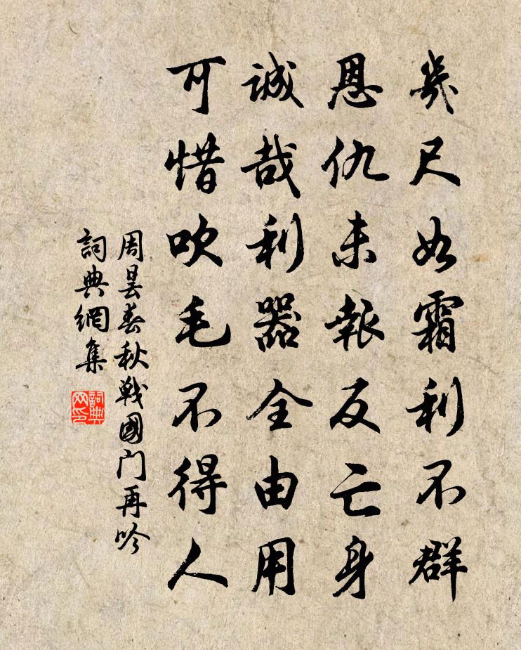 詩詞名句歷史字典書法欣賞書法字典國語詞典說文解字康熙字典古漢語字典標 題 作 者 詩 句 春秋戰國門再吟作者:周曇 朝代:唐代春秋戰國門再吟原文幾尺如霜利不群,恩仇未報反亡身。誠哉利器全由用,可惜吹毛不得人。詩詞問答問:春秋戰國門再吟的作者是誰?答:周曇問:春秋戰國門再吟寫於哪個朝代?答:唐代周曇春秋戰國門再吟書法欣賞春秋戰國門再吟書法作品注釋全唐詩:卷728-65詩詞推薦王洽永嘉帖贊岳珂〔宋代〕瑞牛出谷,既秉金籙。短轅逐犢,池鳳是續。棲梧食竹,葩奇韻馥。在此寶軸,手不可觸。神觀玉立,宛若在目。水調歌頭趙善括〔宋代〕雨霽彩虹臥,半夜水明樓。太湖極目,四面水儘是天流。幾點鱸鄉荻浦,萬里鯨波雪浪,掀舞小漁舟。金餅掛蟾魄浣溪沙(再用韻)吳潛〔宋代〕海棠已綻牡丹芽,猶有東君向上花。不須惆悵怨春華。裝綴園林新景物,推敲風月舊情懷。也饒浪蕊與浮葩。客枕陳必復〔宋代〕客枕偏饒睡,春歸尚擁綿。屋深燈易暈,漏短夢難圓。棲鳥警涼夜,鬧蛙喧雨天。一聲柔櫓過,何處上溪船。同宮子楊維楨〔元代〕同宮一相見,不用畫蛾眉。井上芙蓉怨,江蓮共一時。晝權德輿〔唐代〕孤舟漾曖景,獨鶴下秋空。安流日正晝,淨綠天無風。偶題陳宓〔宋代〕周黨不受祿,嚴光不為公。皆當建武聖,固守空山窮。丈夫各有志,未必不合中。所以二百載,鴻基擊清風。彼淺和牡丹韻趙汝績〔宋代〕園工巧栽接,樹樹品新奇。富覺春無厭,貧疑地有私。色須綃幄護,名記玉牌垂。若說能傾日,牆根有晚葵。頌古三十一首釋安永〔宋代〕一出一入,半合半開。羸鶴翹寒木,狂猿嘯古台。要知奇特事,當甚破草鞋。中秋前一夕,雨中登雙溪疊嶂,已而月出二首楊萬里〔宋代〕雙溪疊嶂舊知名,投老初登眼不醒。一雨飛來四天黑,亂雲遮斷萬峰青。急呼月色開秋色,奪得昭亭與敬亭。自笑仲秋書事陸游〔宋代〕舉家食粥顏平原,坐輅無氈鄭廣文。不是有心輕富貴,偶然看破是浮雲。汴上送客(一作汴上同楊升秀才送客歸)張祜〔唐代〕河流西下雁南飛,楚客相逢淚濕衣。張翰思歸何太切,扁舟不住又東歸。脫京口出巷難文天祥〔宋代〕不時徇鋪路縱橫,小隊戎衣自出城。天假漢兒燈一炬,旁人只道是官行。黃埭魏氏見江亭賀鑄〔宋代〕浮生欲寄酒杯間,馬上誰容一日閒。不是登高粗能賦,老夫真負爾江山。人月圓 春日次韻 北曲聊樂府續集吳監張可久〔元代〕羅衣還怯東風瘦,不似少年游。匆匆塵世,看看鏡里,白了人頭。片時春夢,十年往事,一點詩愁。海棠開後,梨命妓不至劉兼〔唐代〕琴中難挑孰憐才,獨對良宵酒數杯。蘇子黑貂將已盡,宋弘青鳥又空回。月穿淨牖霜成隙,風卷殘花錦作堆。攲枕水龍吟 題簫史圖 孫氏書鈔趙孟頫〔元代〕倚天簾百尺高台簾,雕簾畫棟簾撐雲表。簾夜靜無塵,秋魂萬里,月明如掃。誰憑欄乾,玉簫聲起,乘鸞人到。信頌古十首釋端裕〔宋代〕清淨法身花葯欄,眉毛刺倒須彌山。誰將玉笛傳悽怨,吹過蘆藂明月彎。追餞正輔表兄至博羅賦詩為別蘇軾〔宋代〕孤臣南遊墮黃菅,君亦何事來牧蠻。艤舟蜑戶龍岡窟,置酒椰葉桄榔間。高談已笑衰語陋,傑句尤覺清詩孱。博羅輕柔楊柳挾春妍孤梗梅花結雪緣此是乾坤大艾性夫〔宋代〕太史談天術轉靈,相看猶自眼青青。步占若上清台去,莫說江湖有客星。名句推薦相思血,都沁綠筠枝。姜夔《小重山令·賦潭州紅梅》 剛待不思量,吹一片、簫聲過牆。項鴻祚《太常引·客中聞歌》 青女素娥俱耐冷,月中霜里斗嬋娟。李商隱《霜月》 黃葉古祠寒雨積,清山荒冢白雲多。于謙《岳忠武王祠》 勿恃勢力而凌逼孤寡,毋貪口腹而恣殺生禽。朱柏廬《朱子家訓·全文》 去年今日關山路,細雨梅花正斷魂。蘇軾《正月二十日往岐亭郡人潘古郭三人送余於女王城東禪莊院》 覆巢之下,復有完卵劉義慶《世說新語·言語》 侵夜鸞開鏡,迎冬雉獻裘。李商隱《陳後宮》 想當年,金戈鐵馬,氣吞萬里如虎。辛棄疾《永遇樂·京口北固亭懷古》 行善濟人,人遂得以安全,即在我亦為快意王永彬《圍爐夜話·第五一則》