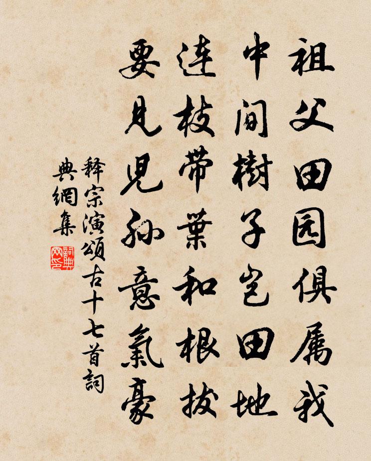 詩詞名句歷史字典書法欣賞書法字典國語詞典說文解字康熙字典古漢語字典標 題 作 者 詩 句 頌古十七首作者:釋宗演 朝代:宋代頌古十七首原文祖父田園俱屬我,中間樹子豈田地。連枝帶葉和根拔,要見兒孫意氣豪。詩詞問答問:頌古十七首的作者是誰?答:釋宗演問:頌古十七首寫於哪個朝代?答:宋代釋宗演頌古十七首書法欣賞頌古十七首書法作品詩詞推薦登樓絕句和者甚多又從而用韻擇其可錄者錄之戴復古〔宋代〕勞生百計不如閒,合把人間比夢間。天與老夫供享用,一樓風月兩屏山。一舍晁說之〔宋代〕一舍終朝得自容,強如平昔慰塗窮。爐心搜火分香燼,硯首融冰護筆鋒。愁極偶逢醽醁酒,夢回猶待景陽鍾。廟堂初晴陸游〔宋代〕暑雨初收體為輕,遠山盡出眼偏明。詩憑寫興忘工拙,酒取澆愁任濁清。綠樹有陰休倦步,澄溪無滓濯塵纓。老人解語花楊 * 〔宋代〕星橋夜度,火樹宵開,燈月光交射。翠檐銅瓦。相輝映、隱隱絳霞飄下。風流艷雅。向柳陌、纖纖共把。筵宴時、讀罪已詔楊萬里〔宋代〕莫讀輪台詔,令人淚點垂。天乎客此虜,帝者渴非羆。何罪良家子,知他大將誰?願懲危度口,儻復雁門踦。幽居陸游〔宋代〕松陵甫里舊家風,晚節何妨號放翁。衰極睡魔殊有力,愁多酒聖欲無功。一編蠹簡晴窗下,數卷疏籬落木中。退士鵲橋仙 漁父詞和放翁韻韓奕〔元代〕三江秋水,五湖春雨。只在釣船中住。滔滔波浪與天浮,釣時認得魚多處。杏壇有樹。桃源有路。罷釣有時間去。永王東巡歌·其七李白〔唐代〕王出三山按五湖,樓船跨海次陪都。戰艦森森羅虎士,征帆一一引龍駒。句晏殊〔宋代〕頻瞻太一青藜見,欲賦甘泉自鳳來。和陳藥房納涼林尚仁〔宋代〕貪涼分石坐,野服岸巾紗。竹暗鳴風葉,溪暄聚水花。深村人語靜,高樹鳥飛斜。不飲論文酒,敲碁煮夜茶。霜徐寅〔唐代〕應節誰窮造成端,菊黃豺祭問應難。紅窗透出鴛衾冷,白草飛時雁塞寒。露結芝蘭瓊屑厚,日乾葵藿粉痕殘。世間已亥雜詩 223龔自珍〔清代〕似笑山人不到家,爭將晚節盡情夸。三秋不隕芙蓉 ,九月猶開窅窳花。秋遊平泉贈韋處士閒禪師白居易〔唐代〕秋景引閒步,山游不知疲。杖藜舍輿馬,十里與僧期。昔嘗憂六十,四體不支持。今來已及此,猶未苦衰羸。[予挽潘母薛師石〔宋代〕獨玩隔廳月,淒涼三十年。渺然儒素業,翻以母儀傳。生計無中有,衰齡病後延。誰為市貞石,高刻墓之前。念奴嬌(次賈子濟韻)郭應祥〔宋代〕瓊苞玉屑,問天公、底事亂拋輕墜。城郭山川都一樣,那得個般清氣。謝女才情,如何只道,柳絮因風起。比梅差巫峽陸龜蒙〔唐代〕巫峽七百里,巫山十二重。年年自雲雨,環佩竟誰逢?感秋詠意白居易〔唐代〕炎涼遷次速如飛,又脫生衣著熟衣。繞壁暗蛩無限思,戀巢寒燕未能歸。須知流輩年年失,莫嘆衰容日日非。舊語奉同原甫度支廳壁許道寧畫松韓維〔宋代〕長松盤青冥,郁與窗戶封。許翁寫生意,獨得毫墨外。年侵日昏剝,拂拭自君輩。得非神物守,以待真賞會。翛然書亡弟殯所邵雍〔宋代〕後乎吾來,先乎吾往。當往之初,殊不相讓。唐昌觀玉蕊花折有仙人游,悵然成二絕嚴休復〔唐代〕終日齋心禱玉宸,魂銷目斷未逢真。不如滿樹瓊瑤蕊,笑對藏花洞裡人。羽車潛下 * 山,塵世何由睹蕣顏。唯有名句推薦心者修裔之根,未有根不植而枝葉榮茂者。洪應明《菜根譚·概論》 得百姓之力者富,得百姓之死者強,得百姓之譽者榮。荀子《荀子·王霸》 致君堯舜上,再使風俗淳。杜甫《奉贈韋左丞丈二十二韻》 一片段預告飛減卻春,風飄萬點正愁人。杜甫《曲江二首》 淺不足與測深,愚不足與謀智,坎井之蛙,不可與語東海之樂。荀子《荀子·正論》 東船西舫悄無言,唯見江心秋月白。白居易《琵琶行 / 琵琶引》 眼痛滅燈猶暗坐, 逆風吹浪打船聲。白居易《舟中讀元九詩》 來是春初,去是春將老。曾允元《點絳唇·一夜東風》 悲霜雪之俱下兮,聽潮水之相擊。屈原《九章》 飯疏食飲水,曲肱而枕之,樂亦在其中矣。不義而富且貴,於我如浮雲。孔子弟子《論語·述而篇》