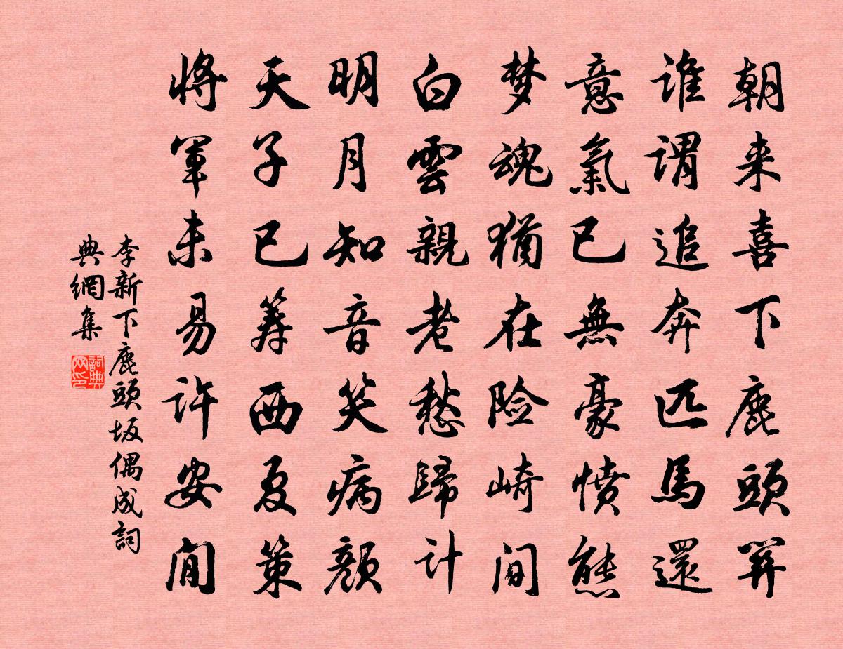詩詞名句歷史字典書法欣賞書法字典國語詞典說文解字康熙字典古漢語字典標 題 作 者 詩 句 下鹿頭坂偶成作者:李新 朝代:宋代下鹿頭坂偶成原文朝來喜下鹿頭關,誰謂追奔匹馬還。意氣已無豪憤態,夢魂猶在險崎間。白雲親老愁歸計,明月知音笑病顏。天子已籌西夏策,將軍未易許安閒。詩詞問答問:下鹿頭坂偶成的作者是誰?答:李新問:下鹿頭坂偶成寫於哪個朝代?答:宋代李新下鹿頭坂偶成書法欣賞下鹿頭坂偶成書法作品詩詞推薦送沙門弘景道俊玄奘還荊州應制李乂〔唐代〕初日承歸旨,秋風起贈言。漢珠留道味,江璧返真源。地出南關遠,天回北斗尊。寧知一柱觀,卻啟四禪門。七夕歌劉言史〔唐代〕星寥寥兮月細輪,佳期可想兮不可親。雲衣香薄妝態新,彩輧悠悠度天津。玉幌相逢夜將極,妖紅慘黛生愁色。寂寄驛梅方蒙仲〔宋代〕春色滿梢頭,所思尚千里。京洛貴人多,誰歟堪欹似。贈李端履馬光祖〔宋代〕倚門稚子灶頭妻,有米無錢相對啼。為把青蚨濟艱苦,莫教窮谷有飢黎。陳無逸張仲實皆授徒城中相望遣悶小詩往問戴表元〔宋代〕間身不用苦咨嗟,隨分風流閱歲華。白日垂簾同賣卜,清流岸幘勝趨衙。飛書漆槧詩無草,夾注高檠眼未花。更喜八絕詩白龍泉王禹偁〔宋代〕崖石何鑿鑿,渤潏涌山腳。含虛光可鑑,倒影壁如削。瀰漫到前溪,支脈通遠壑。白龍乃神物,胡此戀一勺。勢能謝富蔡見過晃沖之〔宋代〕飯蔬君莫厭,瓜果我時須。自可隨豐儉,誰能問有無。墜蜂沖博局,驚燕避投壺。不憚過從遠,頻來訪老夫。次韻張亞彥書事韓元吉〔宋代〕頡利何時縛,康居久未灰。天威如自震,敵勢不難摧。日月丹心在,風塵白眼開。受降城旋築,且緩羽書來。攝官梁小廟詩江總〔隋代〕小序詩紀雲。梁有小廟。太祖太夫人廟也。非嫡故別立廟。南史曰。侯景寇建鄴。詔以總權兼太常卿守小廟。疇昔和人柳溪鄭獬〔宋代〕三月二十七,春叢已半空。細草著露作團綠,落花擁溪相壓紅。南北遊人歸未歸,日斜飛絮撩東風。自左馮歸洛下酬樂天兼呈裴令公劉禹錫〔唐代〕新恩通籍在龍樓,分務神都近舊丘。自有園公紫芝侶,仍追少傅赤松游。華林霜葉紅霞晚,伊水晴光碧玉秋。更接追和東坡倦夜一首王之道〔宋代〕風閣開還閉,龕燈暗復明。竹間聽露滴,庭際看雲竹。皎月千門靜,微風一座清。只今廷諍者,誰復繼元成。送趙資政曾鞏〔宋代〕鎮撫西南眾望傾,玉書天上輟持衡。春風不覺岷山遠,和氣還從錦水生。學舍卻尋余教在,棠郊應喜舊陰成。歸來問正上人疾皇甫冉〔唐代〕醫王猶有疾,妙理競難窮。餌藥應隨病,觀身轉悟空。地閒花欲雨,窗冷竹生風。幾日東林去,門人待遠公。贈別從甥高五李白〔唐代〕魚目高泰山,不如一璵璠。賢甥即明月,聲價動天門。能成吾宅相,不減魏陽元。自顧寡籌略,功名安所存。五木五祖贊釋法薰〔宋代〕栽遍滿山松,暗地翻身轉。雖然得信衣,何曾識爺面。山家宋自遜〔宋代〕一片青山水四圍,家家有竹護柴扉。養成猿鶴通人語,放去牛羊識路歸。紫蕨甘肥輕鼎味,綠蓑安穩勝朝衣。浮雲碧桃岩陳岩〔宋代〕自要貪間非避秦,洞門隔斷世間塵。山中不置四時歷,開到碧桃知是春。論俗十二首劉子翬〔宋代〕野人厭羹藜,家有庖丁刀。徒夸批導手,肯念耕稼勞。隱然肉山雄,畏彼尺箠操。春泥臥寒野,夜月犁東皋。辛勤哭徐山民翁卷〔宋代〕已是窮侵骨,何期早喪身。分明上天意,磨折苦吟人。花色連晴晝,鶯聲在近鄰。誰憐三尺像,猶帶瘦精神。名句推薦滿羅衫是酒,香痕凝處,唾碧啼紅相半。張翥《陌上花·有懷》 粉墮百花洲,香殘燕子樓。曹雪芹《唐多令·柳絮》 有美一人,清揚婉兮。佚名《野有蔓草》 佇立傷神。無奈輕寒著摸人。朱淑真《減字木蘭花·春怨》 儉則傷事,侈則傷貨管仲《管子·乘馬》 老至居人下,春歸在客先。劉長卿《新年作》 莫辭酒味薄,黍地無人耕。杜甫《羌村三首·其三》 一年將盡夜,萬里未歸人。戴叔倫《除夜宿石頭驛》 天子之怒,伏屍百萬,流血千里。劉向《戰國策·魏四·秦王使人謂安陵君》 春未綠,鬢先絲。人間別久不成悲。姜夔《鷓鴣天·元夕有所夢》