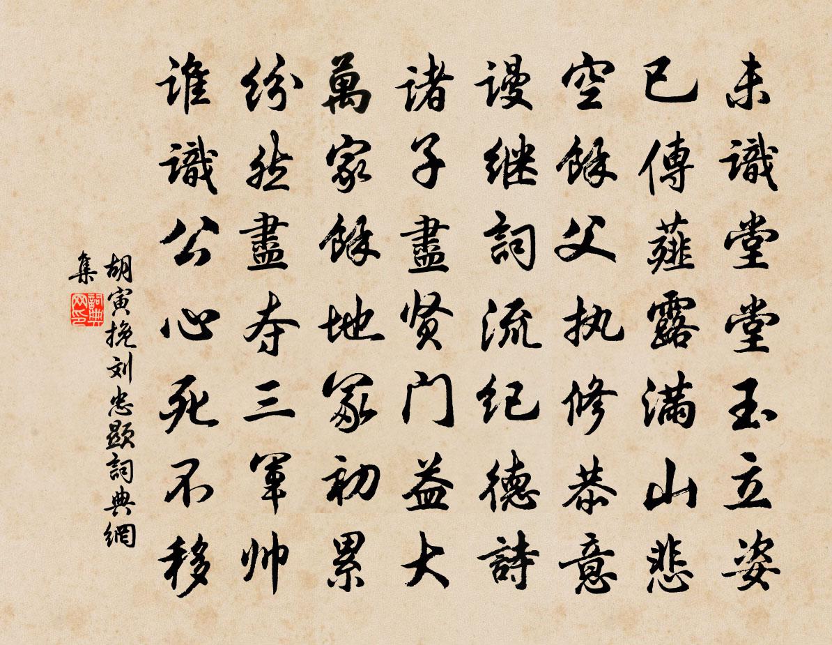 詩詞名句歷史字典書法欣賞書法字典國語詞典說文解字康熙字典古漢語字典標 題 作 者 詩 句 挽劉忠顯作者:胡寅 朝代:宋代挽劉忠顯原文未識堂堂玉立姿,已傳薤露滿山悲。空餘父執修恭意,謾繼詞流紀德詩。諸子盡賢門益大,萬家餘地冢初累。紛然盡奪三軍帥,誰識公心死不移。詩詞問答問:挽劉忠顯的作者是誰?答:胡寅問:挽劉忠顯寫於哪個朝代?答:宋代胡寅挽劉忠顯書法欣賞挽劉忠顯書法作品詩詞推薦折柳林洪〔宋代〕湖邊楊柳色如金,幾日不來成綠陰。折得柔條入城去,教人知道已春深。玉樓春歐陽修〔宋代〕酒美春濃花世界。得意人人千萬態。莫教辜負艷陽天,過了堆金何處買。已去少年無計奈。且願芳心長恁在。閒愁至洪澤寄呂少馮介然吳則禮〔宋代〕來往都梁真有期,瘦藤挈挈要追隨。獨憐老子蒙頭睡,不見梅花如雪時。經爐飽附僧伽火,齋缽長分庾氏糜。歲暮度門寺元稹〔唐代〕北祖三禪地,西山萬樹松。門臨溪一帶,橋映竹千重。翦鑿基階正,包藏景氣濃。諸岩分院宇,雙嶺抱垣墉。舍利雲邊阻雨劉宰〔宋代〕薔薇籬落送春闌,筍葚園林早夏間。牛背牧兒酣午夢,不知風雨過前山。月岩王義山〔宋代〕岩中一個月胚胎,知是誰將斧鑿開。一夜六丁將帝敕,駕空推起上天天。答友人陳普〔宋代〕雲作交遊山作賓,道心為主自安貧。柴門無鑰見同物,竹帛有名終累人。綠水一潭澄靜性,青山萬疊裹閒身。紛紛和代器之蘇軾〔宋代〕雨過郊原一番新,尋芳車馬踏無塵。普天冷食聞前古,蕭寺清游屬兩人。不作佺期問新曆,頗同之問感余春。明年次韻和景彝秋興梅堯臣〔宋代〕日月機上梭,年華東注波,未驚涼葉墜,已見白髮多。牧馬歸方健,調弓力漸和,籬邊剩曉菊,陶令奈貧何。夜到漁家(一作宿漁家)張籍〔唐代〕漁家在江口,潮水入柴扉。行客欲投宿,主人猶未歸。竹深村路遠,月出釣船稀。遙見尋沙岩,春風動草衣。思友吟邵雍〔宋代〕欲見心無已,久違情奈何。雲煙雖咫尺,不得屢相過。和楊兄二絕杜范〔宋代〕三年嘗盡萬間關,力怯強弓寸寸彎。何日變成閒世界,與君夜月對湖山。冬至孟春孟夏季秋四祀上公攝事七首佚名〔宋代〕禮經之重,祭典為宗。上公揶事,登降彌恭。庶品豐潔,令們肅雍。百神萃止,惟吉之從。廣中二首王阮〔宋代〕南來風土已安之,事已當還敢故違。銅柱略無功可錄,玉關空幸死前歸。眼看余劑憐猶在,力憑征鞍覺尚微。此去惜秋華·七夕吳文英〔宋代〕露罥蛛絲,小樓陰墮月,秋驚華鬢。宮漏未央,當時鈿釵遺恨。人間夢隔西風,算天上、年華一瞬。相逢,縱相疏和立齋書懷二首王柏〔宋代〕平生景風操,慷慨懷賦竹。恨無百畝地,相與種黃獨。只有滿架書,可寄千古目。何敢偭規矩,周容競追曲。彼不秋夜懷洛下一上人寇準〔宋代〕遊宦忘機久,心源亦自澄。夜聽吳苑雨,秋憶洛城僧。木葉驚棲鳥,寒窗暗靜燈。何時過竹院,一得問三乘。寄題隱靜三首吳芾〔宋代〕五峰雙澗舊標名,我恨當年去不成。卻羨箇中人自在,飽看山色聽泉聲。將使有詩許移廚雙溪次其韻王炎〔宋代〕石上窪尊可置杯,石邊更可著浯台。旁人不識溪山趣,將謂尋春特地來。龍嶼偶作陳藻〔宋代〕年少彎弓中鵠心,到頭衰暮也沉沉。有機悟道書篇懶,無事關懷睡思深。跋扈笑非當日態,低回靜向此山吟。撥來名句推薦人似秋鴻來有信,事如春夢了無痕。蘇軾《正月二十日與潘郭二生出郊尋春忽記去年是日同至女王城作詩乃和前韻》 望廬思其人,入室想所歷。潘安《悼亡詩三首》 騷屑西風弄晚寒,翠袖倚闌乾。納蘭性德《眼兒媚·詠紅姑娘》 舉頭望雲林,愧聽慧鳥語。王冕《墨萱圖·其一》 梨花風起正清明,遊子尋春半出城。吳惟信《蘇堤清明即事》 戎馬關山北,憑軒涕泗流。杜甫《登岳陽樓》 辛勤三十日,母瘦雛漸肥。白居易《燕詩示劉叟》 銜霜當路發,映雪擬寒開。何遜《詠早梅 / 揚州法曹梅花盛開》 舜其大知也與!舜好問而好察邇言。隱惡而揚善。子思《中庸·第六章》 平明尋白羽,沒在石棱中。盧綸《和張僕射塞下曲六首》