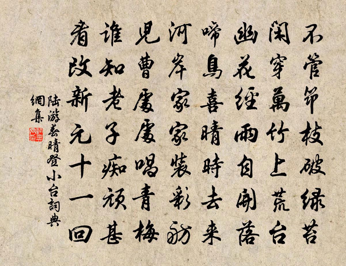 詩詞名句歷史字典書法欣賞書法字典國語詞典說文解字康熙字典古漢語字典標 題 作 者 詩 句 春晴登小台作者:陸游 朝代:宋代春晴登小台原文不管筇枝破綠苔,閒穿萬竹上荒台。幽花經雨自開落,啼鳥喜晴時去來。河岸家家裝彩舫,兒曹處處唱青梅。誰知老子痴頑甚,看改新元十一回。詩詞問答問:春晴登小台的作者是誰?答:陸游問:春晴登小台寫於哪個朝代?答:宋代問:陸游的名句有哪些?答:陸游名句大全陸遊春晴登小台書法欣賞春晴登小台書法作品詩詞推薦郊廟歌辭。周宗廟樂舞辭。禋順佚名〔唐代〕旨酒既獻,嘉殽乃迎。振其鞀鼓,潔以鉶羹。肇禋肇祀,或炮或烹。皇屍儼若,保饗是明。次陳剛父見簡韻黃文雷〔宋代〕我居深山中,細喔求友篇。解後潮海濱,得此璧一聯。山立古先民,期君能拍肩。茫茫宇宙心,楚楚東南賢。醉答樂天劉禹錫〔唐代〕洛城洛城何日歸,故人故人今轉稀。莫嗟雪裡暫時別,終擬雲間相逐飛。銅雀台李鹹用〔唐代〕但見西陵慘明月,女妓無因更相悅。有虞曾不有遺言,滴盡湘妃眼中血。送李使君貶連州劉長卿〔唐代〕獨過長沙去,誰堪此路愁。秋風散千騎,寒雨泊孤舟。賈誼辭明主,蕭何識故侯。漢廷當自召,湘水但空流。都梁八首陳造〔宋代〕天外纖雲盡,山顛望眼遙。平淮剪綠野,白塔界晴霄。客里風光異,吟邊物象驕。功名它日事,回首興蕭條。盧道子赴銓試項安世〔宋代〕高才真乾父,新渥繼難兄。舟楫維湘岸,簪纓覲漢京。學雖工比興,科亦要刑名。書律三冬足,榮華一戰成。夕坐宋祁〔宋代〕岸幘坐前楹,天圍極望青。日華開嶺霧,風影碎池星。重露驚棲鶴,幽叢帶暗螢。塵機心久息,寧待據梧暝。贈郭高叔三首陳造〔宋代〕護香深合寫烏絲,有底朱樓望得知。與問天津倚欄客,庸非青瑣竊桃兒。贈黃藻二章許月卿〔宋代〕參軍一夢到詞場,難弟想應瞻聖皇。此去捷音來鼎鼎,向來諸老去堂堂。馬頭雪絮天街玉,人跡板橋茅店霜。君去依韻和李舍人旅中寒食感事梅堯臣〔宋代〕一百五日風雨急,斜飄細濕春郊衣。梨花半殘意思少,客子漸老尋游非。戢戢車徒九門盛,寥寥煙火萬家微。今朝安樂窩中吟邵雍〔宋代〕安樂窩中春不虧,山翁出入小車兒。水邊平轉綠楊岸,花外就移芳草堤。明快眼看三月景,康強身歷四朝時。鳳凰游桃源一百韻劉禹錫〔唐代〕沅江清悠悠,連山郁岑寂。回流抱絕巘,皎鏡含虛碧。昏旦遞明媚,煙嵐分委積。香蔓垂綠潭,暴龍照孤磧。淵明秋日望倚帝山吳筠〔唐代〕楚服多奇山,靈表先倚帝。孤秀白雲里,青冥何崇麗。秋天已晴朗,晚日更澄霽。遠峰列在目,杳與神襟契。倏忽省試內出白鹿宣示百官乾寧二年黃滔〔唐代〕上瑞何曾乏,毛群表色難。推於五靈少,宣示百寮觀。形奪場駒潔,光交月兔寒。已馴瑤草別,孤立雪花團。戴豸送鄉同舍黃君賞謁陳提學戴表元〔宋代〕六館賦聲在,五陵遊伴稀。如何趨仕版,猶自著儒衣。春晚鶯羞語,城寒花慢飛,江湖陳仲舉,相見肯空歸。送李杍黟縣方回〔宋代〕邑貧風俗儉,君去共弦歌。持己心宜蕭,臨民色要和。寒儒尤可念,巨室已無多。好與諸耆舊,商量細撫摩。偈頌一百四十一首釋師範〔宋代〕現前三昧,了無向背。雪壓樓台,風號松檜。除兵部侍郎賜帶趁朝參虞儔〔宋代〕幸叨持橐侍甘泉,敢意恩榮慰暮年。紫綬金章光照地,絲鞭玉勒喜朝天。兒曹莫起無魚嘆,人世難為跨鶴仙。報國聞袁思正卒於宿州孔武仲〔宋代〕畫舸西河載酒回,東籬持菊待君來。何知頃刻成千古,不及從容共一杯。羈旅夢魂難際接,平生交分但悲哀。中年名句推薦惜恐鏡中春。不如花草新。張先《菩薩蠻·憶郎還上層樓曲》 更可惜,雪中高樹,香篝熏素被。周邦彥《花犯·小石梅花》 松花釀酒,春水煎茶。張可久《人月圓·山中書事》 雲物不殊鄉國異,教兒且覆掌中杯。杜甫《小至》 西山白雪三城戍,南浦清江萬里橋。杜甫《野望》 波瀾誓不起,妾心古井水。孟郊《列女操 / 烈女操》 寒禽與衰草,處處伴愁顏。司空曙《賊平後送人北歸》 立身不高一步立,如塵里振衣、泥中濯足,如何超達?洪應明《菜根譚·概論》 天下三分明月夜,二分無賴是揚州。徐凝《憶揚州》 欲黃昏。雨打梨花深閉門。李重元《憶王孫·春詞》