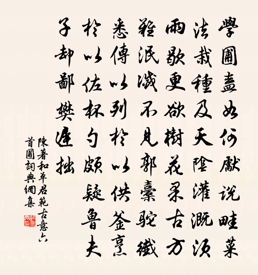 詩詞名句歷史字典書法欣賞書法字典國語詞典說文解字康熙字典古漢語字典標 題 作 者 詩 句 和單君范古意六首圃作者:陳著 朝代:宋代和單君范古意六首圃原文學圃盍如何,先說畦菜法。栽種及天陰,灌溉須雨歇。更欲樹花果,古方難泯滅。不見郭橐駝,纖悉傳以列。於以供釜烹,於以佐杯勺。頗疑魯夫子,卻鄙樊遲拙。詩詞問答問:和單君范古意六首圃的作者是誰?答:陳著問:和單君范古意六首圃寫於哪個朝代?答:宋代陳著和單君范古意六首圃書法欣賞和單君范古意六首圃書法作品詩詞推薦赴蘇州至常州答賈舍人白居易〔唐代〕杭城隔歲轉蘇台,還擁前時五馬回。厭見簿書先眼合,喜逢杯酒暫眉開。未酬恩寵年空去,欲立功名命不來。一別感皇恩張侃〔宋代〕換骨有丹砂,阿誰傳與。愛惜芳心不輕吐。客來爛熳,解得此情良苦。有時三兩點、胭脂雨。舊說江南,紅羅亭下小雪前三日鍾冠之約余侍老人行山舟發後洪入洪咨夔〔宋代〕系舡官柳根,闤闠得深密。日落遠水明,雲收好山出。天開有聲畫,人立無價璧。酒行不須多,鷺下孤蒲夕。連日寒甚強甫二首劉克莊〔宋代〕同雲作色日潛輝,咄咄玄冥未霽威。驛使能無一枝寄,客程應有六花飛。烏公恩重宜親謁,絳老年高可蚤歸。想見郊廟歌辭。享文敬太子廟樂章。迎俎酌獻馮伉〔唐代〕撰日瞻景,誠陳樂張。禮容秩秩,羽舞煌煌。肅將滌濯,祗薦芬芳。永錫繁祉,思深饗嘗。翰林王學士奉使兩川楊億〔宋代〕萬里征西頻告捷,九重喻蜀正裁書。忽聞召對浴堂殿,元是親乘使者車。井邑凋殘經亂後,軍城鼓舞拜恩初。銅梁薄薄酒陳造〔宋代〕薄薄酒,顏可丹。粗粗布,身不寒。醜醜婦,貧相歡。人生浪行路難,欲不外騖心內安。富貴底用極力奸,政自沐次韻張氏女弟詠雪王安石〔宋代〕天上空多地上稀,初寒風力故應微。那能鎮壓黃塵起,強欲侵凌白日飛。邑犬橫來矜意氣,窟蟾偷出助光輝。都城和茅山高拾遺憶山中雜題五首小樓儲嗣宗〔唐代〕松杉風外亂山青,曲幾焚香對石屏。空憶去年春雨後,燕泥時污太玄經。游沈道士館詩沈約〔南北朝〕秦皇御宇宙。漢帝恢武功。歡娛人事盡。情性猶未充。銳意三山上。托意九霄中。既表祈年觀。復立望仙宮。寧為奉和九日幸臨渭亭登高應制得日字鄭南金〔唐代〕重陽玉律應,萬乘金輿出。風起韻虞弦,雲開吐堯日。菊花浮聖酒,茱香掛衰質。欲知恩煦多,順動觀秋實。哭待制許先生員興宗〔宋代〕平生一靈台,機智得深屏。出使星移天,歸朝月生嶺。上書肺肝露,不事頰舌逞。事狀嚴歷歷,九原忽甦醒。殿前歡·對菊自嘆張養浩〔元代〕可憐秋,一簾疏雨暗西樓,黃花零落重陽後,減盡風流。對黃花人自羞,花依舊,人比黃花瘦。問花不語,花替人謝公像曾極〔宋代〕失喜向來因折屐,含悲今日為聞箏。人間悲喜何時了,攜伎東山載酒行。鸚鵡曲 都門感舊馮子振〔元代〕都門花月蹉跎住。恰做了白髮傖父。酒微醒曲榭迴廊,忘卻天街酥雨。曉鍾殘紅被留溫,又逐馬蹄聲去。恨無題亭次韻蘇教授飯鄭教授五首項安世〔宋代〕三生杜牧垂綸手,渠自長安障日頭。我意從來端易敗,分司御史莫來休。送緣有禪師與雷處士入武夷山貫休〔唐代〕師與雷居士,尋山道入閩。應將熊耳印,別授武夷君。崖罅仙棺出,江垠毒草分。他年相覓在,莫苦入深雲。宮詞一百首岳珂〔宋代〕東華銀榜麗卿雲,資善新開列近臣。昨夜清台占上瑞,樂章已奏月重輪。將赴京師,留題孫處士山居二首許渾〔唐代〕草堂近西郭,遙對敬亭開。枕膩海雲起,簟涼山雨來。高歌懷地肺,遠賦憶天台。應學相如志,終須駟馬回。西岩偈頌一百零一首釋慧性〔宋代〕祖禰不了,兒孫遭累。祝著磕著,無處迴避。不辭禮拜燒香,也要遞相鈍置。名句推薦良冶之子,必學為裘;良弓之子,必學為箕戴聖《禮記·學記》 桂花香霧冷,梧葉西風影。高觀國《菩薩蠻·何須急管吹雲暝》 歲寒,然後知松柏之後凋也。孔子弟子《論語·子罕篇》 仍憐故鄉水,萬里送行舟。李白《渡荊門送別》 知君用心如日月,事夫誓擬同生死。張籍《節婦吟·寄東平李司空師道》 馬毛帶雪汗氣蒸,五花連錢旋作冰,幕中草檄硯水凝。岑參《走馬川行奉送出師西征 / 走馬川行奉送封大夫出師西征》 譬之若水火然,善用之則為福,不能用之則為禍呂不韋《呂氏春秋·紀·孟秋紀》 臨砌影,寒香亂、凍梅藏韻。吳文英《花犯·郭希道送水仙索賦》 家在夢中何日到,春來江上幾人還?盧綸《長安春望》 宜有詞仙,擁素雲黃鶴,與君遊戲。姜夔《翠樓吟·淳熙丙午冬》