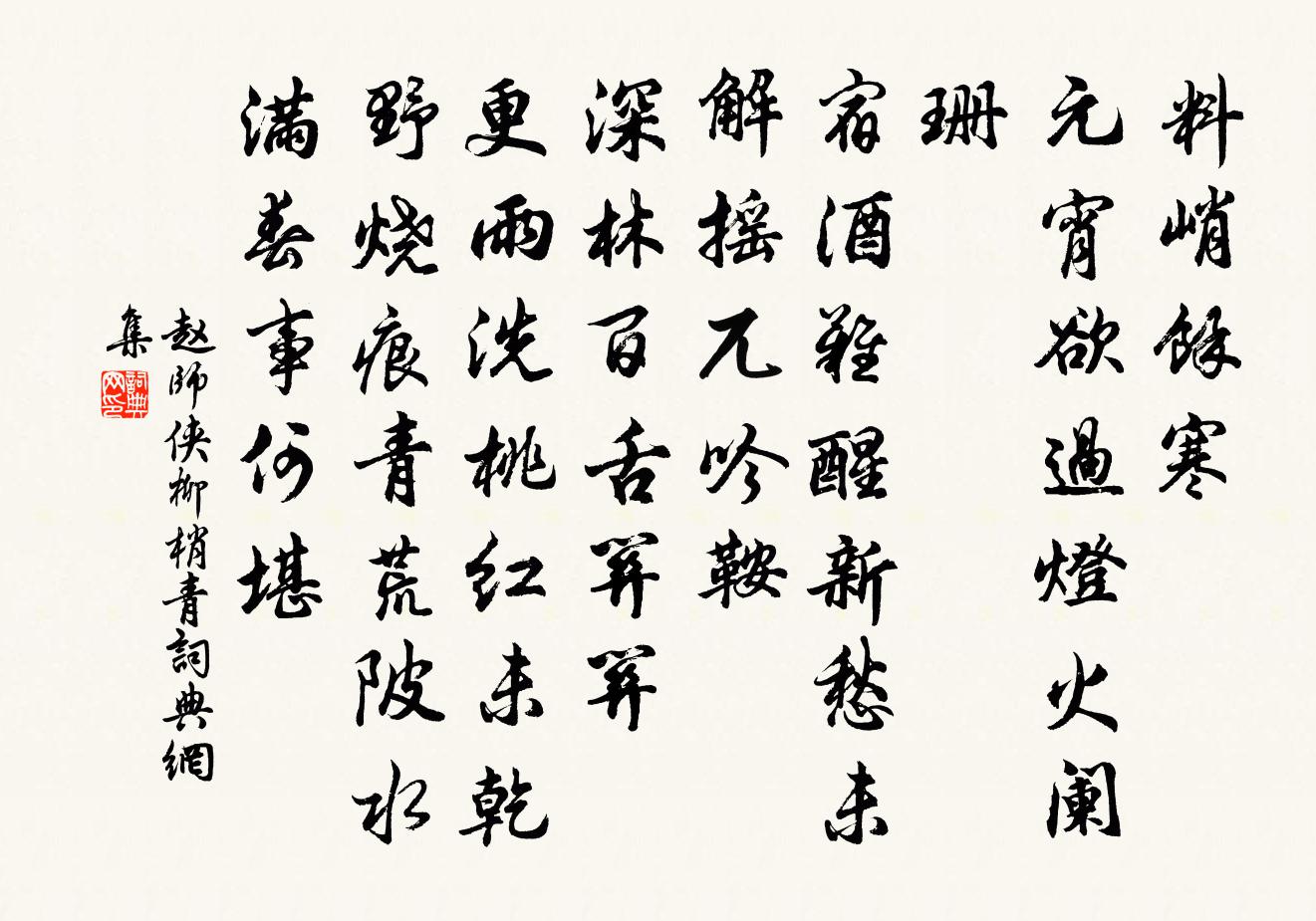 詩詞名句歷史字典書法欣賞書法字典國語詞典說文解字康熙字典古漢語字典標 題 作 者 詩 句 柳梢青作者:趙師俠 朝代:宋代柳梢青原文料峭餘寒。元宵欲過,燈火闌珊。宿酒難醒,新愁未解,搖兀吟鞍。深林百舌關關。更雨洗、桃紅未乾。野燒痕青,荒陂水滿,春事何堪。詩詞問答問:柳梢青的作者是誰?答:趙師俠問:柳梢青寫於哪個朝代?答:宋代問:柳梢青是什麼體裁?答:詞趙師俠柳梢青書法欣賞柳梢青書法作品詩詞推薦為客吟邵雍〔宋代〕忽憶東朐為客日,壯心初見水雲鄉。島夷居處鄰荒服,潮水來時雜海商。臥看蒼溟圍大塊,坐觀紅日出扶桑。虛生又塔院洪咨夔〔宋代〕僧伽傳法處,阿育放光時。到頂直無縫,透心橫有枝。梅間詩鳳咮,竹裹酒鴟夷。醉上危層去,空明渺所思。燭影搖紅·元夕雨吳文英〔宋代〕碧澹山姿,暮寒愁沁歌眉淺。障泥南陌潤輕酥,燈火深深院。入夜笙歌漸暖。彩旗翻、宜男舞遍。恣游不怕,素襪山居徐璣〔宋代〕柳竹藏花塢,茅茨接草池。開門驚燕子,汲水得魚兒。地僻春獨靜,人閒日自遲。山禽啼忽住,飛起又相隨。櫂歌行陸機〔魏晉〕遲遲暮春日。天氣柔且嘉。元吉降初巳。濯穢游黃河。龍舟浮鷁首。羽旗垂藻葩。乘風宣飛景。逍遙戲中波。名謳九誦雙廟鮮于侁〔宋代〕旄頭光芒兮戎馬馳,海水沸盪兮鯨鯢飛。煙塵蔽日兮殺氣昏,金鼓轟天兮岳奔。小國不過兮大國顛傾,王侯戮辱兮宮詞一百首岳珂〔宋代〕玉階授鉞借前籌,上相提兵破貝州。騎火照山催召馹,紫宸殿上啟金甌。漁父 臨荊浩漁父圖十六首吳鎮〔元代〕洞庭湖上晚風生。風觸湖心一葉橫。蘭棹穩,草衣輕。只釣鱸魚不釣阻風還泊舊浦陳舜俞〔宋代〕已作淹留計,行艫豈恨遲。卻投前浦宿,還似始來時。寥泬鱸鄉遠,飄零鶴髮悲。猶欣有隱者,度景覆殘棋。紫陽觀和家兄作陳阜〔宋代〕相將到靈觀,正值雨初晴。花近香逾妙,峰遙色更清。鶴盤雲外影,磬和澗中聲。再拜真人像,還丹願指明。春遊陸游〔宋代〕方舟衝破湖波綠,聯騎蹋殘花徑紅。七十年間人換盡,放翁依舊 * 。同劉晃喜雨李隆基〔唐代〕節變寒初盡,時和氣已春。繁雲先合寸,膏雨自依旬。颯颯飛平野,霏霏靜暗塵。懸知花葉意,朝夕望中新。題麥積山天堂王仁裕〔唐代〕躡盡懸空萬仞梯,等閒身共白雲齊。檐前下視群山小,堂上平分落日低。絕頂路危人少到,古岩松健鶴頻棲。天邊偈頌一百一十七首釋紹曇〔宋代〕太里阿瘞豐城劍,才遇張華例發光。積世冤讎都掃卻,蟄龍銀匣襲珍藏。浪淘沙(九月十八日與千里賞菊三首)葛勝仲〔宋代〕又見菊花新。色淺香勻。老人衰病臥漳濱。雖是無聊仍止酒,幸有嘉賓。不用怨蕭辰。不似芳春。請看金蕊照金尊題靈隱寺西堂粉壁釋道濟〔宋代〕小小庵兒小小窗,小小房兒小小床。出入小童並小行,小心伏事小西堂。凝祥池上晚歸蔡襄〔宋代〕綠徑陰陰落景微,楊花零亂上人衣。長煙似愛滄波面,風色雖豪不肯飛。京邸思家劉黻〔宋代〕小樓終日戶全扃,詩卷閒消客子檠。城裡不曾聞杜宇,尚疑三月未清明。湖上晚歸陸游〔宋代〕地僻多幽事,官閒慰古心。晚花藏密葉,新筍補疏林。碩果畦丁獻,芳醪稚子斟。碧雲遮日盡,歸路更蕭森。詩家楊公遠〔宋代〕松下雲根迂菊徑,梅邊竹外著茆茨。天教管領閒風月,得句無非妙色絲。名句推薦荷葉生時春恨生,荷葉枯時秋恨成。李商隱《暮秋獨游曲江》 初聞征雁已無蟬,百尺樓高水接天。李商隱《霜月》 風一更,雪一更,聒碎鄉心夢不成,故園無此聲。納蘭性德《長相思·山一程》 藥醫不死病,佛度有緣人。馮夢龍《醒世恆言·卷十》 綠葉青跗映丹萼,與君裴回上金閣。王勃《落花落》 離情被橫笛,吹過亂山東。王安石《江上》 害人之心不可有,防人之心不可無!佚名《增廣賢文·下集》 話別情多聲欲戰,玉著痕留紅粉面。顧敻《玉樓春·拂水雙飛來去燕》 惟上惟己,去表求實,奸者自見矣。來俊臣《羅織經·察奸卷第八》 開荒南野際,守拙歸園田。陶淵明《歸園田居·其一》