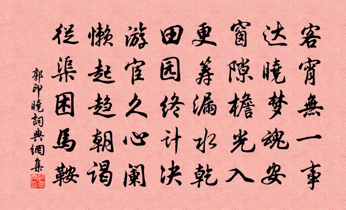 詩詞名句歷史字典書法欣賞書法字典國語詞典說文解字康熙字典古漢語字典標 題 作 者 詩 句 曉作者:郭印 朝代:宋代曉原文客宵無一事,達曉夢魂安。窗隙檐光入,更籌漏水乾。田園終計決,遊宦久心闌。懶起趨朝謁,從渠困馬鞍。詩詞問答問:曉的作者是誰?答:郭印問:曉寫於哪個朝代?答:宋代郭印曉書法欣賞曉書法作品詩詞推薦潄玉齋前雜卉皆龍圖王至之所植各賦一章凡得宋祁〔宋代〕脩脩稍出類,辭卑不肯叢。有節天容直,無心道與空。別丹水王禹偁〔宋代〕曾經爛漫濯吾纓,忍別潺湲月下聲。便入紅應染詩思,吟魂猶合數年清。宣曲二十二韻楊億〔宋代〕宣曲更衣寵,高堂薦枕榮。十洲銀闕峻,三閣玉梯橫。鸞扇裁紈製,羊車插竹迎。南樓看馬舞,北埭聽雞鳴。彩縷餉饁歌鄭樵〔宋代〕提筐兮阡陌,花紅兮衣白,步遲遲兮心迫迫。行至止兮嗟於役,低聲相勞兮日其夕。次韻張太博方得余所遺二程先生集辨二程戲邵許應龍〔宋代〕文字未科斗,圖書未龜龍。燦然天地間,此理觸處逢。是謂象之祖,而為數之宗。昊羲古神聖,先得人所同。文因漁家傲陳克〔宋代〕寶瑟塵生郎去後。綠窗閒卻春風手。淺色宮羅新染就。晴時後。裁縫細意花枝斗。象尺熏爐移永晝。粉澀浥浥薔薇訪李甘原居賈島〔唐代〕原西居處靜,門對曲江開。石縫銜枯草,查根上淨苔。翠微泉夜落,紫閣鳥時來。仍憶尋淇岸,同行采蕨回。念奴嬌 附見天籟集卷上內。原題雲。中秋重仲璋〔元代〕消磨九日,算年年、惟有黃花白酒。把酒簪花能有幾,七十光陰回首。人壽難期,酒杯有限,花色應如舊。花濃酒村居書事陸游〔宋代〕矮缾煮粥猶難繼,小甑蒸糕豈解常。偶得鹽醯便豪侈,晨餐滿舍野蔬香。廢桑畦種花姜特立〔宋代〕課仆斸桑窠,從頭盡種花。莫教聶子見,怪我不栽禾。憶玉簫韋皋〔唐代〕黃雀銜來已數春,別時留解贈佳人。長江不見魚書至,為遣相思夢入秦。柳梢青(戲簡高菊澗)劉鎮〔宋代〕瞥眼光陰。章台舊路,楊柳春深。尚憶風流,殢人倚玉,替客揮金。高陽醉後分襟。想妒雨、嗔雲到今。訊息真時又登碧雲亭感懷三十首吳芾〔宋代〕晚上危亭喜有秋,民安物阜本無憂。鈴齋坐嘯雖多暇,爭似歸田得自由。天竺曉行陸游〔宋代〕三茆聽徹五更鐘,二竺穿窮九里松。無復官樓沽酒美,但煩湖水照衰容。浣溪沙耿時舉〔宋代〕露壓薔薇金井欄。轆轤聲斷碧絲乾。遼陽無信帶圍寬。花落池塘春夢靜,月生簾幕夜香寒。閒愁無力憑闌乾。烏啄瘡驢歌王禹偁〔宋代〕商山老烏何慘酷,喙長於釘利於鏃。拾蟲啄卵從爾為,安得殘吾負瘡畜。我從去歲謫商於,行李惟存一蹇驢。來登又獻劉濟李益〔唐代〕草綠古燕州,鶯聲引獨游。雁歸天北畔,春盡海西頭。向日花偏落,馳年水自流。感恩知有地,不上望京樓。七夕陳普〔宋代〕但把凡身小品論,不須榻頞問星辰。女郎戀別淚如雨,遑托金針度與人。訪張元明山齋陳天麟〔宋代〕張侯詩似嶺雲閒,飛鳥何心只念還。醉裹有官如物外,眼前無客似山間。來聽春枕連宵雨,看畫秋屏著色山。老去和閭丘莘叟中秋玩月吳芾〔宋代〕平生愛明月,夜坐長忘眠。每見冰輪上,兩足先跰躚。清賞意未足,常恐雲油然。老來有餘興,猶不減少年。今歲名句推薦冬夜夜寒覺夜長,沉吟久坐坐北堂。李白《夜坐吟》 山泉散漫繞階流,萬樹桃花映小樓。元稹《離思五首》 時有官船橋畔過,白鷗飛去落前灘。姜夔《釣雪亭》 商葉墮乾雨,秋衣臥單雲。孟郊《秋懷十五首》 話說多,不如少。惟其是,勿佞巧。李毓秀《弟子規·信》 浪花有意千里雪,桃花無言一隊春。李煜《漁父·浪花有意千里雪》 曉窗移枕,酒困香殘,春陰簾卷。吳文英《燭影搖紅·元夕雨》 午醉醒來愁未醒。送春春去幾時回。張先《天仙子·水調數聲持酒聽》 外亂而內整,示飢而實飽,內精而外鈍。姜子牙《六韜·文韜·兵道》 喃喃教言語,一一刷毛衣。白居易《燕詩示劉叟》