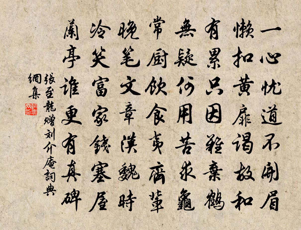詩詞名句歷史字典書法欣賞書法字典國語詞典說文解字康熙字典古漢語字典標 題 作 者 詩 句 贈劉介庵作者:張至龍 朝代:宋代贈劉介庵原文一心憂道不開眉,懶扣黃扉謁故和。有累只因難棄鶴,無疑何用苦求龜。常廚飲食夷齊輩,晚筆文章漢魏時。冷笑富家錢塞屋,蘭亭誰更有真碑。詩詞問答問:贈劉介庵的作者是誰?答:張至龍問:贈劉介庵寫於哪個朝代?答:宋代張至龍贈劉介庵書法欣賞贈劉介庵書法作品詩詞推薦傷春詞寄紫元四首白玉蟾〔宋代〕望眼生花淚已枯,青衣也合遞歸書。客情無奈春風雨,更問春空有雁無。如夢令(題淮山樓)蘇軾〔宋代〕城上層樓疊巘。城下清淮古汴。舉手揖吳雲,人與暮天俱遠。魂斷。魂斷。後夜松江月滿。重賦暨邑池亭趙孟堅〔宋代〕新沐試絺綌,涼生神骨清。發疏逗風爽,半幅紗巾輕。逍遙池上亭,綠陰取次行。清和又重見,時序無留停。叢委挽李泰發參政三首曾幾〔宋代〕公昔遭前政,忠精不少衰。立談廷爭地,上疏里居時。意氣南山在,名聲北斗垂。心知不亡者,送往得無悲。酬劉柴桑陶淵明〔魏晉〕窮居寡人用,時忘四運周。櫚庭多落葉,慨然知已秋。新葵郁北牖,嘉穟養南疇。今我不為樂,知有來歲不?命室紹興以後祀五方帝六十首佚名〔宋代〕辰牡孔碩,奉牲以告。秘祝非祈,豐年宜報。至意昭良,交乎神明。降福穰穰,用燕群生。謝陳季常惠一揞巾蘇軾〔宋代〕夫子胸中萬斛寬,此巾何事小團團。半升僅漉淵明酒,二寸才容子夏冠。好帶黃金雙得勝,可憐白薴一生酸。臂弓送客歸至郡圃殘雪銷盡楊萬里〔宋代〕三日東風入萬家,草間殘雪不留些。兒童道是雪猶在,笑指梅花作雪花。寓陳雜詩十首張耒〔宋代〕昔記古甲子,商滅而周興。如何雨此日,乃為霪雨征。陰陽久乖張,此事頗有憑。豈天悔牧野,洗此漂杵腥。舊雨崔駙馬山池重送宇文明府(得苗字)岑參〔唐代〕竹里過紅橋,花間藉綠苗。池涼醒別酒,山翠拂行鑣。鳳去妝樓閉,鳧飛葉縣遙。不逢秦女在,何處聽 * 。重送浙西李相公頃廉問江南已經七載…領舊地新加旌旄劉禹錫〔唐代〕江北萬人看玉節,江南千騎引金鐃。鳳從池上游滄海,鶴到遼東識舊巢。城下清波含百穀,窗中遠岫列三茅。碧雞闕題楊師道〔唐代〕漢家伊洛九重城,御路浮橋萬里平。桂戶雕梁連綺翼,虹梁繡柱映丹楹。朝光欲動千門曙,麗日初照百花明。燕趙鄞中送坦上人歸故里釋文珦〔宋代〕白雲相見初,而子獨知予。世態易翻覆,道交難間疏。三江同遠棹,此日晚離袪。莫放音書絕,東來有鯉魚。別一上人晁說之〔宋代〕同游不二境,卻有別離情。為日添香火,中原正用兵。解連環陸游〔宋代〕淚淹妝薄。背東風佇立,柳綿池閣。漫細字、書滿芳箋,恨釵燕箏鴻,總難憑托。風雨無情,又顛倒、綠苔紅萼。太恭人劉氏輓詞樓鑰〔宋代〕衛氏一兒足,他人總不如。一麾欣義檄,千騎擁潘輿。台岳傷歸旐,青山滿送車。佳城流慶遠,旁可萬家居。逍遙詠宋太宗〔宋代〕奧義通玄化,精微妙入神,功程隨志願,貶降背於真。靜默堪為法,無言事可親。烏賊魚楊萬里〔宋代〕秦帝東巡渡浙江,中流風緊墬書囊。至今收得磨殘墨,猶帶宮車載鮑香。寒食李石〔宋代〕夜泊依漁市,天寒問酒家。燼餘缸吐粟,澌合硯生花。月浸江妃冷,波喧海若夸。漂搖隨水宿,鳧雁寄生涯。山扉夜坐王勃〔唐代〕抱琴開野室,攜酒對情人。林塘花月下,別似一家春。名句推薦跨馬出郊時極目,不堪人事日蕭條杜甫《野望》 老驥伏櫪,志在千里。曹操《龜雖壽 / 神龜雖壽》 薄衾小枕涼天氣,乍覺別離滋味。柳永《憶帝京·薄衾小枕涼天氣》 犯刑若履虎,不畏落爪牙。李白《秦女休行》 山遠翠眉長。高處淒涼。菊花清瘦杜秋娘。吳文英《浪淘沙·九日從吳見山覓酒》 殘燈孤枕夢,輕浪五更風。徐昌圖《臨江仙·飲散離亭西去》 俯皇都之宏麗兮,瞰雲霞之浮動。曹植《銅雀台賦》 綠蓑江上秋聞笛,紅袖樓頭夜倚欄。曹雪芹《香菱詠月·其三》 夢裡不知身是客,一晌貪歡。李煜《浪淘沙令·簾外雨潺潺》 橋北橋南千百樹,綠煙金穗映清流。朱栴《官橋柳色》