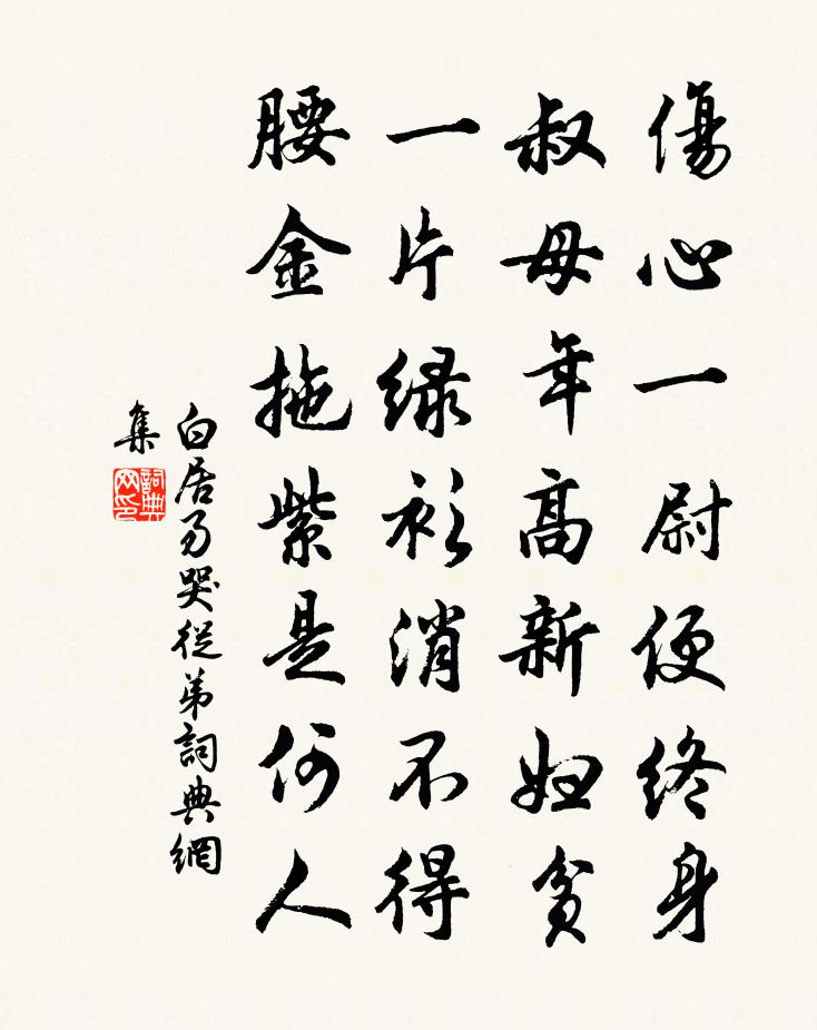 詩詞名句歷史字典書法欣賞書法字典國語詞典說文解字康熙字典古漢語字典標 題 作 者 詩 句 哭從弟作者:白居易 朝代:唐代哭從弟原文傷心一尉便終身,叔母年高新婦貧。一片綠衫消不得,腰金拖紫是何人?詩詞問答問:哭從弟的作者是誰?答:白居易問:哭從弟寫於哪個朝代?答:唐代問:哭從弟是什麼體裁?答:七絕問:白居易的名句有哪些?答:白居易名句大全白居易哭從弟書法欣賞哭從弟書法作品注釋全唐詩詩詞推薦律僧智遠〔唐代〕濾水與龕燈,長長護有情。自從青草出,便不下階行。北闕應無夢,南山舊有名。將何喻浮世,惟指浪漚輕。頌古三十九首釋道樞〔宋代〕放出金毛師子,百獸不見蹤由。要得爪牙全露,直須自把繩頭。次韻十詩棋會樓鑰〔宋代〕歸來鄉曲大家閒,同社仍欣取友端。無事銜杯何不可,有時會面亦良難。少曾環坐坐長滿,賴有主盟盟未寒。琴弈雜曲歌辭。伊川歌第二佚名〔唐代〕彤闈曉辟萬鞍回,玉輅春遊薄晚開。渭北清光搖草樹,州南嘉景入樓台。富陽道中柴望〔宋代〕幾年只向長安去,今日囊書被旨回。馬首獨行秋葉路,鱸魚時共菊花杯。黃昏鍾動雁初下,夜半月明潮正來。我自幽居雜興真山民〔宋代〕松桂小菟裘,山扉幽更幽。蜂王衙早晚,燕子社春秋。鬢禿難庶老,心寬不貯愁。年來把鋤手,無復揖公侯。答王學士林昉〔宋代〕已著山人屐,那能遠入城。艱難思變姓,老大畏爭名。病葉兼蟲響,閒雲肯雨行。長懷陶靖節,出處意分明。送黃仲秉侍郎出守鎮江李流謙〔宋代〕遙看北固海門秋,千騎東方占上頭,去國尚多憂國淚,送君那免別君愁。風遲宴閣清香凝,月滿兜零晚穟收。北府前仁和鄭大夫載酒攜文過我妙山逆旅中曾豐〔宋代〕過我跫然驚見君,無容膝處接殷勤。火乘雲氣不為崇,風挾水聲來解紛。酒榼自隨酣盛德,茶甌相繼醒新聞。黃扉旅次朔方 / 渡桑乾劉皂〔唐代〕客舍并州已十霜,歸心日夜憶鹹陽。無端更渡桑乾水,卻望并州是故鄉。甘州(為小玉梅賦,並柬韓竹閒)張炎〔宋代〕見梅花、斜倚竹籬邊。休道北枝寒。□□□翠袖,情隨眼盼,愁接眉彎。一串歌珠清潤,綰結玉連環。蘇小無尋處偈頌一百一十七首釋紹曇〔宋代〕書雲開管宴, * 食輪轉。覷之雙眼盲,味之唾三嚥。雲門胡餅,謾自誇張,楊岐栗蓬,急須收卷。露柱燈籠,春雲門即事林景熙〔宋代〕最愛林中過客稀,坐分片石澹忘歸。僧閒時與雲來往,鶴老不知城是非。瀟灑山光秋入畫,清寒花氣曉侵衣。一溪秋夕湖上葛紹體〔宋代〕荻花風裡桂花浮,恨竹生雲翠欲流。誰拂半湖新鏡面,飛來煙雨暮天愁。洞仙歌(八月十七日壽耕參夫人,時命羽士設醮)陳深〔宋代〕銀波湛碧,遙泛仙槎早。婺宿熒煌瑞雲曉。慶芳傳丹桂,歡動連枝,稱壽處,一簇蓬萊翠窈。步虛聲宛轉,清澈瑤奉陪侍中春日過武安君廟盧綸〔唐代〕長裾間貔虎,遺廟盛攀登。白羽三千騎,紅林一萬層。元臣達幽契,祝史告明徵。撫坐悲今古,瞻容感廢興。迴風詠露李正封〔唐代〕霏霏靈液重,雲表無聲落。沾樹急玄蟬,灑池棲皓鶴。流塵清遠陌,飛月澄高閣。宵潤玉堂簾,曙寒金井索。佳人橫吹曲辭出關魏徵〔唐代〕中原還逐鹿,投筆事戎軒。縱橫計不就,慷慨志猶存。策杖謁天子,驅馬出關門。請纓羈南越,憑軾下東藩。鬱紆隱居雜興楊公遠〔宋代〕老屋荒寒亦自清,柴門雖設只長扃。數行古隸閒居賦,半壁行書陋室銘。□□□□□□□,研硃滴露勘黃庭。此生從政和韻來謝復就答之陳深〔宋代〕牆東甘靜近,詩思妙通靈。堂有慈親替,門無冗客經。佳兒誦書史,深巷類郊坰。應解莊周學,全生不近刑。名句推薦晚年唯好靜,萬事不關心。王維《酬張少府》 發號施令,若汗出於體,一出而不復也。吳兢《貞觀政要·卷八·論赦令》 惶恐灘頭說惶恐,零丁洋里嘆零丁。文天祥《過零丁洋》 天無二日,人無二理。吳承恩《西遊記·第七十八回》 還背垂虹秋去,四橋煙雨,一宵歌酒。吳文英《瑞龍吟·送梅津》 春風不相識,何事入羅幃。李白《春思》 身無彩鳳雙飛翼,心有靈犀一點通。李商隱《無題·昨夜星辰昨夜風》 不見襄陽登覽,磨滅遊人無數,遺恨黯難收。陸游《水調歌頭·多景樓》 亂鴉三四點,愁坐話無憀。陳維崧《臨江仙·寒柳》 千里稻花應秀色,五更桐葉最佳音。曾幾《蘇秀道中》