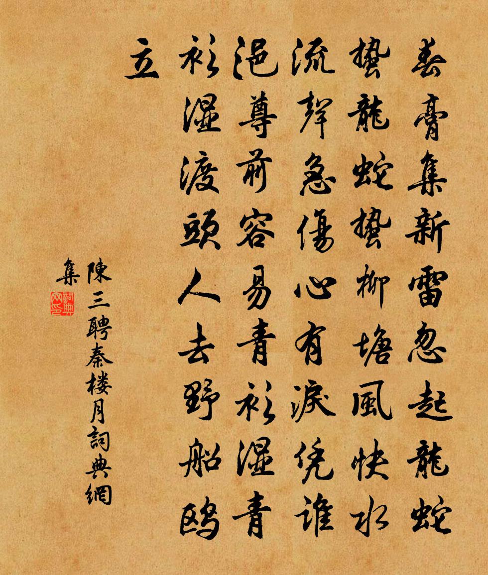 詩詞名句歷史字典書法欣賞書法字典國語詞典說文解字康熙字典古漢語字典標 題 作 者 詩 句 秦樓月作者:陳三聘 朝代:宋代秦樓月原文春膏集。新雷忽起龍蛇蟄。龍蛇蟄。柳塘風快,水流聲急。傷心有淚憑誰浥。尊前容易青衫濕。青衫濕。渡頭人去,野船鷗立。詩詞問答問:秦樓月的作者是誰?答:陳三聘問:秦樓月寫於哪個朝代?答:宋代陳三聘秦樓月書法欣賞秦樓月書法作品詩詞推薦安恭皇后輓詞樓鑰〔宋代〕天作周文合,褘褕禮可觀。屢陪金輦幸,幾奉玉卮歡。吳女簪新柰,梁房掩舊蘭。春深蠶事起,誰復上桑壇。尋僧翁卷〔宋代〕秋淨日暉暉,間行風滿衣。尋僧雖不遇,折得菊花歸。時宣義輓詞秦觀〔宋代〕奮發多難里,哀榮後夜中。妙年推正行,末路見陰功。風雨雙龍合,山川弔鶴空。懸知青史上,又載一於公。題歸夢李賀〔唐代〕長安風雨夜,書客夢昌谷。怡怡中堂笑,小弟栽澗綠。家門厚重意,望我飽飢腹。勞勞一寸心,燈花照魚目。禽言十詠著新脫故姚勉〔宋代〕繰車欲動蠶春暮,水足秧青行白鷺。著新脫故山禽呼,也似催人闊耕布。著新脫故也自奇,闊耕闊布也自宜。冬苗寄靜佳朱明府釋斯植〔宋代〕傷心獨立舊池台,日日西風送雨來。別後思君無限事,一封書發兩番開。乍晴徐集孫〔宋代〕吟情天遠倚闌乾,聲歇鳴渠雨乍乾。只為湖山居宦舍,卻因筍蕨憶家餐。燕窠出子春遊懶,燈燼開花夜話殘。收拾寄袁守廖獻卿黃庭堅〔宋代〕公移猥甚業生筍,訟牒紛如蜜分窠。少得曲肱成夢蝶,不堪衙吏報鳴鼉。已荒里社田園了,可奈春風桃李何。想見送祥上人之道場釋心月〔宋代〕虎錫高騰上虎岩,虎岩老虎氣耽耽。袖藏濟北爺兒手,不捋其須心不甘。千里不來釋重顯〔宋代〕不見古君子,因循又隔秋。浮生多自擲,好事更誰留。碧巘高沉月,寒雲靜鎖樓。宗雷何處是,白鳥下汀洲。初八日早出洪澤閘泛淮虞儔〔宋代〕乾道年中再講和,當時議者厭干戈。長淮不管蛟龍怒,巨艦寧容鵝鸛過。歲晚民方愁道路,天寒我亦困風波。中流熙寧蜡祭十三首佚名〔宋代〕嘉薦芳美,靈萊宴娭。斿車結雲,若風馬馭。既至而喜,錫我蕃禧。嘉承天貺,曼壽無期。彥定知縣府判池有雙蓮置酒其上坐客有詩姑三李彌遜〔宋代〕傾國從來少並芳,人間那得兩巫陽。丹青不解傳真態,恐是菱花對晚妝。聽雪黃庚〔宋代〕撲簌敲窗紙,寒齊剡水濱。六花初落夜,孤枕未眠人。耳靜聲逾細。心清趣自真。愛梅情更苦,恐壓一枝春。次韻楊廷秀郎中游西湖十絕喻良能〔宋代〕裴園亭榭水之濱,草樹雲煙滿目橫。盡日對山仍把酒,茲游絕勝若耶行。紹興庚辰余游謝康樂石門與老洪道士痛飲賦詩陸游〔宋代〕二十餘年別石門,燈前感舊欲消魂。人生萬事皆如夢,自笑區區記劍痕。春日即事俞桂〔宋代〕羲馭舒徐日正遲,園林已覺杏花稀。半晴半雨春無準,燕怯輕寒不耐飛。次龍山韻馬廷鸞〔宋代〕新來霄漢冥鴻客,舊日風雲振驚行。脫下戲衫優便散,驚回客枕夢何長。莫將吳蜀分岐路,政把乾坤作醉鄉。惟有浣溪沙歐陽修〔宋代〕青杏園林著酒香。佳人初著薄羅裳。柳絲搖曳燕飛忙。乍雨乍晴花自落,閒愁閒悶晝偏長。為誰消瘦損容光。龜山寺張舜民〔宋代〕白塔搖搖波浪間,幾多舟楫望禪關。天邊幡影因心動,堂上潮音到海還。我拔一毛猶自苦,師除雙臂信如閒。中流名句推薦仁者愛萬物而智者備禍於未形,不仁不智,何以為國?司馬遷《史記·趙世家》 玉勒雕鞍遊冶處,樓高不見章台路。歐陽修《蝶戀花·庭院深深深幾許》 甘井近竭,招木近伐。墨子《墨子·01章 親士》 月有盈虧花有開謝,想人生最苦離別。張鳴善《普天樂·詠世》 五月天山雪,無花只有寒。李白《塞下曲六首·其一》 盡做舊愁都忘卻,新愁何處著王庭筠《謁金門·雙喜鵲》 莫驚鷗鷺,四橋儘是,老子經行處。蘇軾《青玉案·送伯固歸吳中》 昭昭若日月之明,離離如星辰之行劉勰《文心雕龍·宗經》 此地別燕丹,壯士發衝冠。駱賓王《於易水送人 / 於易水送別》 落日照大旗,馬鳴風蕭蕭。杜甫《後出塞五首》