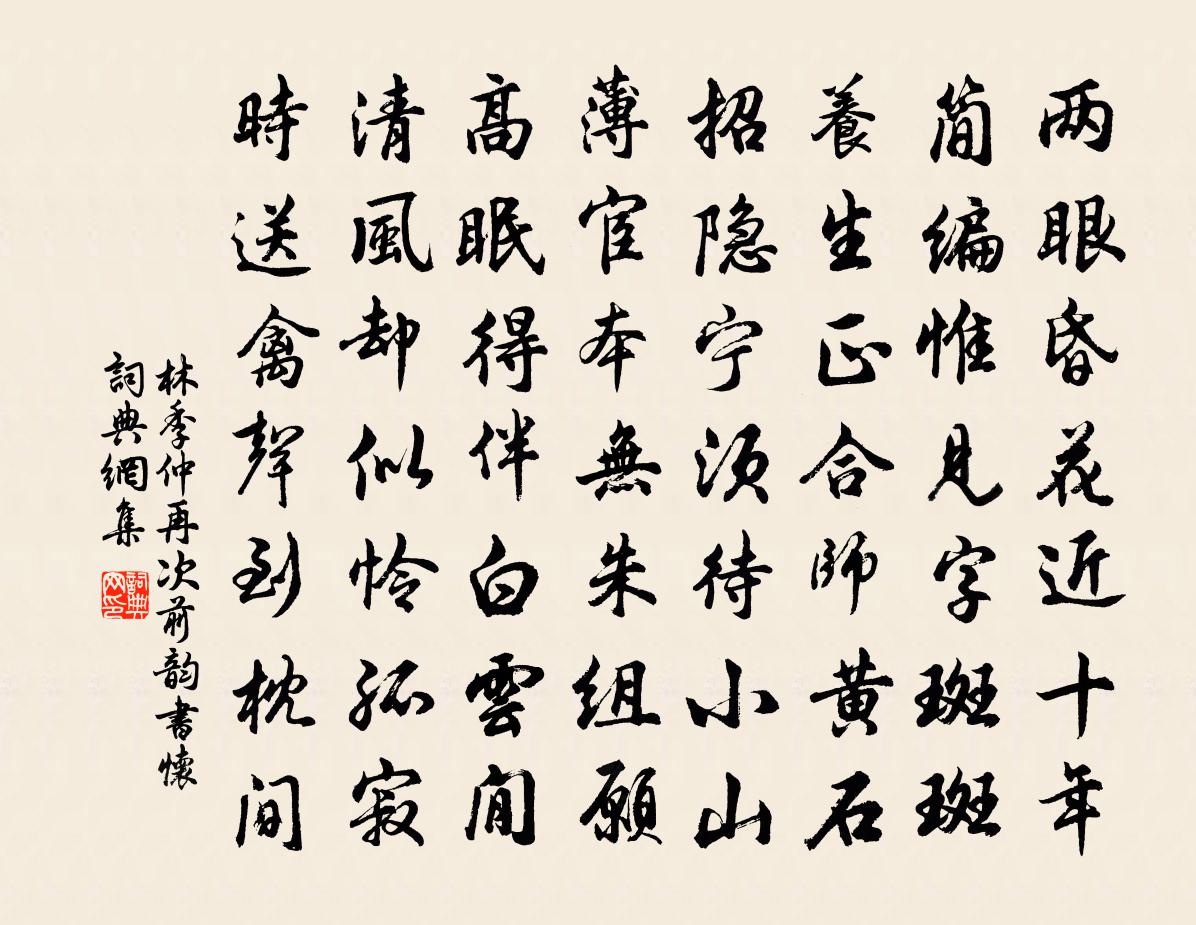 詩詞名句歷史字典書法欣賞書法字典國語詞典說文解字康熙字典古漢語字典標 題 作 者 詩 句 再次前韻書懷作者:林季仲 朝代:宋代再次前韻書懷原文兩眼昏花近十年,簡編惟見字斑斑。養生正合師黃石,招隱寧須待小山。薄宦本無朱組願,高眠得伴白雲閒。清風卻似憐孤寂,時送禽聲到枕間。詩詞問答問:再次前韻書懷的作者是誰?答:林季仲問:再次前韻書懷寫於哪個朝代?答:宋代林季仲再次前韻書懷書法欣賞再次前韻書懷書法作品詩詞推薦別李仁甫白玉蟾〔宋代〕君向星江結草廬,我來抵掌笑相於。三盃碧液漲甆盞,一縷青煙纏竹爐。劍舞春風花爛熳,琴彈夜雨竹蕭疎。明朝疏慵葛立方〔宋代〕閒處著疏慵,鮮鮮幽桂叢。讀書聊灶北,避世且牆東。市駿卑蘇代,求徵謝子公。丹心阻閶闔,欲付小心風。禪人並化主寫真求贊釋正覺〔宋代〕只是個人,到處分身。萬水中間月,百華頭上春。不外一法,不受諸塵。生處熟也疏處親,默時說也靜時神。缽盂送張如京知安肅軍歐陽修〔宋代〕相逢舊從事,新命忽臨戎。界上山河壯,軍中鼓角雄。朔風馳駿馬,寒雪射驚鴻。試取封侯印,何如筆硯功。題靈鷲四首湯漢〔宋代〕靈鷲古道場,攝乎大國間。一日忽翬飛,四雇無靦顏。過中岩渡月出峨眉山程公許〔宋代〕返照中岩流,峨眉分外清。一彎新吐月,共我兩忘形。露下沙逾白,宵寒酒易醒。荻花風索索,擁被不堪聽。浴蠶沙溪水一首為上饒陳烈婦作戴表元〔宋代〕浴蠶沙溪水,採桑玉山巔。絲成白稜稜,膠作烈婦弦。烈婦何所言,弦中意 * 。一說鸞影孤,二訴雛巢穿。巢穿華亭百詠石幢許尚〔宋代〕矻立應千載,傳因海眼居。蓬萊水清淺,曾不見敧傾。王君行丈輓詩項安世〔宋代〕樂叟干將劍,鋒鋩凜不收。之人獨和厚,與世極沉浮。淑氣長三月,高懷自九秋。洞門元不鎖,依舊少從游。山居七詠丹桂軒方岳〔宋代〕何年進入玉華宮,香到君王紫禁楓。月府歸來衫袖冷,蟾蜍滴露洗秋紅。送李右丞分司羅隱〔唐代〕分漕得洛川,讜議更昭然。在省曾批敕,中台肯避權。所悲時漸薄,共賀道由全。賣與清平代,相兼直幾錢。蝶戀花佚名〔宋代〕索再三終不可見。雖待張之意甚厚,然未嘗以詞繼之。異時,獨夜操琴,愁弄忄妻惻。張竊聽之,求之,則不復鼓複次前韻四首呈二袁君並王君申祿方回〔宋代〕良辰古難得,歌吹遏行雲。豪意牛心割,清言獺膽分。予慚四皓老,公勝七賢醺。苦雨忽三日,垢衣生蘇文。春雨薛能〔唐代〕電闊照潺潺,驚流往復還。遠聲如有洞,迷色似無山。利物乾坤內,並風竹樹間。靜思來朔漠,愁望滿柴關。迸濕送蜀僧周賀〔唐代〕萬里獨行無弟子,惟齎筇竹與檀龕。看經更向吳中老,應是山川似劍南。送徐靈淵永州司量翁卷〔宋代〕君向零陵日,分攜又雪天。地遙行幾郡,官小度三年。蘭芷芳條潔,瀟湘翠色連。從來苦吟思,歸賦若多篇。雜興又此身漂蕩等流槎,陸游〔宋代〕陋巷無心長草萊,柴門偶自不曾開。余齡漸迫諸孫長,徂歲將窮積雪來。旦欲燎衣無宿燼,暮思赬頰但空罍。孰知池邊李商隱〔唐代〕玉管葭灰細細吹,流鶯上下燕參差。日西千繞池邊樹,憶把枯條撼雪時。滿庭芳(代鄉老眾賓報勸)史浩〔宋代〕玉闕朝回,沙堤煙曉,碧幢光動軍容。虎符熊軾,行指七閩中。假道吾鄉我里,揮金事、思躡前蹤。傾懷處,螢窗登山卻立府視一村風物殊可人意二絕陳文蔚〔宋代〕桑柘陰中日日行,只聞犬吠與雞鳴。此時身在煙雲上,眼界不知如許明。名句推薦秋風別蘇武,寒水送荊軻。庾信《擬詠懷二十七首·其二十六》 繡袂捧琴兮,登君子堂。貫休《善哉行·傷古曲無知音》 小時不識月,呼作白玉盤。李白《古朗月行》 大者不能,小者不為,是棄國捐身之道也。荀子《荀子·大略》 強本而節用,則天不能貧。荀子《荀子·天論》 一生傲岸苦不諧,恩疏媒勞志多乖。李白《答王十二寒夜獨酌有懷》 畫地為牢勢不入,削木為吏議不對班固《漢書·傳·司馬遷傳》 為高必因丘陵,為下必因川澤。孟子《孟子·離婁章句上·第一節》 東望鞭芙縹緲,寒光如注。劉辰翁《桂枝香· * 人去》 柳條將舒未舒,柔梢披風,麥田淺鬣寸許。袁宏道《滿井遊記》