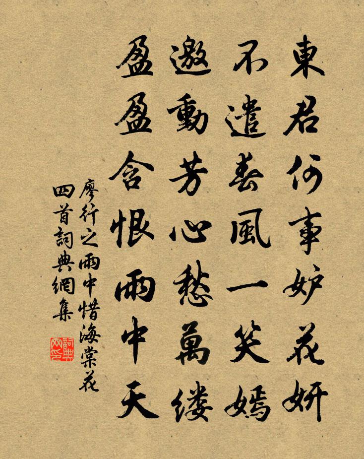 詩詞名句歷史字典書法欣賞書法字典國語詞典說文解字康熙字典古漢語字典標 題 作 者 詩 句 雨中惜海棠花四首作者:廖行之 朝代:宋代雨中惜海棠花四首原文東君何事妒花妍,不遣春風一笑嫣。邀動芳心愁萬縷,盈盈含恨雨中天。詩詞問答問:雨中惜海棠花四首的作者是誰?答:廖行之問:雨中惜海棠花四首寫於哪個朝代?答:宋代廖行之雨中惜海棠花四首書法欣賞雨中惜海棠花四首書法作品詩詞推薦鵲橋仙朱彝尊〔清代〕青鸞有翼,飛鴻無數,訊息何曾輕到。瑤琴塵滿十三徽,止記得,思歸一調。此時便去,梁間燕子,定笑畫眉人老元夕獨坐王柏〔宋代〕頗聞燈火鬧熒熒,何似書窗一點青。尚喜今年民意樂,一般簫鼓兩般聽。富春龍門楊簡〔宋代〕桑麻迤邐入高原,級級差差水落田。樹色自分深淺綠,山光都在淡濃煙。竹輿漸近鐘鳴處,詩句來從鳥語邊。又是再別鄭叔友兼寄方次雲黃公度〔宋代〕鞍馬侵三伏,萍蓬寄一身。及秋歸計早,到日附書頻。炎嶺休長客,清漳有故人。過逢如問信,為道各埃塵。和楊民瞻韻辛棄疾〔宋代〕拄杖閒題祖印來,壁間有句試參懷。從來歌舞新羅襪,不識溪山舊草鞋。紹興朝會十三首佚名〔宋代〕帝德誕敷,銷燁群惹。近悅近來,惟聖時克。玉振金聲,治功興起。韶箾象之,盡善盡美。賀新郎盧祖皋〔宋代〕春色元無主。荷東君、著意看承,等閒分付。多少無情風與浪,又那更、蝶欺蜂妒。算燕雀、眼前無數。從便簾櫳遣興陸游〔宋代〕療飢惟恃粥,動步已須人。欲午猶支枕,經旬不過鄰。鵲棲寒自穩,鷗沒遠難馴。莫笑謀身拙,黃冠學季真。鴛鴦湖棹歌 之二十五朱彝尊〔清代〕學繡女兒行水潯,遙看三塔小如針。並頭菡萏雙飛翼,記取挑絲色淺深。玉華山張峋〔宋代〕玉華山誰窮遠近,百里迴旋勢方盡。削成蒼玉倚青天,氣象軒軒獨奇俊。黃河哮顑摧崑崙,一峰飄落如龍蹲。白雲詩二首崔鶠〔宋代〕記得詩狂欲發時,鄱陽湖裡月明知。無人為覓桓伊笛,自卷秋蘆片葉吹。次洪監簿惠詩韻五首姜特立〔宋代〕新詩三復用功深,始信今人有古心。斗葉儷花兒輩事,唱高廟瑟有遺音。東西家陸游〔宋代〕東家雲出岫,西家籠半山;西家泉落澗,東家鳴佩環。相對籬數掩,各有茆三間。芹羹與麥飯,日不廢往還,兒女偈頌二十一首釋堅璧〔宋代〕玉象吞獅子,泥牛上繡鞍。御樓觀射獵,不是刈茆田。古別意寇準〔宋代〕水螢光淡曉色寒,庭除索寞星河殘。清樽酒盡艷歌闋,離人慾去肝腸絕。露荷香散西風驚,徵車漸遠聞雞鳴。深閨王持中讀余近詩跋以五絕因次其韻吳則禮〔宋代〕吾句如許一生過,君詩政應萬人傳。但言寒溫置余語,可是從來子敬賢。鄧州西軒書事十首陳與義〔宋代〕詔書憂民十六事,父老祝君一萬年。白髮書生喜無寐,從今不仕可歸田。採桑子晏幾道〔宋代〕前歡幾處笙歌地,長負登臨。月幌風襟,猶憶西樓著意深。鶯花見盡當時事,應笑如今。一寸愁心,日日寒蟬夜夜寄於秘丞釋重顯〔宋代〕石徑通岩竇,引步藏欹側。蓬萊人不來,掃盡蒼苔色。長相思佚名〔宋代〕瀟灑江梅春早處,天然一種兩般奇。開花結子,何事恰同時。昨夜北枝開雪裡,朝來青子又南枝。這般好事,消得名句推薦閒坐悲君亦自悲,百年多是幾多時。元稹《遣悲懷三首·其三》 看萬山紅遍,層林盡染;漫江碧透,百舸爭流。 * 《沁園春·長沙》 蓮渚收香,蘭皋浮爽,涼思頓欺班扇。王月山《齊天樂·夜來疏雨鳴金井》 危樓高百尺,手可摘星辰。李白《夜宿山寺》 出政施教,賞善罰暴。墨子《墨子·37章 非命(下)》 去年射虎南山秋,夜歸急雪滿貂裘。陸游《三月十七日夜醉中作》 小男供餌婦搓絲,溢榼香醪倒接罹。李郢《南池》 山中一夜雨,樹杪百重泉。王維《送梓州李使君》 城上高樓接大荒,海天愁思正茫茫。柳宗元《登柳州城樓寄漳汀封連四州》 荷葉生時春恨生,荷葉枯時秋恨成。李商隱《暮秋獨游曲江》