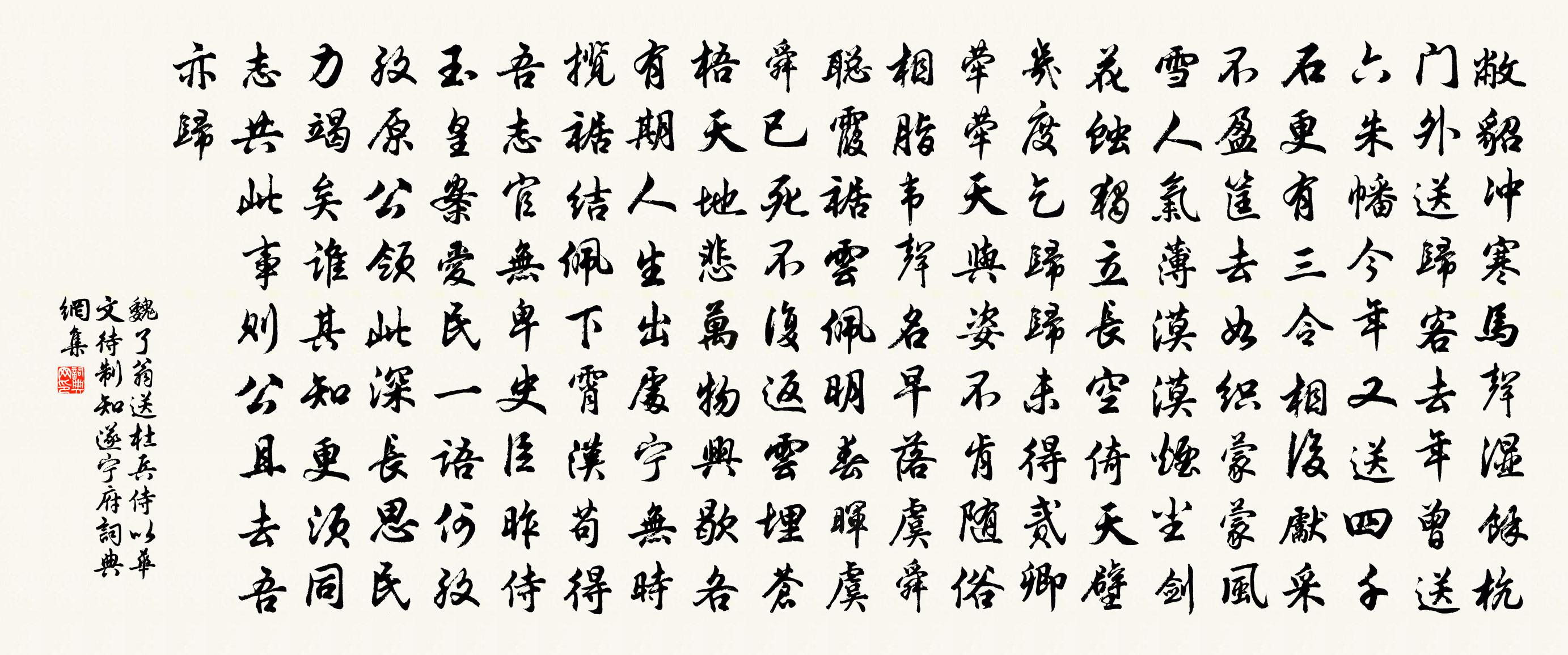 詩詞名句歷史字典書法欣賞書法字典國語詞典說文解字康熙字典古漢語字典標 題 作 者 詩 句 送杜兵侍以華文待制知遂寧府作者:魏了翁 朝代:宋代原文敝貂沖寒馬聲濕,餘杭門外送歸客。去年曾送六朱幡,今年又送四千石。更有三令相後先,采不盈筐去如織。蒙蒙風雪人氣薄,漠漠煙塵劍花蝕。獨立長空倚天壁,幾度乞歸歸未得。貳卿犖犖天與姿,不肯隨俗相脂韋。聲名早落虞舜聰,霞裾雲佩明春暉。虞舜已死不復返,雲埋蒼梧天地悲。萬物興歇各有期,人生出處寧無時。攬裾結佩下霄漢,苟得吾志官無卑。史臣昨侍玉皇案,愛民一語何孜孜。原公領此深長思,民力竭矣誰其知。更須同志共此事,則公且去吾亦歸。詩詞問答問:《送杜兵侍以華文待制知遂寧府》的作者是誰?答:魏了翁問:該詩寫於哪個朝代?答:宋代書法欣賞送杜兵侍以華文待制知遂寧府書法作品詩詞推薦次鄭府判金字韻杜范〔宋代〕巇嶇來北固,邂逅識南金。未覺人間役,欣同物外心。燈花殘也半,桂子落秋深。細聽朱弦曲,寥寥大雅音。蝶戀花 送祐之弟辛棄疾〔宋代〕衰草殘陽三萬頃。不算飄零,天外孤鴻影。幾許淒涼須痛飲。行人自向江頭醒。會少離多看兩鬢。萬縷千絲,何況瑞鶴仙(戊申初度自韻)李曾伯〔宋代〕百年過半也。悵壯心零落,鬢星星也。風兒漸涼也。近中秋月兒,又初生也。田園暇也。矍鑠哉、是翁也。記當時舍北搖落景物殊佳偶作陸游〔宋代〕草徑人稀到,柴扉手自開。林疏鴉小泊,溪淺鷺頻來。檐角除瓜蔓,牆隅斸芋魁。東鄰膰肉至,一笑舉新醅。念奴嬌 勞勞亭鄭燮〔清代〕勞勞亭畔,被西風一吹,逼成衰柳。如線如絲無限恨,和風和煙。江上征帆,尊前別淚,眼底多情友。寸言不盡,送李安赴舉魏野〔宋代〕野客復何陳,賢侯首薦人。俗流寧肯餞,良璞不嫌貧。棠樹離偏曉,函關過已頻。花時好訊息,佇聽向溪濱。七月七日同宋顯夫學士暨經筵僚屬游上京西山周伯琦〔元代〕聯岡疊阜衛神都,萬幕平沙八陣圖。朝市星垣周社稷,宗藩盤石漢規摹。官堤亘野豐青草,禁篽深林暗碧榆。地辟夜行船(京口南園)黃機〔宋代〕紅濺羅裙三月二。露桃開、柳眠又起。百尺遊絲,罥鶯留燕,判與南園一醉。歷歷斜陽明野水。倚危闌、暮雲千里祭九鼎十二首真宗〔宋代〕工祝致辭,黃流協鬯。爰登清歌,載期神享。噫予誠心,精社是虔。嘉予陳祀,豈盈豆籩。和知郡史監丞鹿鳴宴詩方岳〔宋代〕文物聲明極盛秋,傅岩人不待形求。筆扛龍鼎雄豪在,手拔鯨牙汗漫遊。溫飽定知非雅意,治安誰與借前籌。老予重陽復晴再次前韻項安世〔宋代〕一天雲物護輕寒,陣陣清風約雨乾。造物有情聊作戲,詩家無賴強尋歡。吾人已辦泥沾帽,曉色還教日照盤。咫尺水堂送諸文士戲贈潘丞聯句顏真卿〔唐代〕居人未可散,上客須留著。莫唱阿嚲回,應雲夜半樂。 ——顏真卿詩教刻燭賦,酒任連盤酌。從他白眼看,終戀歲莫二首蘇轍〔宋代〕文章習氣消未盡,般若初心老漸明。粗有春秋傳舊學,終憑止觀定無生。維摩晚亦諧生事,彌勒初猶重世名。鬚髮漁家傲(朱晦翁示歐公鼓子詞戲作一首)黃銖〔宋代〕永日離憂千萬緒。雪舟遠泛清漳浦。珍重故人寒夜語。揮玉麈。沈沈畫閣凝香霧。風砌落花留不住。紅蜂翠蝶閒飛減字木蘭花(庚申七夕)蔡伸〔宋代〕金風玉露。喜鵲橋成牛女渡。天宇沈沈。一夕佳期兩意深。瓊簽報曙。忍使飈輪容易去。明日如今。想見君心似我早發斜溝道中寄王有元賀鑄〔宋代〕處處春林有鳥啼,恨無芳酒一樽攜。何緣復得彭城夢,日日東風送我西。神君歌陸游〔宋代〕泰山可為礪,東海可揚塵。惟有壯士志,死生要一伸。我夢神君自天下,威儀奕奕難具陳。飛龍駕車不用馬,訶前題徐氏聚秀樓楊公遠〔宋代〕輪奐危危百尺樓,闌乾徙倚豁雙眸。插天萬仞黃山聳,繞郭千尋練水流。風月不消錢可買,主賓須要味相投。四時情詩其十三倉央嘉措〔清代〕明眸皓齒艷無雙,比擬圓月兩相仿。惆悵嬋娟多寂寞,歡情只供一夜長。陳君舉飯余倉司之五峰閣移坐臨檐口占舉似曾豐〔宋代〕傑閣崢嶸著樹間,門從好色未嘗關。檐前珠箔開平遠,坐上清尊答燕閒。能卷塵心三曲水,欲迷客眼九嶷山。主人名句推薦美人贈我錦繡段,何以報之青玉案。張衡《四愁詩》 喜怒無蹤,慎思及遠,人所難圖焉。來俊臣《羅織經·固榮卷第六》 風引龍虎旗,歌鐘昔追攀。李白《登邯鄲洪波台置酒觀發兵》 天子臨軒賜侯印,將軍佩出明光宮。王維《少年行四首》 不見襄陽登覽,磨滅遊人無數,遺恨黯難收。陸游《水調歌頭·多景樓》 夫有尤物,足以移人左丘明《左傳·昭公·昭公二十八年》 不經一事,不長一智。佚名《增廣賢文·下集》 江雨霏霏江草齊,六朝如夢鳥空啼。韋莊《台城》 只有一枝梧葉,不知多少秋聲。張炎《清平樂·候蛩淒斷》 弱齡寄事外,委懷在琴書。陶淵明《始作鎮軍參軍經曲阿作》