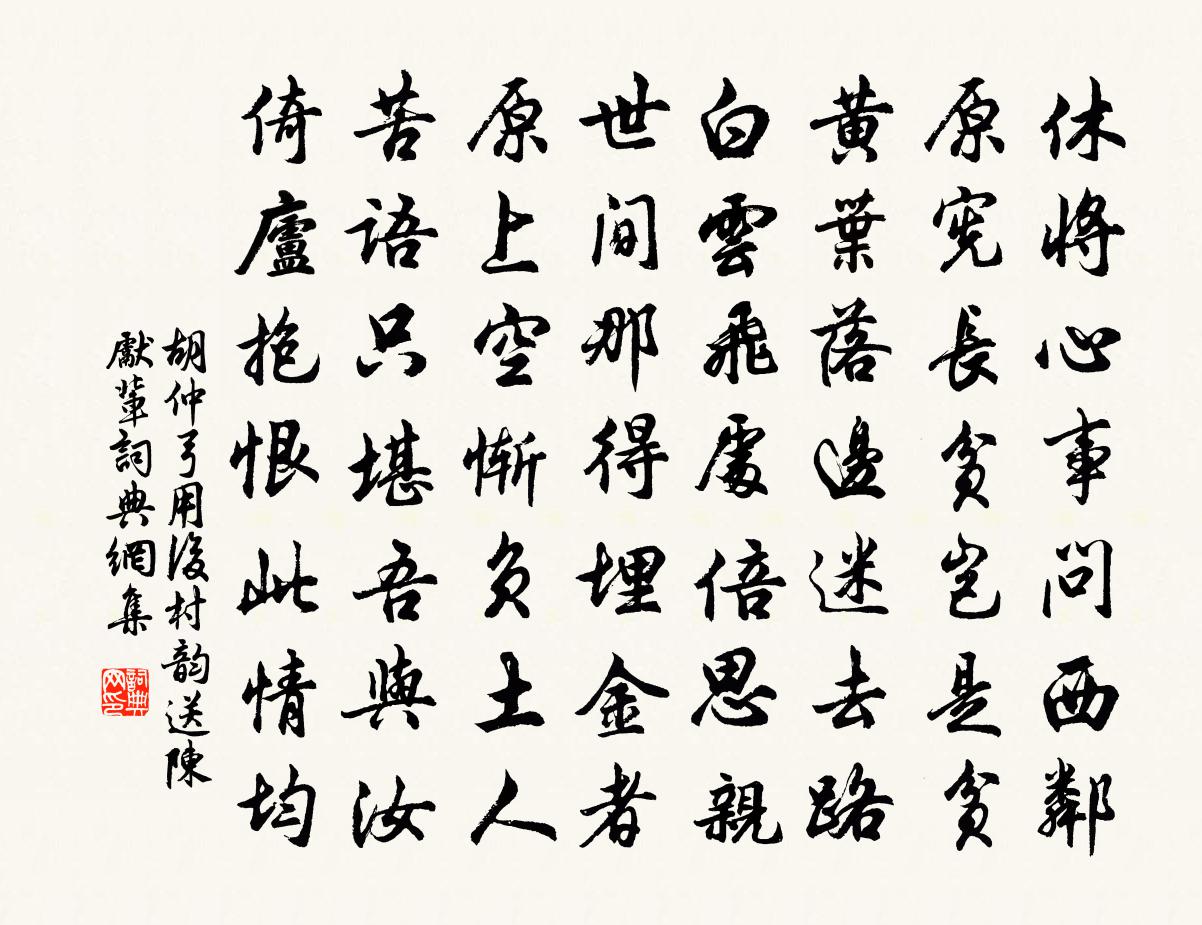 詩詞名句歷史字典書法欣賞書法字典國語詞典說文解字康熙字典古漢語字典標 題 作 者 詩 句 用後村韻送陳先輩作者:胡仲弓 朝代:宋代用後村韻送陳先輩原文休將心事問西鄰,原憲長貧豈是貧。黃葉落邊迷去路,白雲飛處倍思親。世間那得埋金者,原上空慚負土人。苦語只堪吾與汝,倚廬抱恨此情均。詩詞問答問:用後村韻送陳先輩的作者是誰?答:胡仲弓問:用後村韻送陳先輩寫於哪個朝代?答:宋代胡仲弓用後村韻送陳先輩書法欣賞用後村韻送陳先輩書法作品詩詞推薦送張持國省乾歸山陰三首仲並〔宋代〕稠眾相從地,無言意已傾。余方厭藜藿,子肯扣柴荊。短棹起歸暮,長亭如別情。回頭聽羌管,拍拍喚愁生。始作燕子巾梅堯臣〔宋代〕裹髻不裹額,自名燕子巾。翼覆尾涏涏,誰問巢由人。烈文佚名〔先秦〕烈文辟公,錫茲祉福。惠我無疆,子孫保之。無封靡於爾邦,維王其崇之。念茲戎功,繼序其皇之。無競維人,四贈朱子文因寄朱元剛二絕戴栩〔宋代〕故人墓木半藤蘿,兒侄東西雁一莎。絕喜阿連新筆長,契君風鑒愛渠多。王夫人輓詞郭印〔宋代〕吁嗟蘭德已雲翩,空見佳城在九原。無祿久虛南澗藻,有姑誰慰北堂萱。苦荼獨御安天命,曒日同歸信誓言。諸子次韻歐陽良有高山仰止四首趙文〔宋代〕新詩日以多,古意日以往。我欲求玄珠,未易覓象罔。中道良獨難,執玉迷俯仰。索居無誰語,掩捲起遐想。當求勸耕至赤松山韓元吉〔宋代〕謬誤君恩再領州,名山猶幸復春遊。苦無羽客追元放,尚有群兒識細侯。麥穗雨晴迷野岸,桃花風急滿溪流。隔林酒香亭向阮賢〔清代〕漢武好神仙,為覓長生酒。方朔妙詼諧,早潤滑稽口。至今湖上亭,酒香渺何有?送李仁甫運判赴召三首李流謙〔宋代〕嵩貸國之鎮,鳳麟天所生。有人占寶氣,無耳著修名。斯道自神聖,爾曹聊重輕。晉書定一付,一代聽權衡。周大祫歌 昭夏庾信〔南北朝〕律在夾鍾。服居蒼袞。杳杳清思。綿綿長遠。就祭於合。班神於本。來庭有序。助祭有章。樂舞六代。賓歌二王。雜興顧逢〔宋代〕檐雀啾啾無歇時,幾回銜食餒雛歸。羽毛長得完全後,子母東西各自飛。寄廣東提乾田子真曾豐〔宋代〕初悔投身落海涯,擁車猶幸襲蹤來。畏途機械鹿{左豸右區}虎,晏歲風霜松竹梅。分首二年眉慣郁,舉頭千里眼贈王典史五首熊禾〔宋代〕我愛熙然翁,識暢度亦夷。飾政必以儒,公餘只吟詩。利慾膠盆中,三嘆斯人希。安得公伯輩,萬宇陽春熙。貞女墓邵謁〔唐代〕生持節操心,死作堅貞鬼。至今墳上春,草木無花卉。夜闌白玉蟾〔宋代〕試問今宵月,今夕何爽約。遂令山中人,倚戶守寂寞。上界足官府,天門有關鑰。雲鎖烏鵲橋,風把鳳凰閣。蟾吞奉和御製讀五代漢史夏竦〔宋代〕求益誠賢牧,廉平致樂康。歡謠騰近輔,盛典茂徽章。舊相親褒記,黎民競盛傷。豐碑應不朽,千載詠惟良。巫峽曹松〔唐代〕巫山蒼翠峽通津,下有仙宮楚女真。不逐彩雲歸碧落,卻為暮雨撲行人。年年舊事音容在,日日誰家夢想頻。應是題劉文簡所藏墨梅卷劉宰〔宋代〕煙雨和成宛擅場,新來翻著雪衣裳。以吾不可學渠可,善學楊君祗此郎。頌古十七首釋大觀〔宋代〕江面無風平似鏡,轉頭變態互呈新。馮夷駕浪險難涉,漁父操舟妙若神。送劉學錄之建陽陳宓〔宋代〕寶劍韜藏久未伸,天生南浦一文人。好將玉匣呈岩電,洗出寒光萬丈新。名句推薦昔時人已沒,今日水猶寒。駱賓王《於易水送人 / 於易水送別》 而浮生若夢,為歡幾何?李白《春夜宴桃李園序 / 春夜宴從弟桃花園序》 福輕乎羽,莫之知載;禍重乎地,莫之知避。莊子《莊子·內篇·人間世》 雲山有意,軒裳無計,被西風吹斷功名淚劉致《山坡羊·燕城述懷》 傷情處,高城望斷,燈火已黃昏。秦觀《滿庭芳·山抹微雲》 先淡後濃,先疏後親,先遠後近,交友道也。陳繼儒《小窗幽記·集醒篇》 嘆隙中駒,石中火,夢中身。蘇軾《行香子·述懷》 恨鐵不成鋼曹雪芹《紅樓夢·第九十六回》 上有愁思婦,悲嘆有餘哀。曹植《明月上高樓》 善欲人見,不是真善;惡恐人知,便是大惡。朱柏廬《朱子家訓·全文》