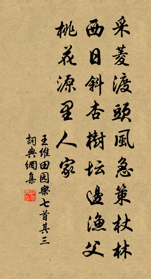 詩詞名句歷史字典書法欣賞書法字典國語詞典說文解字康熙字典古漢語字典標 題 作 者 詩 句 田園樂七首·其三作者:王維 朝代:唐代田園樂七首·其三原文采菱渡頭風急,策杖林西日斜。杏樹壇邊漁父,桃花源里人家。詩詞問答問:田園樂七首·其三的作者是誰?答:王維問:田園樂七首·其三寫於哪個朝代?答:唐代問:王維的名句有哪些?答:王維名句大全王維田園樂七首·其三書法欣賞田園樂七首·其三書法作品譯文和注釋譯文采菱泛舟體驗渡頭疾風正吹,拄著拐杖到樹林西面看夕陽西斜。我就是那杏樹壇邊的漁父,也就是住在桃花源里的人家。注釋菱:一年生水生草本植物,葉子略呈三角形,葉柄有氣囊,夏天開花,白色。果實有硬殼,有角,可供食用。策杖:拄著棍杖。桃花源:用晉陶淵明《桃花源記》典故。標籤:田園,生活詩詞推薦山行項斯〔唐代〕青櫪林深亦有人,一渠流水數家分。山當日午回峰影,草帶泥痕過鹿群。蒸茗氣從茅捨出,繰絲聲隔竹籬聞。行逢田園樂七首·其六 / 閒居王維〔唐代〕桃紅復含宿雨,柳綠更帶朝煙。花落家童未掃,鶯啼山客猶眠。美人賦司馬相如〔兩漢〕 司馬相如,美麗閒都,游於梁王,梁王悅之。鄒陽譖之於王曰:“相如美則美矣,然服色容冶,妖麗不忠,將雁兒落兼得勝令張養浩〔元代〕往常時為功名惹是非,如今對山水忘名利;往常時趁雞聲赴早朝,如今近晌午猶然睡。往常時秉笏立丹墀,如今把山坡羊·江山如畫陳草庵〔元代〕江山如畫,茅檐低廈,婦蠶繅婢織紅奴耕稼。務桑麻,捕魚蝦。漁樵見了無別話,三國鼎分牛繼馬。興,休羨他。寄宿田家高適〔唐代〕田家老翁住東陂,說道平生隱在茲。鬢白未曾記日月,山青每到識春時。門前種柳深成巷,野谷流泉添入池。牛壯乾元中寓居同谷縣,作歌七首杜甫〔唐代〕有客有客字子美,白頭亂髮垂過耳。歲拾橡栗隨狙公,天寒日暮山谷里。中原無書歸不得,手腳凍皴皮肉死。嗚呼嬌女詩左思〔魏晉〕吾家有嬌女,皎皎頗白皙。小字為紈素,口齒自清歷。鬢髮覆廣額,雙耳似連璧。明朝弄梳台,黛眉類掃跡。濃朱殿前歡·暢幽哉貫雲石〔元代〕暢幽哉,春風無處不樓台。一時懷抱俱無奈,總對天開。就淵明歸去來,怕鶴怨山禽怪,問甚功名在?酸齋是我,東郊韋應物〔唐代〕吏舍跼終年,出郊曠清曙。楊柳散和風,青山澹吾慮。依叢適自憩,緣澗還復去。微雨靄芳原,春鳩鳴何處。樂幽山中四詠佚名〔明代〕我愛山中春,蒼崖鳥一聲。桃花源里住,罕見問津人。我愛山中夏,空冥花雨下。行吟屐齒肥,樹色麗四野。我愛題鄰居於鵠〔唐代〕僻巷鄰家少,茅檐喜並居。蒸梨常共灶,澆薤亦同渠。傳屐朝尋藥,分燈夜讀書。雖然在城市,還得似樵漁。蝶戀花·春漲一篙添水面范成大〔宋代〕春漲一篙添水面。芳草鵝兒,綠滿微風岸。畫舫夷猶灣百轉。橫塘塔近依前遠。江國多寒農事晚。村北村南,穀雨輕薄篇張華〔魏晉〕末世多輕薄,驕代好浮華。志意既放逸,貲財亦豐奢。被服極纖麗,餚膳盡柔嘉。僮僕余粱肉,婢妾蹈綾羅。文軒塞下曲六首·其一李白〔唐代〕五月天山雪,無花只有寒。笛中聞折柳,春色未曾看。曉戰隨金鼓,宵眠抱玉鞍。願將腰下劍,直為斬樓蘭。雲居山詠二首常慧〔明代〕半肩風雨半肩柴,竹杖芒鞋破碧崖。剛出嶺頭三五步,渾身都被亂雲埋。經行仿佛近諸天,月上山銜半缺圓。聽得即事王安石〔宋代〕徑暖草如積,山晴花更繁。縱橫一川水,高下數家村。靜憩雞鳴午,荒尋犬吠昏。歸來向人說,疑是武陵源。田園樂七首(一作輞川六言,第六首一作皇甫曾詩)王維〔唐代〕厭見千門萬戶,經過北里南鄰。官府鳴珂有底,崆峒散發何人。再見封侯萬戶,立談賜璧一雙。詎勝耦耕南畝,何漁家·賣得鮮魚二百錢鄭燮〔清代〕賣得鮮魚二百錢,米糧炊飯放歸船。 拔來濕葦燒難著,曬在垂楊古岸邊。鸚鵡曲·漁父白賁〔元代〕儂家鸚鵡洲邊住,是個不識字漁父。浪花中一葉扁舟,睡煞江南煙雨。覺來時滿眼青山,抖擻綠蓑歸去。算從前錯名句推薦庭花蒙蒙水泠泠,小兒啼索樹上鶯。貫休《春晚書山家屋壁二首》 有情知望鄉,誰能鬒不變?謝朓《晚登三山還望京邑》 三歲為婦,靡室勞矣。夙興夜寐,靡有朝矣。佚名《氓》 我歌君起舞,潦倒略相同。陳師道《除夜對酒贈少章》 古人學問無遺力,少壯工夫老始成。陸游《冬夜讀書示子聿》 知人者智,自知者明。老子《老子·道經·第三十三章》 凡音者,產乎人心者也。呂不韋《呂氏春秋·紀·季夏紀》 政之於民,過急則 刻薄,傷緩則弛慢。令狐德棻《周書·列傳·卷四十五》 連山變幽晦,綠水函晏溫柳宗元《飲酒》 木葉紛紛下,東南日煙霜。劉昚虛《暮秋揚子江寄孟浩然》