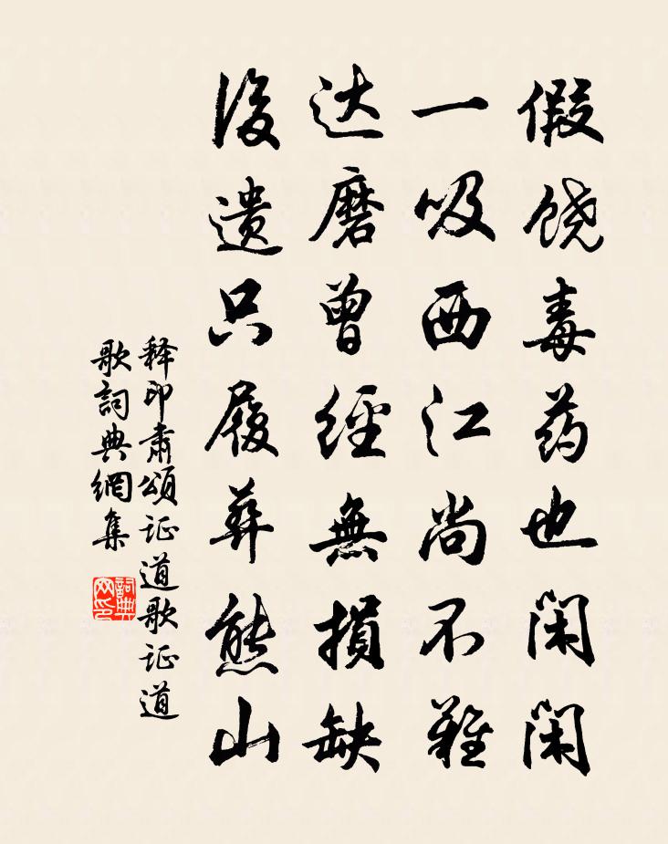 詩詞名句歷史字典書法欣賞書法字典國語詞典說文解字康熙字典古漢語字典標 題 作 者 詩 句 頌證道歌證道歌作者:釋印肅 朝代:宋代頌證道歌證道歌原文假饒毒藥也閒閒,一吸西江尚不難。達磨曾經無損缺,後遺只履葬熊山。詩詞問答問:頌證道歌證道歌的作者是誰?答:釋印肅問:頌證道歌證道歌寫於哪個朝代?答:宋代釋印肅頌證道歌證道歌書法欣賞頌證道歌證道歌書法作品詩詞推薦裴炎謠佚名〔唐代〕一片火,兩片火,緋衣小兒當殿坐。驀山溪(蠟梅)費時舉〔宋代〕黃苞初綻,誰向江頭寄。天賦與清香,笑紅顏、呈妖逞媚。低垂花面,不與眾爭妍,春尚未。先群卉。獨稟中央氣次韻周邠寄《雁盪山圖》二首蘇軾〔宋代〕西湖三載與君同,馬入塵埃鶴入籠。東海獨來看出日,石橋先去踏長虹。遙知別後添華發,時向樽前說病翁。所恨春雨中遣懷二首柬梅臞胡仲弓〔宋代〕蠟屐登山訪草亭,前山未放十分青。清明此去無多日,不信老天長晦冥。木蘭花/玉樓春佚名〔宋代〕東風昨夜吹春晝。陡覺去年梅蕊舊。誰人能解把長繩,系得烏飛並兔走。清香瀲灩杯中酒。新眼苗條江上柳。尊前呈愚卿昆仲二首趙蕃〔宋代〕百個修篁一樹梅,蕙盆蘭斛共相陪。客來不但繙書帖,興至更能傳酒杯。和前人賦別文天祥〔宋代〕翠松三萬頃,松雪著神仙。柳院催金鑰,江花送玉鞭。曉岩雲壁立,晚棹浪規圓。未了醉翁事,重尋潁上田。憶山南陸游〔宋代〕貂裘寶馬梁州日,盤槊橫戈一世雄。恕虎吼山爭雪刃,驚鴻出塞避雕弓。朝陪策畫清油里,暮醉笙歌錦幄中。老去次韻石秀叔慈雲逃席自解陳著〔宋代〕山林幸自絕塵氛,舊事誰嗟散幅裙。方外老交心似水,坐中高論氣騰雲。杯盤引興真相率,鐘鼓催晨醉不聞。但願羅湖八首劉克莊〔宋代〕異境微茫在半霄,仙人垂手下相招。老來尚有君親念,未敢相陪過鐵橋。余有三恨一無子二無助三無成抱北苦心娛以文俞文豹〔宋代〕天下奈何無可問,世皆如此有誰聽。為儂指點春知處,惟有垂揚眼獨青。十月晦日睡起王諶〔宋代〕睡起西窗午正蹉,小春天氣尚融和。顛狂絕笑檐前蝶,不道殘陽已不多。寄賀蘭銛杜甫〔唐代〕朝野歡娛後,乾坤震盪中。相隨萬里日,總作白頭翁。歲晚仍分袂,江邊更轉蓬。勿雲俱異域,飲啄幾回同。鹹陽道上晚晴有作文同〔宋代〕積靄晚盡散,南山明夕陽。秋容遍豐鎬,古恨入隋唐。草木鹹搖落,風煙自渺茫。客亭須下馬,把酒慰殊鄉。頌古三十一首釋玿〔宋代〕佛手驢腳生緣,生緣驢腳佛手。李公醉倒街頭,元是張公吃酒。黃龍山裹老婆禪,恰似河陽新婦醜。菩薩蠻(丁丑送春)劉辰翁〔宋代〕殷勤欲送春歸去。白首題將斷腸句。春去自依依。欲歸無處歸。天涯同是寓。握手留春住。小住碧桃枝。桃根不屬和胡秉彝敷文岩桂四首蔡戡〔宋代〕翠荷金英天與奇,清香十里已先知。春光不似秋光好,桃李紛紛何所施。贈薛秀才韋莊〔唐代〕相辭因避世,相見尚兵戈。亂後故人少,別來新話多。但聞哀痛詔,未睹凱旋歌。欲結岩棲伴,何山好薜蘿?贈晦叔憶夢得白居易〔唐代〕自別崔公四五秋,因何臨老轉風流?歸來不說秦中事,歇定唯謀洛下游。酒面浮花應是喜,歌眉斂黛不關愁。得君奉簡在伯四首趙蕃〔宋代〕書中舊學來禽帖,今日蠻州得飫嘗。要與先生共咀嚼,更將煮蜜助甘香。名句推薦亂山殘雪夜,孤燭異鄉人。崔塗《除夜 / 巴山道中除夜書懷 / 除夜有懷》 雲母屏風燭影深,長河漸落曉星沉。李商隱《嫦娥》 人善被人欺,馬善被人騎。佚名《增廣賢文·上集》 度德而處之,量力而行之左丘明《左傳·隱公·隱公十一年》 人老去西風白髮,蝶愁來明日黃花。張可久《折桂令·九日》 夜發清溪向三峽,思君不見下渝州。李白《峨眉山月歌》 池台竹樹三畝餘,至今人道江家宅。劉禹錫《金陵五題·並序》 為我引杯添酒飲,與君把箸擊盤歌。白居易《醉贈劉二十八使君》 煙霏雲斂;其容清明,天高日晶;歐陽修《秋聲賦》 慘慘柴門風雪夜,此時有子不如無。黃景仁《別老母》