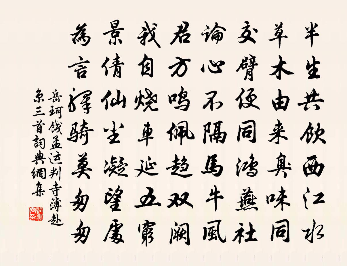 詩詞名句歷史字典書法欣賞書法字典國語詞典說文解字康熙字典古漢語字典標 題 作 者 詩 句 餞孟運判寺簿赴京三首作者:岳珂 朝代:宋代餞孟運判寺簿赴京三首原文半生共飲西江水,草木由來臭味同。交臂便同鴻燕社,論心不隔馬牛風。君方鳴佩趨雙闕,我自1|1燒車延五窮。景倩仙塵凝望處,為言驛騎莫匆匆。詩詞問答問:餞孟運判寺簿赴京三首的作者是誰?答:岳珂問:餞孟運判寺簿赴京三首寫於哪個朝代?答:宋代岳珂餞孟運判寺簿赴京三首書法欣賞餞孟運判寺簿赴京三首書法作品詩詞推薦偈頌三十首釋印肅〔宋代〕妄執迷流不肯休,所以今生逐女流。如今眼界渾塵染,幾時安穩見來秋,莫誤前途成業網。目連成佛已綢繆,開心詠史二首陳造〔宋代〕暴楚狂秦席捲中,謀臣戰將各言功。端知四百綿炎祚,只屬商山禿鬢翁。送顥法師往太原講兼呈李司徒無可〔唐代〕近臘辭精舍,并州謁尚公。路長山忽盡,塞廣雪無窮。講席開晴壘,禪衣涉遠風。聞經諸弟子,應滿此門中。入山遇雨宿開先寺二首王阮〔宋代〕擺落塵埃步入山,與僧相對浹旬間。鶴林卻笑題詩客,只得浮生半日閒。和秦壽之春晚偶成八絕王之道〔宋代〕官閒時醉秀溪春,醉里吟詩字字新。欲報自慚無好語,年來胸次亦埃塵。春雨絕句陸游〔宋代〕恰喜西窗晚照明,虛檐又報雨來聲。端憂不用占龜兆,壞盡花時自解晴。楊仲博生日魏了翁〔宋代〕任教寒畯著先鞭,盡使權豪紊選班。縱誚我迂嗤我矯,箇中所負重於山。題文與可墨竹蘇軾〔宋代〕斯人定何人,遊戲得自在。詩鳴草聖余,兼入竹三昧。時時出木石,荒怪軼象外。舉世知珍之,賞會獨予最。知音酬淮南牛相公述舊見貽劉禹錫〔唐代〕少年曾忝漢庭臣,晚歲空餘老病身。初見相如成賦日,尋為丞相掃門人。追思往事咨嗟久,喜奉清光笑語頻。猶有平山洪咨夔〔宋代〕放腳氛埃表,搔頭廣莫間。淮分三代水,江護六朝山。落日蒼煙起,秋風白鳥還。歐韓呼不起,髀滿鬢毛斑。和丁使君八詠樓姜特立〔宋代〕八詠詩成沈隱侯,樓中風月盡兼收。三千題里無新語,七百年間有勝流。領客登臨聊一快,舉杯相屬更無憂。令威買花陳起〔宋代〕今早神清覺步輕,杖藜聊復到前庭。市聲亦有關情處,買得秋花插小瓶。暮春泛西湖次口號韻呈程待制十首陳造〔宋代〕行行撫事念前賢,修竹祠西碧嶂前。不復船歸下雙鶴,空緣酒渴酌寒泉。疇依王柏〔宋代〕賢哉顏子,好學獨稱。既竭吾才,欲罷不能。不貳不遷,庶乎亞聖。一簞一瓢,不幸短命。江行俳體鍾惺〔明代〕村煙城樹遠依依,解指青溪與翠微。風送白魚爭入市,江過黃鵠漸多磯。家從久念方驚別,地喜初來也似歸。近日客中從厚祿故人乞米王琮〔宋代〕范甑欲塵貧亦甚,陶腰未折計何如。小窗獨對蕭蕭雨,臨得唐人乞米書。送人往湖南文天祥〔宋代〕雁拖秋月洞庭邊,客路淒涼野菊天。雲隔酒尊橫北海,風吹詩史落西川。夜深鬼火千山雪,春後鵑花一樹煙。為我句錢厚〔宋代〕暮靄不知天遠近,閒雲休礙月升沉。月夜看桂嚴中和〔宋代〕玉杵聲中舞素娥,西風葉葉自婆娑。一天清氣無人管,惟有山樓樹影多。得江西報六言十首劉克莊〔宋代〕石天祠有煙焰,游帷觀亦腥膻。小龍子入于海,老仙翁飛上天。名句推薦落花飛絮蒙蒙,長憶著、灞橋別後。毛滂《上林春令·十一月三十日見雪》 山上層層桃李花,雲間煙火是人家。劉禹錫《竹枝詞九首·其九》 桂花浮玉,正月滿天街,夜涼如洗。文徵明《念奴嬌·中秋對月》 北風捲地白草折,胡天八月即飛雪。岑參《白雪歌送武判官歸京》 一日不見,如三月兮。佚名《子衿》 賈生年少虛垂淚,王粲春來更遠遊。李商隱《安定城樓》 君子不動而敬,不言而信。子思《中庸·第三十三章》 荊江日落陣雲低,橫戈躍馬今何時。納蘭性德《送蓀友》 石澗凍波聲,雞叫清寒晨。李賀《自昌谷到洛後門》 斷無蜂蝶慕幽香,紅衣脫盡芳心苦。賀鑄《芳心苦·楊柳回塘》