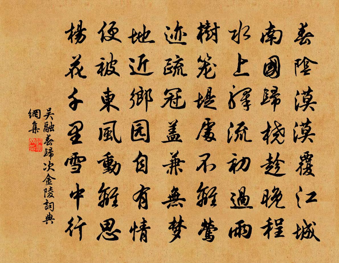 詩詞名句歷史字典書法欣賞書法字典國語詞典說文解字康熙字典古漢語字典標 題 作 者 詩 句 春歸次金陵作者:吳融 朝代:唐代春歸次金陵原文春陰漠漠覆江城,南國歸橈趁晚程。水上驛流初過雨,樹籠堤處不離鶯。跡疏冠蓋兼無夢,地近鄉園自有情。便被東風動離思,楊花千里雪中行。詩詞問答問:春歸次金陵的作者是誰?答:吳融問:春歸次金陵寫於哪個朝代?答:唐代問:春歸次金陵是什麼體裁?答:七律吳融春歸次金陵書法欣賞春歸次金陵書法作品注釋全唐詩:卷687-1詩詞推薦白鹿洞方岳〔宋代〕茲山信雄深,鍾梵上雲雨。微吾紫陽翁,幾何不豪取。有來青牛車,肯作白鹿主。詩書夜披之,一變至鄒魯。唐虞解字吟邵雍〔宋代〕人言為信,日月為明。止戈為武,羔美為羹。送魏兵曹使雋州得登字陳子昂〔唐代〕陽山淫霧雨。之子慎攀登。羌笮多珍寶。人言有愛憎。欲酬明主惠。當盡使臣能。勿以王陽道。迢遞畏崚嶒。送韓玉汝曾鞏〔宋代〕野岸漲流水,名園紛雜英。旭景冠蓋集,清談樽酒傾。重此台省秀,駕言江海行。已喜懷抱粹,況推材實精。眾許水雲遊 繼重陽韻馬鈺〔元代〕不住不住。火院當離,深宜別戶。害風仙、化我扃門,這修行須做。腥膻戒盡常餐素。掛體唯麻布。待百朝、鎖*任滿交割粹事致語口號陳造〔宋代〕黃堂冰峙兩飛仙,不遣纖塵到繡筵。龍麝香中揮玉麈,蕙蘭叢里釂金舡。即今別乘符初合,佇看丹墀璧再聯。來歲頌古十二首釋智深〔宋代〕末後無端重漏泄,焦齒翁翁嚼生鐵。玉鞭擊碎月明珠,累及兒孫揚醜拙。和聶之美重遊東郡二首司馬光〔宋代〕南湖重過又逢春,官柳雖疏亦解新。台榭傾欹賓友散,臨風愁殺獨遊人。曉行高翥〔宋代〕跨馬登長路,聞雞度遠關。水光斜漾月,雲影倒薶山。人跡霜橋外,禽聲煙樹間。自慚林下客,清夢未曾還。五哀詩故太子中允知洛陽縣潁公王禹偁〔宋代〕洛陽富文彩,峭拔四子流。提筆入廣場,辭氣乾鬥牛。擢第在芸閣,言事觸冕旒。左降宰百里,道勝心無憂。才高上政府五首郭印〔宋代〕政和乙未對彤庭,袖筆曾陪四海英。三十七年渾夢境,六千餘里邈神京。大鈞播物無垠際,小錄搜才有姓名。屈指夏夜坐游李左藏園常父子駿明叔毅父元忠時新孔武仲〔宋代〕王城雖多賢,相過每希闊。今夕復何夕,共此青天月。鄰園初鏟築,咫尺夷且潔。胡床占勢便,漫不就行列。素華某還故里過括蒼謝景思少卿示及諸公和詩次韻張九成〔宋代〕朝隨落月東郊去,暮逐歸雲北浦還。豈但勞農勤稼穡,要知為郡足清閒。家傳詩句江山謝,學到精微陋巷顏。今日六月內喜雨詩敖陶孫〔宋代〕炎天亦靳雨,特地費雷將。隱隱來何久,飛飛勢稍颺。初從沾塊潤,忽作建瓴忙。穉子拋書出,臞禪解縛狂。苗滋句洪天錫〔宋代〕平生要識瓊崖面,到此當堅鐵石心。和張相公太原山亭懷古詩崔恭〔唐代〕高情樂閒放,寄跡山水中。朝霞鋪座右,虛白貯清風。潛竇激飛泉,石路躋且崇。步武有勝概,不與俗情同。鵲橋仙(贈鷺鸞)辛棄疾〔宋代〕溪邊白鷺。來吾告汝。溪里魚兒堪數。主人憐汝汝憐魚,要物我、欣然一處。白沙遠浦。青泥別渚。剩有蝦跳鰍舞酬瓜疇趙爐夫投贈施樞〔宋代〕謀生百拙世無如,贏得心清剩讀書。薄宦喜從京國路,閒身還似野人居。濟川事業歸商傅,獻賦聲名羨子虛。歲晚靜觀堂十偈汪晫〔宋代〕我無官守無言責,自倚欄乾時一拍。只因冷眼看破來,笑殺時人空擘畫。病中聞歌有感陳某〔宋代〕伏枕已三月,清明節已過。光陰流水去,風雨落花多。病久難禁酒,愁深懶聽歌。門前舟楫動,無奈客懷何。名句推薦玉座猶寂寞,況乃妾身輕。謝朓《同謝諮議詠銅雀台》 夫情動而言形,理髮而文見劉勰《文心雕龍·體性》 獨立小橋風滿袖,平林新月人歸後。馮延巳《鵲踏枝·誰道閒情拋擲久》 人去空流水,花飛半掩門。秦觀《南歌子·香墨彎彎畫》 奢侈者鮮有不敗李大師、李延壽《南史·列傳·卷四十五》 黃霧漲天雪晦冥,黑雲拂地風膻腥沈約《昭君辭》 不成便沒相逢日,重整釵鸞箏雁。張翥《陌上花·有懷》 西湖又還春晚,水樹亂鶯啼。仲殊《訴衷情·寶月山作》 有理而無益於治者,君子弗言;有能而無益於事者,君子弗為。尹文《尹文子·大道上》 懷舊空吟聞笛賦,到鄉翻似爛柯人。劉禹錫《酬樂天揚州初逢席上見贈》