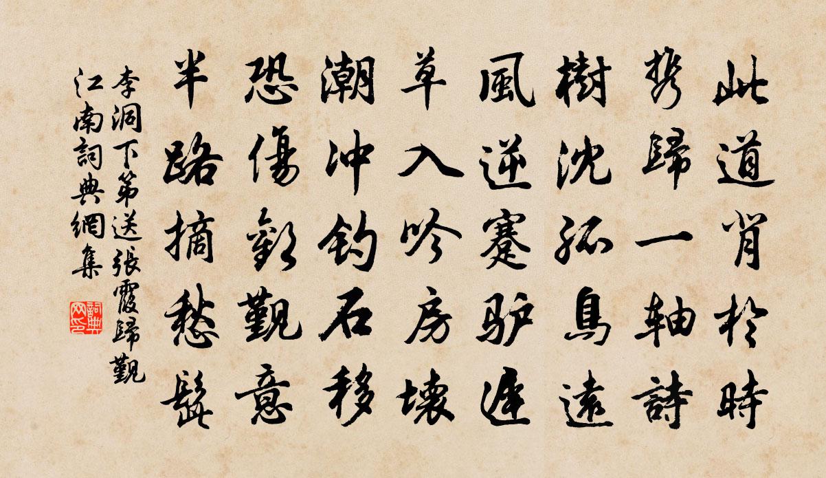 詩詞名句歷史字典書法欣賞書法字典國語詞典說文解字康熙字典古漢語字典標 題 作 者 詩 句 下第送張霞歸覲江南作者:李洞 朝代:唐代下第送張霞歸覲江南原文此道背於時,攜歸一軸詩。樹沈孤鳥遠,風逆蹇驢遲。草入吟房壞,潮沖釣石移。恐傷歡覲意,半路摘愁髭。詩詞問答問:下第送張霞歸覲江南的作者是誰?答:李洞問:下第送張霞歸覲江南寫於哪個朝代?答:唐代問:下第送張霞歸覲江南是什麼體裁?答:五律李洞下第送張霞歸覲江南書法欣賞下第送張霞歸覲江南書法作品注釋全唐詩:卷721-17詩詞推薦病中次務觀通判韻周必大〔宋代〕老眼亂蟬翼,樂事嘆何有。經年不銜杯,更暇問濡首。愛山空在山,擿埴詎容走。塵埃登高帽,生澀彈棋手。三年寄答周協律 來詩多敘蘇州舊遊。白居易〔唐代〕故人敘舊寄新篇,惆悵江南到眼前。暗想樓台萬餘里,不聞歌吹一周年。橋頭誰更看新月,池畔猶應泊舊船。最憶跨鶴台姚勉〔宋代〕仙人白日上青冥,鶴去台空喚不應。千載令威歸得否,雪堂有客夢如冰。姜鍾離輓詞樓鑰〔宋代〕門戶期興起,交朋務琢磨。反身求大學,決意取儒科。贊府聲尤著,鄰封惠亦多。傷心濠上路,無復聽弦歌。章運乾和綠陰堂用韻為謝黃公度〔宋代〕工拙相懸幾驛亭,敢將沮洳敵東溟。百年事契心先許,千里神交眼倍青。嗜酒楊雄官拓落,耽詩杜甫瘦伶俜。何時題居延古城贈喬十二知之陳子昂〔唐代〕聞君東山意。宿昔紫芝榮。滄洲今何在。華發旅邊城。還漢功既薄。逐胡策未行。徒嗟白日暮。坐對黃雲生。桂枝次韻朱塘三首許月卿〔宋代〕遊子從來悲故鄉,歸來襟袖芷蘭芳。夢魂飛去雲濤遠,杖策閒行秋水光。可是夢中曾到此,安知身後卻余香。紫陽竹馬兒葉夢得〔宋代〕與君記,平山堂前細柳,幾回同挽。又征帆夜落,危檻依舊,遙臨雲巘。自笑來往匆匆,朱顏漸改,故人俱遠。橫侍宴應制得分字喬知之〔唐代〕紫禁肅晴氛,朱樓落曉雲。豫游龍駕轉,天樂鳳簫聞。竹外仙亭出,花間輦路分。微臣一何幸,詞賦奉明君。相和歌辭棹歌行駱賓王〔唐代〕寫月圖黃罷,凌波拾翠通。鏡花搖芰日,衣麝入荷風。葉密舟難盪,蓮疏浦易空。鳳媒羞自托,鴛翼恨難窮。秋帳贈日者陳達夫六言二首劉克莊〔宋代〕昔有君平季主,今無韓慥林開。終日垂帷閉肆,或時戴笠盤街。慈谿龍虎軒偶成呂祖儉〔宋代〕蒼然暮色已崢嶸,姑射山頭臥玉鯨。墨客強生龍虎想,我來猶自怯威名。桂村鄧林〔宋代〕剪剪霜風起晚吹,一溪流水浸寒暉。客衫猶恨吳綿薄,不道邊人盡鐵衣。雨中重過釣台張養重〔清代〕再訪先生欲見難,空江風雨逼人寒。白雲中斷千峰樹,碧漲新添七里灘。只有陰晴隨箬笠,從無興廢到漁竿。回頭偈公六十五首釋鹹傑〔宋代〕達磨不來東土,二祖不往西天。石室行者蹈碓忘卻移步,玄沙討魚賣峭蹈翻釣船。寄題喻叔奇國傅郎中園亭二十六詠水樂楊萬里〔宋代〕渠水來從林外泓,水知湖近各爭鳴。何人月下攜枯木,寫取穿雲落澗聲。立春李石〔宋代〕青菜青絲白玉盤,西湖回首憶臨安。竹籬茅舍逢春日,樂得梅花帶雪看。巫山一段雲(五之五·雙調)柳永〔宋代〕蕭氏賢夫婦,茅家好弟兄。羽輪飆駕赴層城。高會盡仙卿。一曲雲謠為壽。倒盡金壺碧酒。醺酣爭撼白榆花。踏碎贈王介甫王令〔宋代〕當世胸懷萬古淳,平生才術老經綸。況逢堯舜登賢日,不復伊周望古人。得志定知移弊俗,聞風猶足警斯民。九門大觀三年朝獻景宮二首真宗〔宋代〕嚴嚴泰山,配德於天。奉符展采,翼翼乾乾。條濯靜嘉,罔有弗蠲。上帝顧諟,冷風肅然。名句推薦己之困辱宜忍,而在人則不可忍。洪應明《菜根譚·概論》 見素抱樸,少私寡慾,絕學無憂。老子《老子·道經·第十九章》 不勁直,不能矯奸。韓非及後人《韓非子·孤憤》 空門寂寞汝思家,禮別雲房下九華。金地藏《送童子下山》 自是浮生無可說。人間第一耽離別。王國維《蝶戀花·滿地霜華濃似雪》 天子居未央,妾侍卷衣裳。李白《秦女卷衣》 料因循誤了,殘氈擁雪,故人心眼。張炎《解連環·孤雁》 漸行漸遠漸無書,水闊魚沉何處問。歐陽修《玉樓春·別後不知君遠近》 酒肆人間世,琴台日暮雲。杜甫《琴台》 天蒼蒼,野茫茫。風吹草低見牛羊。佚名《敕勒歌》