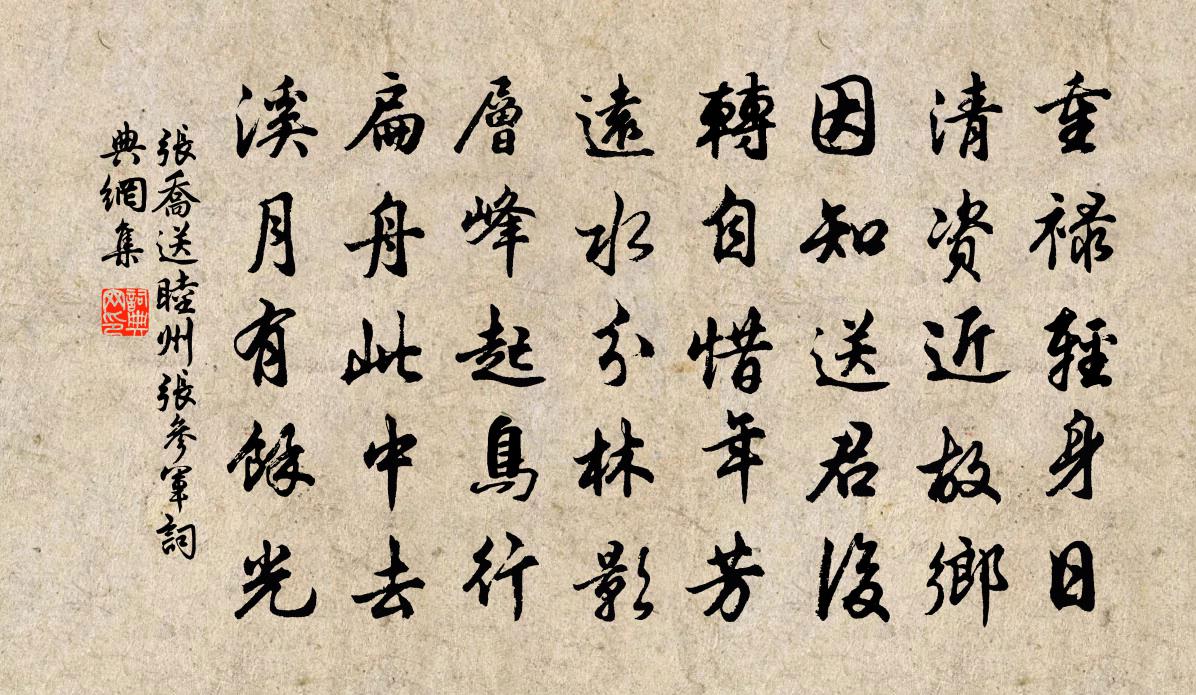 詩詞名句歷史字典書法欣賞書法字典國語詞典說文解字康熙字典古漢語字典標 題 作 者 詩 句 送睦州張參軍作者:張喬 朝代:唐代送睦州張參軍原文重祿輕身日,清資近故鄉。因知送君後,轉自惜年芳。遠水分林影,層峰起鳥行。扁舟此中去,溪月有餘光。詩詞問答問:送睦州張參軍的作者是誰?答:張喬問:送睦州張參軍寫於哪個朝代?答:唐代問:送睦州張參軍是什麼體裁?答:五律張喬送睦州張參軍書法欣賞送睦州張參軍書法作品注釋全唐詩:卷638-77詩詞推薦將至南康道中祖無擇〔宋代〕湓江輟棹整驂騑,松路楊鞭入翠微。好是近郊人候望,紛紛羽服與田衣。過介庵舊宅趙蕃〔宋代〕悠悠西州路,慘慘日暮雲。天不慦此老,世孰張吾軍。成都揚雄宅,青山太白墳。可憐車馬跡,不如鷗鷺群。酬令狐郎中見寄李商隱〔唐代〕望郎臨古郡,佳句灑丹青。應自丘遲宅,仍過柳惲汀。封來江渺渺,信去雨冥冥。句曲聞仙訣,臨川得佛經。朝吟王德言樞密生日十首曹勛〔宋代〕筍輿軋軋塞沙黃,赬襜胡兒語隔窗。且喜縱觀臨易水,未須楓落賦吳江。直夜楊億〔宋代〕繚垣嶢闕慶雲深,畫燭熏爐對擁衾。三殿夜簽傳漏箭,九秋霜籟入風琴。階前槁葉驚寒雨,天際孤鴻答迥砧。欹枕和端式上人十詠其二古木陰梅堯臣〔宋代〕古木少直枝,其下多曲影。豈不愛高陰,奈此性所秉。千重葉薈翳,誰願憩日永。滿庭芳劉山老〔宋代〕跛子年來,形容何似,儼然一部髭鬚。世間許大,拐上做工夫。選甚南州北縣,逢著處、酒滿葫蘆。醺醺醉,不知失題王珪〔唐代〕初見迎春識春新,欲插迎春驚春半。朱門深鎖不知春,苒苒年光暗中換。臨江仙(上祝丞)趙長卿〔宋代〕天祐炎圖生國瑞,藍田暫屈英僚。始知文宿降璇霄。中元前五日,七夕後三朝。江斅風流臨此政,少年瀟灑奇標。雨後聞思歸樂二首吳融〔唐代〕山禽枕連夜叫,枕兼雨未嘗枕休。盡道枕思歸樂,應多離別愁。我家方旅食,故國在滄洲。聞此不能寐,青燈茆屋送同年張正臣赴海陵幕強至〔宋代〕早年登甲選,從事又東藩。地與淮流絕,城連海氣昏。好山供健筆,暇日樂清樽。多著太平策,歸來奏帝閽。次韻子由書王晉卿畫山水一首而晉卿和二首蘇軾〔宋代〕誤點故教同子敬,雜篇真欲擬湯休。隴雲寄我山中信,雪月追君溪上舟。會看飛仙虎頭篋,卻來顛倒拾遺裘。(子又次韻沈告院送行二首項安世〔宋代〕前年倚席湘山下,曾得新篇勝玉葩。今日題輿秋浦上,又煩佳句溢瓊華。雲霄策足君方駛,風雨論心我未涯。正向萬年歡(壽兩國夫人胡氏)丁察院〔宋代〕葛井丹明,西來金母,霓旌雲旆。移下瑤池,竹外一壺秋水。菊□香留宿醉。看後夜、冰輪滿桂。貂蟬映、虹玉稱送雪竇璧老住雪峰樓鑰〔宋代〕雪竇移將住雪峰,兩山雪色本皆同。莫言此去人千里,明月往來含太空。幽居漫賦張玉孃〔宋代〕細雨吹涼入戶,聞花扶影移階。愁人紫燕相語,古道清風支來。獨坐韓維〔宋代〕雪屋生寒勁,風燈落燼頻。驚號獨過雁,默坐未眠人。世事存傷沒,年華故換新。還將寂寞意,強與凍醪親。觀社行劉克莊〔宋代〕吾家世南折簡呼,有日曷不見子都。牽衣況復幼吾幼,閉戶大似愚公愚。鮮妝袨服出空巷,鈿車繡轂來塞塗。展烏春日即事俞桂〔宋代〕春入侯家春事深,日長庭院又沉沉。客中不耐如絲雨,攪起思家寸寸心。西湖雜詠·春薛昂夫〔元代〕山光如淀,湖光如練,一步一個生綃面。叩逋仙,訪坡仙,揀西湖好處都游遍,管甚月明歸路遠。船,休放轉;杯名句推薦離恨恰如春草,更行更遠還生。李煜《清平樂·別來春半》 邊月隨弓影,胡霜拂劍花。李白《塞下曲六首》 秋風起兮白雲飛,草木黃落兮雁南歸。劉徹《秋風辭》 不怕風狂雨驟,恰才稱,煮酒箋花。李清照《轉調滿庭芳·芳草池塘》 卷峭寒萬里,平沙飛雪。吳文英《暗香疏影·夾鍾宮賦墨梅》 謹身節用,以養父母孔子及其弟子《孝經·庶人》 花漸凋疏不耐風,畫簾垂地晚重工,墮階縈蘚舞愁紅孫光憲《浣溪沙·花漸凋疏不耐風》 方而不割,廉而不劌,直而不肆,光而不耀。老子《老子·德經·第五十八章》 留連光景惜朱顏,黃昏獨倚闌。李煜《阮郎歸·呈鄭王十二弟》 一恕字是接物之要,所以終身可行也。王永彬《圍爐夜話·第六則》
