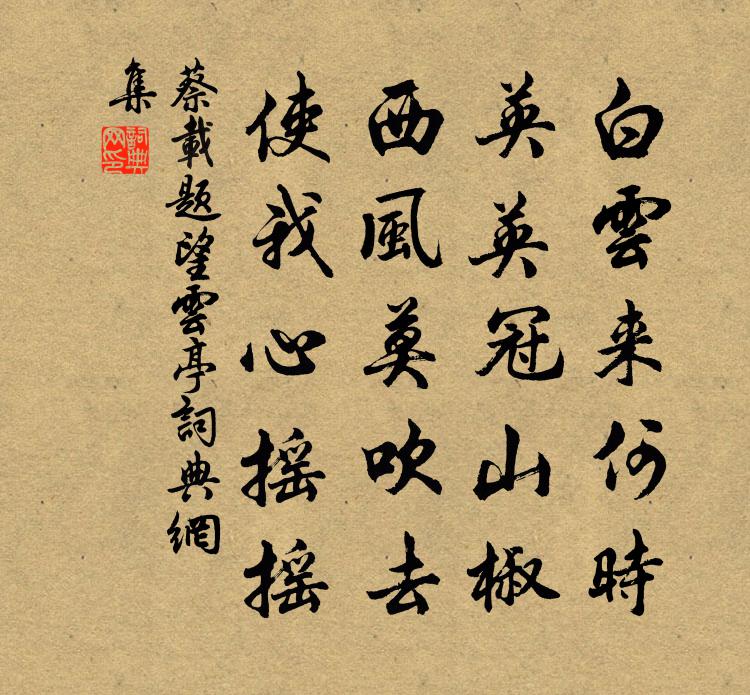 詩詞名句歷史字典書法欣賞書法字典國語詞典說文解字康熙字典古漢語字典標 題 作 者 詩 句 題望雲亭作者:蔡載 朝代:宋代題望雲亭原文白雲來何時,英英冠山椒。西風莫吹去,使我心搖搖。詩詞問答問:題望雲亭的作者是誰?答:蔡載問:題望雲亭寫於哪個朝代?答:宋代蔡載題望雲亭書法欣賞題望雲亭書法作品詩詞推薦尋郭道士不遇趙文〔宋代〕問師雲已出,杖履水東灣。世上方多事,山中亦小閒。竹光新雨後,禽語夕陽間。自出雲關去,鐘聲送我還。月牙岩周進隆〔明代〕翠微峭拔倚天表,半輪月照桂江小。 岩頭黃烏棲高枝,一聲啼破千山小。 夜訪侃直翁劉瀾〔宋代〕疏瓴亂見星,危坐冷無燈。索句髭先白,餐蔬貌欲青。樓禽翻麓雪,墮栗破溪冰。昨夜中峰頂,同看海日升。句王維〔唐代〕人家在仙掌,雲氣欲生衣。第一百二十九卷贈羅隱劉贊〔唐代〕人皆言子屈,獨我謂君非。明主既難謁,青山何不歸。年虛侵雪鬢,塵枉污 * 。自古逃名者,至今名豈微。徐遜綿題三賢祠堂詩有雲士死惟留姓與名天下方回〔宋代〕殷仁周壽缺圓形,釋寶仙清笑乞靈。何限台階隆爵位,誰堪鼎足並儀形。歲寒臭味松梅竹,乾象光芒日月星。野服送陸務觀赴七閩提舉常平茶事周必大〔宋代〕漢皇親召賈生還,京路爭看北海賢。卻畏神仙足官府,便思風采爍雲煙。家鶴乾隆〔清代〕家鶴唳松蔭,聲淒故不揚,野雁叫洲渚,春宇隨翱翔。胡為凌雲姿,遜彼棲蘆行,由來受羈束,只為飽稻粱。垂飛念奴嬌(次韻范正之柳絮)劉學箕〔宋代〕水軒沙岸,午風輕、飄動一天晴雪。日色晶螢光眩眼,細逐遊絲明滅。簾幕中間,樓台側畔,渾是瑤瑛積。綴松黏郫縣春日吟吳泳〔宋代〕去年春日百花斑,今歲逢春萬竹間。共靚竹香宜細看,春風不會一朝閒。懷鐘陵舊遊四首杜牧〔唐代〕一謁征南最少年,虞卿雙璧截肪鮮。歌謠千里春長暖,絲管高台月正圓。玉帳軍籌羅俊彥,絳帷環佩立神仙。陸公累日不到西園瑞香忽已爛熳韓維〔宋代〕錦官翻樣出新機,淺綠深紅各自宜。不是東風送香氣,幽花落盡有誰知。公無渡河楊冠卿〔宋代〕河流決崑崙,微禹其為魚。龍門雖已鑿,犀栧孰可踰。老翁被髮鬢如絲,臨流欲渡將何之。嫗止翁留翁勿渡,翁不舟溪吟徐僑〔宋代〕舟溪群山俱有情,禺昂環列如逢迎。東出雙秀高沖天,推先兩峰當我前。二水南來炯相顧,合流於西疑欲住。成此游靈山二首陳造〔宋代〕高人避俗水雲居,客子偷閒簿領餘。本自毗耶病居士,不妨僧飯小躇躕。送別詩佚名〔隋代〕楊柳青青著地垂,楊花漫漫攪天飛。柳條折盡花飛盡,借問行人歸不歸。五老宋伯仁〔宋代〕著破箱中欲嫁衣,翠顰何止只憂葵。春來偷摘斑斑發,淚濕菱花只自知。收懷釋文珦〔宋代〕為知不是功名骨,換著方袍入翠微。身事半生貧里過,家園千里夢中歸。尋詩野寺雲黏屐,採藥名山露濕衣。似此秋思陸游〔宋代〕南鄭歸來二十霜,背人歲月去堂堂。破裘不補知寒早,倦枕無憀厭夜長。年少若為評宿士?狂生曾是說高皇。慨然雨後訪田家劉應時〔宋代〕一雨及時晴又佳,江村農父話喧譁。旋炊麥飯非常飽,笑指苗田不用車。有眼何曾識朝市,逢人只喜話桑麻。此間名句推薦莫辭秉燭通霄坐,明日相思隔隴煙。王守仁《諸門人送至龍里道中二首》 眼覷著災傷教我沒是處,只落得雪滿頭顱。張養浩《一枝花·詠喜雨》 大丈夫處其厚,不居其薄;處其實,不居其華。老子《老子·德經·第三十八章》 教人怎不傷情。覺幾度、魂飛夢驚。劉過《柳梢青·送盧梅坡》 蒼蒼竹林寺,杳杳鐘聲晚。劉長卿《送靈澈上人》 君思潁水綠,忽復歸嵩岑。李白《送裴十八圖南歸嵩山二首》 滿眼遊絲兼落絮,紅杏開時,一霎清明雨。馮延巳《鵲踏枝·清明》 瘦雪一痕牆角,青子已妝殘萼。王庭筠《謁金門·雙喜鵲》 翅低白雁飛仍重,舌澀黃鸝語未成。白居易《南湖早春》 攜籮驅出敢偷閒,雪脛冰須慣忍寒。范成大《雪中聞牆外鬻魚菜者求售之聲甚苦有感》