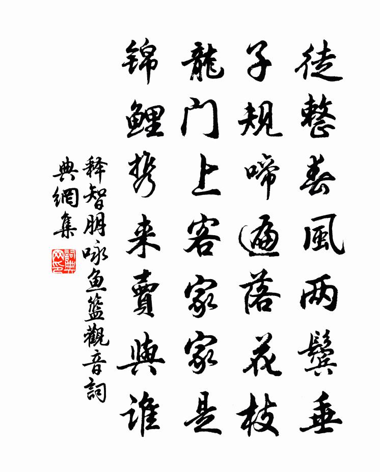 詩詞名句歷史字典書法欣賞書法字典國語詞典說文解字康熙字典古漢語字典標 題 作 者 詩 句 詠魚籃觀音作者:釋智朋 朝代:宋代詠魚籃觀音原文徒整春風兩鬢垂,子規啼遍落花枝。龍門上客家家是,錦鯉攜來賣與誰。詩詞問答問:詠魚籃觀音的作者是誰?答:釋智朋問:詠魚籃觀音寫於哪個朝代?答:宋代釋智朋詠魚籃觀音書法欣賞詠魚籃觀音書法作品詩詞推薦聞蛙倪瑞璿〔清代〕草綠清池水面寬,終朝閣閣叫平安。無人能脫征徭累,只有青蛙不屬官。鄭州浮波亭呂夷簡〔宋代〕清波環繞地無塵,榜署嘉名得意新。若問經綸康濟術,亭中兼有釣璜人。余與李廌方叔相知久矣,領貢舉事,而李不得蘇軾〔宋代〕與君相從非一日,筆勢翩翩疑可識。平生謾說古戰場,過眼終迷日五色。我慚不出君大笑,行止皆天子何責。青袍會峰亭歐陽修〔宋代〕山勢百里見,新亭壓其巔。群峰漸靡迤,高下相綿聯。下窺疑無地,杳藹但蒼煙。是時新雨余,眾壑鳴春泉。林籟雜興張嵲〔宋代〕疏園兩樹杏,風雨夜離披。離披君莫恨,結子還並枝。猶勝西澗水,一去杳無期。靜坐觀物理,令人添鬢絲。太皇太后閣六首蘇軾〔宋代〕小殿黃金榜,珠簾白玉鉤。一聲雙日蹕,春色滿皇州。挽方仲及簽判二首黃公度〔宋代〕年來群盜滿南區,百指間關返舊廬。杖屨不辭還往數,尊罍猶想笑譚餘。音容忽忽成千古,身世悠悠竟六如。修短和謝吏部鐵字韻三十四首丘宰生日二首鄧肅〔宋代〕律管才吹九寸耳,帝遣玄冥下司水。天度稍多百四十,愛日差長斗建子。已剝群陰驅小人,四海熙熙語復嗔。因闢紹岩上人寧親梅堯臣〔宋代〕爾教禁足不出戶,盛夏畏蹈螻蟻蹤。赤日去省已亡律,曷若冠帶共甘濃。雪夕林亭小酌因成拙詩四十韻以貽坐客昔歐陽朱長文〔唐代〕極望鋪千頃,平觀徹九霄。縱橫隨物象,合散委天飆。灑竹聲微動,妝松勢不搖。庭空飛鳥影,窗失遠山椒。釣罷楊妃真山民〔宋代〕三郎掩面馬嵬坡,生死恩深可奈何。瘞土驛傍何足恨,潼關戰處骨埋多。清渭八景指崖一覽何子舉〔宋代〕指崖屹立鎮山川,萬丈巍巍勢插天。風日雙清時有限,乾坤一覽景無邊。東西峴丹青與獻,南北群峰紫翠邊。我欲采菱蘇泂〔宋代〕引蔓搴花釣艇妨,游颺錦浪霅溪傍。若教總不餐煙火,只採芳香亦味長。泛松溪李新〔宋代〕浪激冰花潄大堤,山回雲影照寒溪。一生懷抱無人見,又躍蘆梢困馬蹄。次韻周朝宗六月十日泛湖周邦彥〔宋代〕風舟挽猶遲,兀若乘款段。深行蛟龍國,氈盪光炯散。洲涼扇荷箑,山晚垂雲幔。眷言江海期,百年行欲半。和文遠以作醮相疏楊萬里〔宋代〕涉夏天勤雨,今年定有秋。試思沖熱出,何似帶泥游。軒冕關莊子,江湖著魏牟。高人香火里,也到酒邊不。桂州三月三日(一作桂陽三日述懷)宋之問〔唐代〕代業花京華里,遠投魑魅鄉。登高望不極,雲海四茫茫。伊昔承休盼,曾為人所羨。兩朝賜顏色,二紀陪歡宴。昆心泉蒲壽宬〔宋代〕山泉不知源,流出石磊砢。坎止心維亨,蒙養行必果。久視空無塵,靜趣自忘我。明月知此心,時印夜光顆。五雪詩用韻寓五字項安世〔宋代〕偪塞天星近,紛綸世事平。瘴消原谷長,蝗死岳芝生。徑合迷車轍,宵明誤鼓聲。絝寒空數挽,履綻莫深行。眼看城北夜陸游〔宋代〕端居厭孤寂,偶系北城舟。天地淒涼色,江湖汗漫遊。螢光矜暗夜,蟲語報新秋。老去功名意,青燈映布裯。名句推薦寒日蕭蕭上瑣窗,梧桐應恨夜來霜。李清照《鷓鴣天·寒日蕭蕭上瑣窗》 強自取柱,柔自取束。荀子《荀子·勸學》 知人者智,自知者明。勝人者有力,自勝者強。知足者富。強行者有志。老子《老子·道經·第三十三章》 海風吹不斷,江月照還空。李白《望廬山瀑布水二首》 豈知民力艱,顆米皆琳琅。黃燮清《秋日田家雜詠》 念歸林葉換,愁坐露華生。張九齡《西江夜行》 柳外輕雷池上雨,雨聲滴碎荷聲。小樓西角斷虹明。歐陽修《臨江仙·柳外輕雷池上雨》 還與去年人,共藉西湖草。蘇軾《卜運算元·感舊》 吳絲蜀桐張高秋,空山凝雲頹不流李賀《李憑箜篌引》 秋霜切玉劍,落日明珠袍李白《白馬篇》