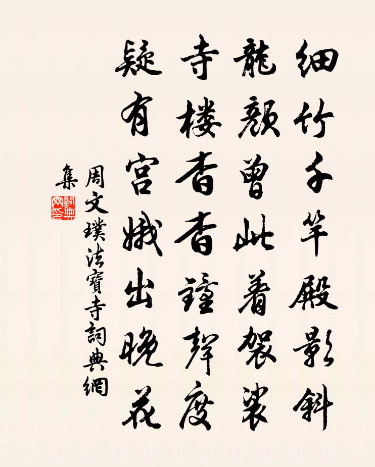 詩詞名句歷史字典書法欣賞書法字典國語詞典說文解字康熙字典古漢語字典標 題 作 者 詩 句 法寶寺作者:周文璞 朝代:宋代法寶寺原文細竹千竿殿影斜,龍顏曾此著袈裟。寺樓杳杳鐘聲度,疑有宮娥出晚花。詩詞問答問:法寶寺的作者是誰?答:周文璞問:法寶寺寫於哪個朝代?答:宋代周文璞法寶寺書法欣賞法寶寺書法作品詩詞推薦寄懷唐彥謙〔唐代〕有客傷春復怨離,夕陽亭畔草青時。淚從紅蠟無由制,腸比朱弦恐更危。梅向好風惟是笑,柳因微雨不勝垂。雙溪上巳蘇轍〔宋代〕春服初成日暖,潩河漸滿風涼。欲復孔門故事,略有童冠相將。城西百步而近,杏花半落草香。欣然願與數子,臨用前韻戲公靜黃庭堅〔宋代〕偶逢攜酒便與飲,竟別我為何等人。兔月龍團不當惜,長卿消渴肺生塵。祥符寺水閣余國寶〔宋代〕楚江空闊水閬收,葭葦蕭蕭兩岸幽。柔櫓推殘千頃浪,好風吹過一帆愁。人歸別浦雲煙晚,舟泊寒沙島嶼秋。領略題古磵文天祥〔宋代〕市腰石有千年磵,石眼泉無一日乾。天下蒼生應有望,不知龍向此中蟠。清平樂 贈句龍英孺家小女阿金,張仲經二女元好問〔金代〕瓊枝瑤草。來自三山島。莫道生男堪慰老。掌上金兒更好。胭脂杏蕾生紅。繡襦學弄春風。好共蘭蘭楚楚。畫教乞贈莊賢良招隱樓三首項安世〔宋代〕主人湖海士,有策欲平戎。入朝見天子,可以揖三公。客來忽相驚,見此招隱號。語客且勿驚,洗耳非我好。女豈祀風師樂章。迎俎酌獻包佶〔唐代〕德盛昭臨,迎拜巽方。爰候發生,式薦馨香。酌醴具舉,工歌載揚。神歆六律,恩降百祥。送許季韶粹桂林李洪〔宋代〕尺五天邊看頡頏,參辰出處九星霜。未令掌誥吟紅藥,屢喜嘉言貢皂囊。懷紱寓居欣會弁,監州歲晚客殊方。柱林春詞李建勛〔唐代〕日高閒步下堂階,細草春莎沒繡鞋。折得玫瑰花一朵,憑君簪向鳳凰釵。頌古三十九首釋道樞〔宋代〕花萼樓前春正濃,蒙蒙柳絮舞晴空。金錢擲罷嬌無力,笑倚闌乾屈曲中。龍洞鄭國輔〔宋代〕泥蟠蟄臥久潛蹤,一旦青雲得路通。利物濟人功已了,卻遺凡骨返仙宮。詠凌霄花袁燮〔宋代〕松柏扳援有女蘿,紅英亦復蔓高柯。侵尋縱上雲霄去,究竟依憑未足多。讀陶集愛其致意於菊者八因作八首五曰芳菊方回〔宋代〕人間紅葉去無蹤,膏沐誰為百草容。霜傑同時謚貞秀,抗衡惟許老蟠龍。楊花吳融〔唐代〕不鬥穠華不占紅,自飛晴野雪濛濛。百花長恨風吹落,唯有楊花獨愛風。次劉曉窗九日韻十首楊公遠〔宋代〕秋菊何嘗委片英,都緣氣韻稟清寧。欲將此意靈均道,只恐靈均喚不醒。至揚州文天祥〔宋代〕青衣山下汲荒泉,道遇腥風走不前。向晚歸來號且哭,胡兒只為解腰纏。送石宰王炎〔宋代〕溪頭雪後梅花發,飛鳧東去朝雙闕。涉溪父老肩相摩,再拜路旁皆惜別。問侯何以能得民,胸中仁氣如陽春。攀轅夜宿龍頭楊汝南〔宋代〕江流如箭路如梯,夜泊龍頭煙靄迷。兩角孤雲天一握,曉光不覺玉繩低。賀葉司業兼中書舍人呂聲之〔宋代〕英妙才華四十年,山林朝市姓名傅。何妨萬斛橫江上,不礙千帆過目前。我肯尾書乾木紙,人饒首著祖生鞭。金鑾名句推薦日暮詩成天又雪,與梅並作十分春。盧梅坡《雪梅·其二》 故知之始己,自知而後知人也。王詡《鬼谷子·反應》 郵亭無人處,聽檐聲不斷,困眠初熟。周邦彥《大酺·越調春雨》 秦時明月漢時關,萬里長征人未還。王昌齡《出塞二首·其一》 泥落畫梁空,夢想青春語。吳文英《生查子·秋社》 數叢沙草群鷗散,萬頃江田一鷺飛。溫庭筠《利州南渡》 能令暫開霽,過是吾無求。韓愈《洞庭湖阻風贈張十一署·時自陽山徙掾江陵》 黃河捧土尚可塞,北風雨雪恨難裁。李白《北風行》 莫道讒言如浪深,莫言遷客似沙沉。劉禹錫《浪淘沙九首》 賭近盜,淫近殺。馮夢龍《警世通言·卷三十五》