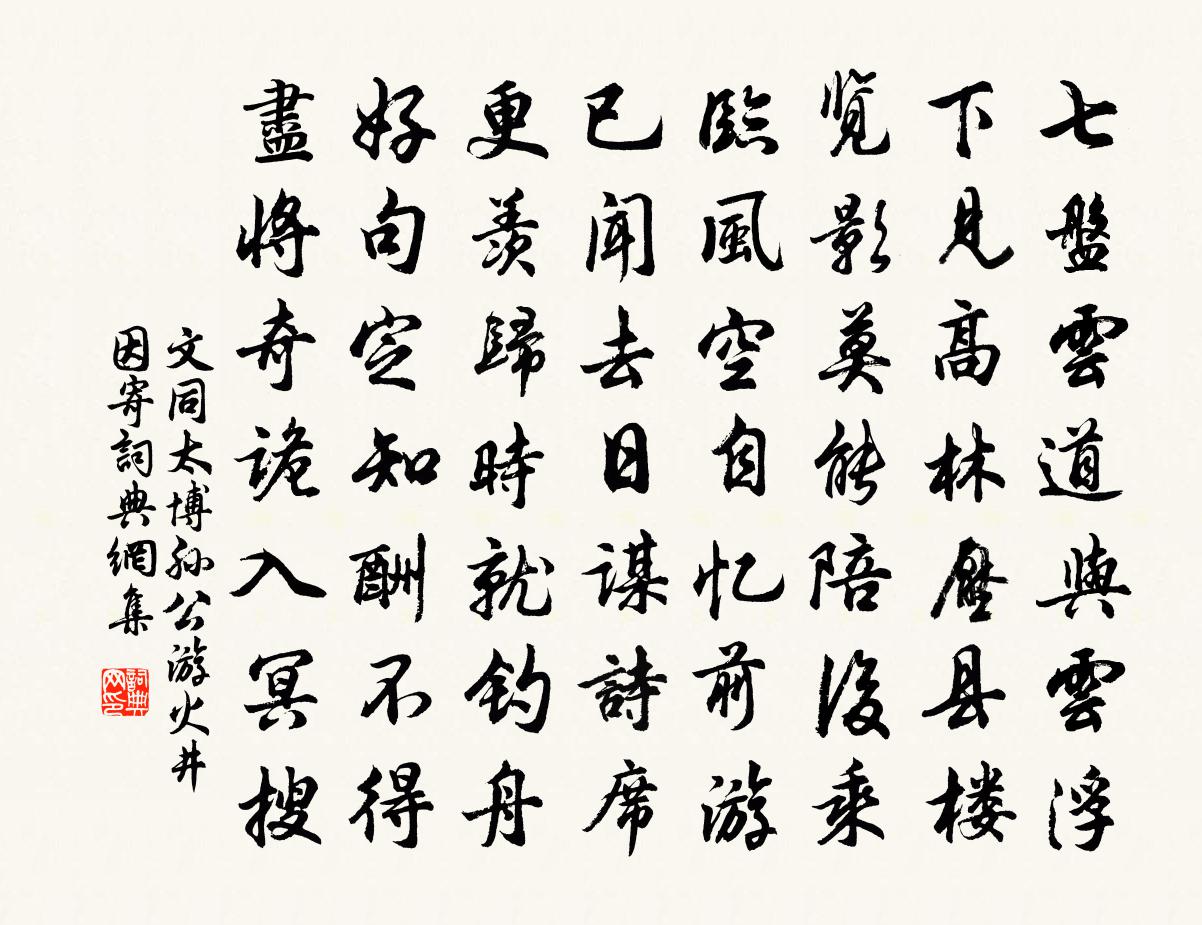 詩詞名句歷史字典書法欣賞書法字典國語詞典說文解字康熙字典古漢語字典標 題 作 者 詩 句 太博孫公游火井因寄作者:文同 朝代:宋代太博孫公游火井因寄原文七盤雲道與雲浮,下見高林壓縣樓。覽影莫能陪後乘,臨風空自憶前游。已聞去日謀詩席,更羨歸時就釣舟。好句定知酬不得,盡將奇詭入冥搜。詩詞問答問:太博孫公游火井因寄的作者是誰?答:文同問:太博孫公游火井因寄寫於哪個朝代?答:宋代文同太博孫公游火井因寄書法欣賞太博孫公游火井因寄書法作品詩詞推薦金陵雜興二百首蘇泂〔宋代〕鐘山閣上看朝曦,玉作遙山碧四圍。雲氣茫茫疑是水,人間無此米元暉。上廣東運副馬少卿壽十口號曾豐〔宋代〕台星久出照寰瀛,懶入端門傍御屏。上扣北辰乞閒散,南歸長作老人星。風入松(寄故人)白君瑞〔宋代〕一冬不見雪花飛。愛日盪晴暉。臘殘未解寒塘凍,東風細、已露春期。正是年時策馬,相隨村落尋梅。故人別久信太常引 魯仲連劉秉忠〔元代〕當時六國怯強秦。使群策,日紛紛。談笑卻三軍。算自古、誰如此君。一心忠義,滿懷冰雪,功就便抽身。富貴若蝶戀花(西山小湖,四月初,蓮有一花)李彌遜〔宋代〕小小芙蕖紅半展。占早爭先,不奈腰肢軟。羅襪凌波嬌欲顫。向人如訴閨中怨。把酒與君成眷戀。約束新荷,四面山中黃庚〔宋代〕萬壑松聲撼翠微,夜寒風露濕人衣。山翁踏月巡幽徑,竹裹籠開鶴未歸。中秋夜隴州徐常侍座中詠月無可〔唐代〕隴城秋月滿,太守待停歌。與鶴來松杪,開煙出海波。氣籠星欲盡,光滿露初多。若遣山僧說,高明不可過。挽王助教劉克莊〔宋代〕彼此俱丁未,相逢憶少時。工書有筋骨,嗜句入肝脾。魯泮郎君秀,唐官助教卑。直須燎黃誥,方慰蓼莪悲。海棠袁說友〔宋代〕江行了不按春光,江路欣看得海棠。淺蘸深紅叢蓓蕾,細開濃白巧梳妝。蜀花但鬭胭脂濕,荊種新傅膩粉香。行客惠民堤河晚矚宋祁〔宋代〕遠水同縈帶,聯堤類築垣。行舟壓天底,臥木擁沙痕。魴鱮逃空罶,鳧鷖泊迥村。層波真可羨。由此到都門。郊廟歌辭。祀風師樂章。送神包佶〔唐代〕微穆敷華能應節,飄揚發彩宜行慶。送迎靈駕神心享,跪拜靈壇禮容盛。氣和草木發萌芽,德暢禽魚遂翔泳。永望書黃山館壁寇準〔宋代〕殘日住孤館,遲遲行古台。大河連野去,白鳥背城來。離恨渾如結,鄉心漸欲灰。山花半寥落,猶在社前開。菩薩蠻納蘭性德〔清代〕曉寒瘦著西南月,丁丁漏箭余香咽。春已十分宜,東風無是非。蜀魂羞顧影,玉照斜紅冷。誰唱《後庭花》,新年送許處士堅往茅山潘佑〔唐代〕天壇雲似雪,玉洞水如琴。白雲與流水,千載清人心。君攜布囊去,路長風滿林。一入華陽洞,千秋那可尋。依韻和景仁寄河中公儀龍圖王珪〔唐代〕錦江回日應迢遞,聞道秋來已到城。南省深沈春又鎖,東樓悵望雨中情。河聲欲轉吞鼙鼓,山色初明照旆旌。別後自合浦還清湘寄虛中弟陳瓘〔宋代〕瘴海只將梅作雪,湘山今見麥為春。晴空有月當如舊,嶺北山南總照人。上張丞相十首張元乾〔宋代〕活國勛奇甚,平戎志未衰。肯從時論屈,自許世人知。豹尾遙臨鎮,蟬冠暫祝厘。天將擒頡利,露布舍公誰。謝世詩二首吳潛〔宋代〕邊馬南來動北風,屢陳長策矢孤忠。群豺橫暴嘉謀遏,儀鳳高飛事業空。愁恨暗消榕樹綠,寸心漫擬荔枝紅。欲知毗陵天慶觀龍張蘊〔宋代〕殿陰壁老懷仁筆,頭角崢嶸春起蟄。有時麾斥惠山雲,行雨歸來半身濕。挽應偉節尊人吳芾〔宋代〕歸來閭里問高年,此日惟公五福全。三世儒科身及見,四經鄉飲眾推先。安時不恨青衫晚,適意還欣彩服鮮。終始名句推薦白日依山盡,黃河入海流。王之渙《登鸛雀樓》 秦女含顰向煙月,愁紅帶露空迢迢。溫庭筠《惜春詞》 千錘萬鑿出深山,烈火焚燒若等閒。于謙《石灰吟》 斗萬花樣巧,深染蜂黃。吳文英《惜黃花慢·菊》 一寸柔腸情幾許?薄衾孤枕,夢回人靜,徹曉瀟瀟雨。惠洪《青玉案·絲槐煙柳長亭路》 兄弟者,分形連氣之人也。顏之推《顏氏家訓·兄弟篇》 木與木相摩則然,金與火相守則流莊子《莊子·雜篇·外物》 墜粉飄香,日日喚愁生。盧祖皋《江城子·畫樓簾暮卷新晴》 靡蕪盈手泣斜暉,聞道鄰家夫婿歸。魚玄機《閨怨》 一日不見,如三月兮。佚名《子衿》