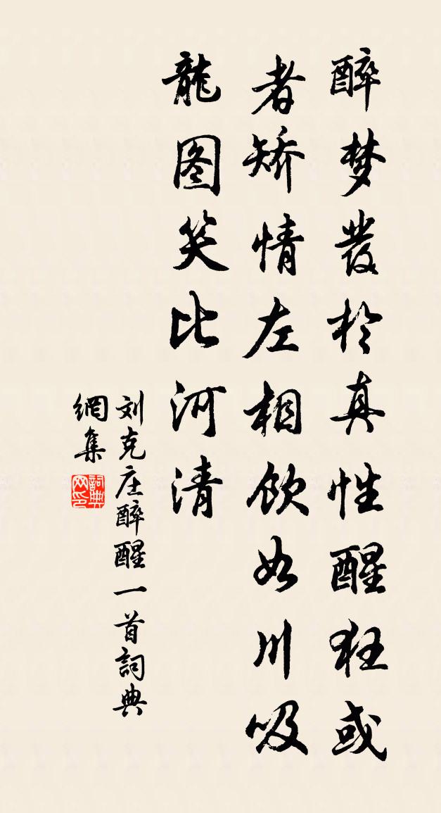 詩詞名句歷史字典書法欣賞書法字典國語詞典說文解字康熙字典古漢語字典標 題 作 者 詩 句 醉醒一首作者:劉克莊 朝代:宋代醉醒一首原文醉夢發於真性,醒狂或者矯情。左相飲如川吸,龍圖笑比河清。詩詞問答問:醉醒一首的作者是誰?答:劉克莊問:醉醒一首寫於哪個朝代?答:宋代問:劉克莊的名句有哪些?答:劉克莊名句大全劉克莊醉醒一首書法欣賞醉醒一首書法作品詩詞推薦即席陸游〔宋代〕醉中起舞遞相屬,坐上戴花常作先。要知吾輩不凡處,一吸已乾雙玉船。初春張嵲〔宋代〕原野土膏動,懷生各自欣。老年歡緒少,獻歲物華新。草木涵時澤,江湖寄病身。百年都幾日,四見魏塘春。徐南卿友竹軒二首陳造〔宋代〕嘯風含月近窗扉,金鎖瓏璁鳳尾齊。況復賴君相引重,一時同作辟塵犀。石炭蘇軾〔宋代〕君不見前年雨雪行人斷,城中居民風裂骭。濕薪半束抱衾裯,日暮敲門無處換。豈料山中有遺寶,磊落如{上左醫吳歌釋善珍〔宋代〕吳兒鳴艣吳波里,作勞耳熱歌聲起。初猶哇咬雜吁嘻,後方激訐如怨詈。芳洲日夕西風來,含情宛轉聲更哀。君不由桂林朔灕江至興安袁枚〔清代〕江到興安水最清,青山簇簇水中生。分明看見青山頂,船在青山頂上行。有烹犢延客者食之有感戴復古〔宋代〕田家繭栗犢,小小可憐生。未試一犁力,俄遭五鼎烹。朝來占食指,妙絕此杯羹。口腹為人累,終懷不忍情。鮑待用輓詞四首林亦之〔宋代〕寒村夜雨斷人煙,卻有累累哭野田。一飯誰能吊衰草,似君此事至今傳。點絳唇晏幾道〔宋代〕湖上西風,露花啼處秋香老。謝家春草,唱得清商好。笑倚蘭舟,轉盡新聲了。煙波渺,暮雲稀少,一點涼蟾小。庾翼徐鈞〔宋代〕少有經綸濟世謀,拔溫輕浩孰能儔。休言庾亮名居最,當在江東第一流。句趙汝譡〔宋代〕先朝懷族遠,平世責人深。寄淮南友人李白〔唐代〕紅顏悲舊國,青歲歇芳洲。不待金門詔,空持寶劍游。海雲迷驛道,江月隱鄉樓。復作淮南客,因逢桂樹留。代貧賤苦愁行鮑照〔南北朝〕湮沒雖死悲。貧苦即生劇。長嘆至天曉。愁苦窮日夕。盛顏當少歇。鬢髮先老白。親友四面絕。朋知斷三益。空庭頌古一百二十一首釋宗杲〔宋代〕移身不移步,移步不移身。走卻金師子,捉得玉麒麟。贈詹朝倚劉子翬〔宋代〕之子詞鋒孰敢爭,它時雲路定飛騰。客懷未免悲彈鋏,文社遙知喜得朋。舊隱生涯三徑菊,夜窗弦誦十年燈。長篇月夜溪莊訪舊柴望〔宋代〕山山明月路,何處認梅花。石色冷如水,溪流白似沙。清吟幽客夢,華發故人家。相見即歸去,已應河漢斜。鶯鳴十章寄戚伯瑞彭龜年〔宋代〕有鳴其禽,其鳴維何。有懷其人,我心靡他。萼嶺四望皇甫曾〔唐代〕漢家仙仗在鹹陽,洛水東流出建章。野老至今猶望幸,離宮秋樹獨蒼蒼。閏中秋趙大成〔宋代〕桂影中秋特地圓,況當餘閨魄澄鮮。因懷勝賞初經月,免使詩人歡隔年。萬象斂光增浩蕩,四溟收夜助嬋娟。鮮雲題東坡蔗滓窠石艾性夫〔宋代〕空洞如虛拳,擁腫類奇癭。槎牙老樹身,相依以為命。智士能用屈,榴皮勝毛穎。先生倒啗余,此正入佳境。名句推薦碧窗斜月藹深暉,愁聽寒螿淚濕衣張仲素《秋閨思二首》 野客預知農事好,三冬瑞雪未全消。戴復古《除夜》 妖嬈艷態,妒風笑月,長殢東君。李清照《慶清朝·禁幄低張》 青,取之於藍而青於藍;冰,水為之而寒於水。荀子《荀子·勸學》 黃鶴一去不復返,白雲千載空悠悠。崔顥《黃鶴樓 / 登黃鶴樓》 恰似春風相欺得,夜來吹折數枝花。杜甫《絕句漫興九首·其二》 槲葉落山路,枳花明驛牆。溫庭筠《商山早行》 長安大雪天,鳥雀難相覓。張孜《雪詩》 感時花濺淚,恨別鳥驚心。杜甫《春望》 轅門菊酒生豪興,雁塞風雲愜壯遊。王瓊《九日登花馬池城》