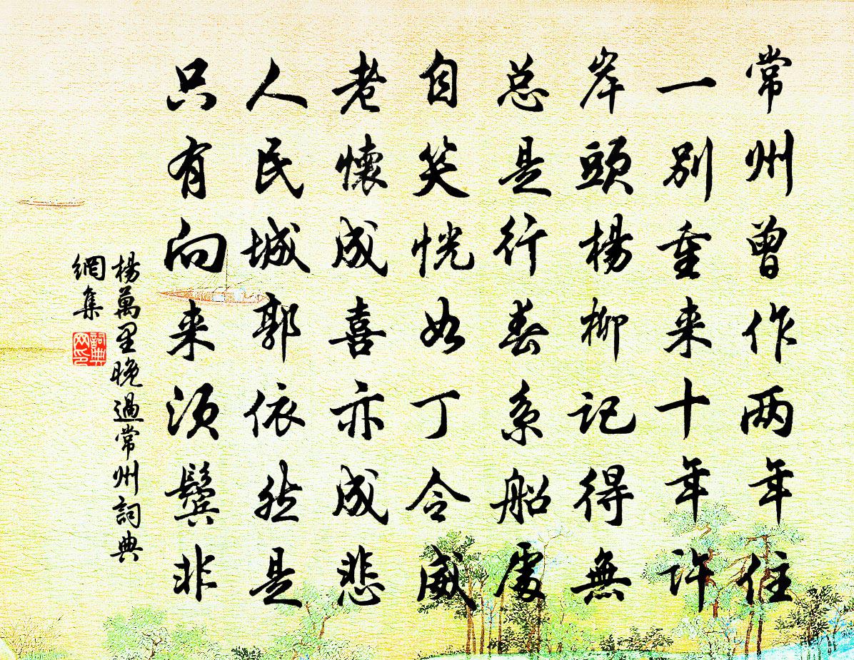詩詞名句歷史字典書法欣賞書法字典國語詞典說文解字康熙字典古漢語字典標 題 作 者 詩 句 晚過常州作者:楊萬里 朝代:宋代晚過常州原文常州曾作兩年住,一別重來十年許。岸頭楊柳記得無,總是行春繫船處。自笑恍如丁令威,老懷成喜亦成悲。人民城郭依然是,只有向來須鬢非。詩詞問答問:晚過常州的作者是誰?答:楊萬里問:晚過常州寫於哪個朝代?答:宋代問:楊萬里的名句有哪些?答:楊萬里名句大全楊萬里晚過常州書法欣賞晚過常州書法作品詩詞推薦送竺甥秀陳著〔宋代〕恭惟吾外祖,盛德表一鄉。身都雲南瑞,一母十郎娘。吾母實居長,鍾愛非尋常。擇婿流俗外,眼高意見長。豈無讀何斯舉黃州秋居雜詠次其韻陸游〔宋代〕夜靜我欲歌,四座且勿喧。堯舜本得道,富貴何足捐?聖人久不作,學者墮語言,著書各專門,百家散如煙。一身菊有黃花為彥逢弟壽王之道〔宋代〕正色憎桃李,凌霜見嫩黃。有同高士操,常占晚秋芳。裊裊金風軟,漙漙玉露光。君恩隆一束,時令應重陽。幸遇屯溪訪故人程永奇〔宋代〕主人溪上宅,烏幾屢曾憑。山直西南向,田分上下層。池鮮熟錦鯉,塘果致青菱。此去重陽近,遙岑共一登。病中逢秋,招客夜酌白居易〔唐代〕不見詩酒客,臥來半月余。合和新藥草,尋檢舊方書。晚霽煙景度,早涼窗戶虛。雪生衰鬢久,秋入病心初。臥簟送皇甫齡宰交河張謂〔唐代〕將軍帳下來從客,小邑彈琴不易逢。樓上胡笳傳別怨,尊中臘酒為誰濃。行人醉出雙門道,少婦愁看七里烽。今日酬海宗二侍者釋重顯〔宋代〕蓀之得蘭,其道匪難。扶吾病起,如珠在盤。一兮二兮,自看誰看。王檢正輓詞樓鑰〔宋代〕到處稱循吏,星軺復郡侯。威名致降虜,恩信感亡牛。省闥主公議,祠庭尋舊遊。善人天不憗,愁絕峴湖秋。送羅季能赴江陵幕李曾伯〔宋代〕幕底從游數月間,孤燈凍飽相嘆。平生得此於人寡,舉世如斯知己難。舍我遽輕千里別,祝君惟有一分寬。楊花正客中懷西湖二首董嗣杲〔宋代〕閒多便可賦詩健,客少應能減酒豪。風雪六橋入圖畫,此身可並南山高。讀素問十六首方回〔宋代〕用針取工巧,用藥稱聖神。伯高不盡言,極藝未易臻。針法今鮮傳,甚於藥 * 。與落庸醫手,寡慾全其身。挽黃夫人王洋〔宋代〕官棲枳棘莫消魂,身吒絲蘿在德門。三後姻聯門戶重,貳卿閱閥德名尊。傷心結蟻靈{乾乞換需}遠,保室鳴鳩道祝英台近·剪鮫綃文廷式〔清代〕剪鮫綃,傳燕語,黯黯碧草暮。愁望春歸,春到更無緒。園林紅紫千千,放教狼藉,休但怨、連番風雨。 謝橋路浣溪沙韓淲〔宋代〕春入疏弦調外聲。雪雲初霽帶湖清。屏溫香軟綺窗深。山倚虛窗情淡淡,水流清淺韻泠泠。斷魂醒處夢難憑。成都遨樂詩二十一首三月十四日太慈寺建乾田況〔宋代〕赤精流景鑠,朱夏向清和。紺宇修祠盛,華封祝慶多。簪裳千載遇,鍾梵五天歌。遠俗尤熙泰,皇猷信不頗。題謝一犁春雨圖趙汝談〔宋代〕久客長安思野人,今年糴貴更愁新。江蕪漠漠春多少,展卷聊尋夢裡身。鷓鴣天元好問〔金代〕復幕重簾錦作天。金荷銀燭夜如年。漢皋解佩終疑夢,緱嶺吹笙恰是仙。花一夢,柳三眠。春風無意惜芳妍。羅裙雜興陸游〔宋代〕倒橐得千錢,從人買釣船。秋風宿村步,暮雪醉江天。得意鷗波外,忘歸雁浦邊。平生笑嚴子,猶有姓名傳。星源縣齋書事喻良能〔宋代〕冬仲弭征轡,欻焉及新春。飽吃番陽飯,細治星源民。星源故自佳,民俗良易馴。不嫌聾丞愚,翻愛假令真。相與芙蓉白玉蟾〔宋代〕臨水翫芙蓉,一花還兩影。上倚夕陽斜,下浸秋波冷。名句推薦青青一樹傷心色,曾入幾人離恨中。白居易《青門柳》 眾鳥高飛盡,孤雲獨去閒。李白《獨坐敬亭山》 今日暫同芳菊酒,明朝應作斷蓬飛。王之渙《九日送別》 一寸柔腸情幾許?薄衾孤枕,夢回人靜,徹曉瀟瀟雨。惠洪《青玉案·絲槐煙柳長亭路》 春風不相識,何事入羅幃。李白《春思》 悵望倚危欄,紅日無言西下。張昪《離亭燕·一帶江山如畫》 明月出海底,一朝開光曜。李白《古風·齊有倜儻生》 朔吹飄夜香,繁霜滋曉白。柳宗元《早梅》 雄州霧列,俊采星馳。王勃《滕王閣序》 波上馬嘶看棹去,柳邊人歇待船歸。溫庭筠《利州南渡》