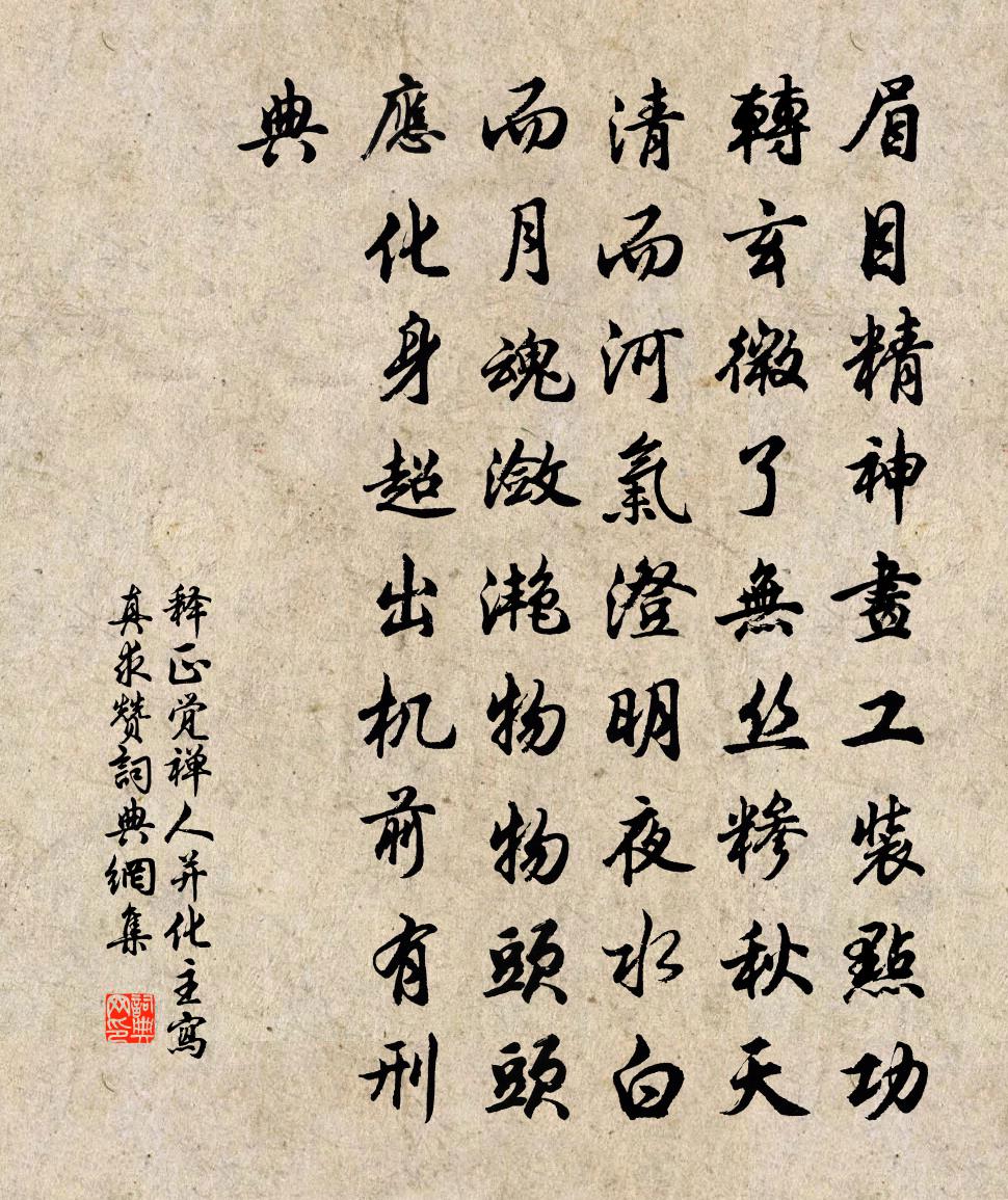 詩詞名句歷史字典書法欣賞書法字典國語詞典說文解字康熙字典古漢語字典標 題 作 者 詩 句 禪人並化主寫真求贊作者:釋正覺 朝代:宋代禪人並化主寫真求贊原文眉目精神,畫工裝點。功轉玄微,了無絲糝。秋天清而河氣澄明,夜水白而月魂瀲灩。物物頭頭應化身,超出機前有刑典。詩詞問答問:禪人並化主寫真求贊的作者是誰?答:釋正覺問:禪人並化主寫真求贊寫於哪個朝代?答:宋代釋正覺禪人並化主寫真求贊書法欣賞禪人並化主寫真求贊書法作品詩詞推薦清明次韻趙登於石〔宋代〕九十春光半晦明,東郊攜手趁新晴。飄零風絮如行客,冷暖廚煙見世情。宿雨鞦韆花有淚,斜陽古冢草無名。勸君桂枝香張炎〔宋代〕甚,余歌美成詞。琴書半室。向桂邊偶然,一見秋色。老樹香遲,清露綴花疑滴。山翁翻笑如泥醉,笑生平、無此柳梢青·紅紫凋零趙師俠〔宋代〕紅紫凋零。化工特地,剪玉裁瓊。碧葉叢芳,檀心點素,香雪團英。柔風喚起娉婷。似無力、斜敧翠屏。細細吹香早發潛水驛謁郎中員外胡曾〔唐代〕半床秋月一聲雞,萬里行人費馬蹄。青野霧銷凝晉洞,碧山煙散避秦溪。樓台稍辨烏城外,更漏微聞鶴柱西。已是好事近(再和)李之儀〔宋代〕上盡玉梯雲,還見一番佳節。惆悵舊時行處,把青青輕折。倚闌人醉欲黃昏,飛鳥望中滅。天面碧琉璃上,印彎彎金城柳楊備〔宋代〕風絮菸絲春復秋,攀條何故淚雙流。煙憐樹老猶青眼,不覺人衰已白頭。貝宮夫人李賀〔唐代〕丁丁海女弄金環,雀釵翹揭雙翅關。六宮不語一生閒,高懸銀牓照青山。長眉凝綠幾千年,清涼堪老鏡中鸞。秋肌句李大力〔宋代〕後院落花人不到,黃鸝飛下石榴陰。偈頌七十六首釋師觀〔宋代〕礙處非牆壁,通處沒虛空。雙關俱透徹,別是一家風。贈蔣德言昆仲三首袁燮〔宋代〕平生無所嗜,耽玩惟古今。以我淺陋質,期於江海深。萬事不掛胸,須臾惜光陰。五夜常自起,簡牘勤披尋。清風老人及兒輩皆和再用前韻陳文蔚〔宋代〕不而繁桃俗杏栽,詩懷端為此花開。自緣祗結冰坷侶,花底渾無欲駕來。題朱慶餘所居賈島〔唐代〕天寒吟竟曉,古屋瓦生松。寄信船一隻,隔鄉山萬重。樹來沙岸鳥,窗度雪樓鍾。每憶江中嶼,更看城上峰。和程教元日韻洪咨夔〔宋代〕曉雲三素過天東,早送韶華入萬紅。枍詣霜寒遲景轉,昆明太液薄澌融。憨痴官事龜生手,泰定天光漆點瞳。柏葉梅鄭谷〔唐代〕江國正寒春信穩,嶺頭枝上雪飄飄。何言落處堪惆悵,直是開時也寂寥。素 * 尊桃莫比,孤香黏袖李須饒。離人北歸再過洞庭張舜民〔宋代〕我家本住長安陌,涇渭交流出坐隅。須信宦遊皆有地,十年四過洞庭湖。潁大夫廟(潁考叔也,廟在汝州潁橋)蘇軾〔宋代〕人情難強回,天性可微感。世人爭曲直,苦語費搖撼。大夫言何柔,暴主意自慘。荒祠旁孤冢,古隧有殘坎。千年讀劉太真碑朱翌〔宋代〕袞衣華藻刻堅珉,下馬來尋剝蘚痕。斷畫豈如弦可續,闕文猶冀石能言。鬣村故址今仍在,螭首遺蹤碎莫存。欲較寄上禮部李侍郎崔峒〔唐代〕吳楚相逢處,江湖共泛時。任風舟去遠,待月酒行遲。白髮常同嘆,青雲本要期。貴來君卻少,秋至老偏悲。玉佩雨夜感舊陸游〔宋代〕雨來猛打窗,燈暗猶照壁。老人耿不寐,撫事悲夙昔。風生桔柏渡,馬病金牛驛。裊枝猿下飲,登樹熊自擲。危巢再次前韻寄楊德逢王安石〔宋代〕一雨洗炎蒸,曠然心志適。如輸浮幢海,滅火十八隔。俯觀風水涌,仰視電雲坼。知公開霽後,過我言不食。翻愁名句推薦綠楊帶雨垂垂重。五色新絲纏角粽。歐陽修《漁家傲·五月榴花妖艷烘》 酒不醉人人自醉,色不迷人人自迷。馮夢龍《警世通言·卷二十四》 越人語天姥,雲霞明滅或可睹。李白《夢遊天姥吟留別 / 別東魯諸公》 相思難表,夢魂無據,惟有歸來是。歐陽修《青玉案·一年春事都來幾》 古人忠孝,不離心頭,今人忠孝,不離口頭,此是何等志量。王永彬《圍爐夜話·第二三則》 八佾舞於庭,是可忍也,孰不可忍也?孔子弟子《論語·八佾篇》 闌乾倚遍重來憑。淚粉偷將紅袖印。歐陽修《玉樓春·去時梅萼初凝粉》 風煙俱淨,天山共色。吳均《與朱元思書》 尋思不似鵲橋人,猶自得、一年一度。趙以夫《鵲橋仙·富沙七夕為友人賦》 貞女貴徇夫,捨生亦如此。孟郊《列女操 / 烈女操》
