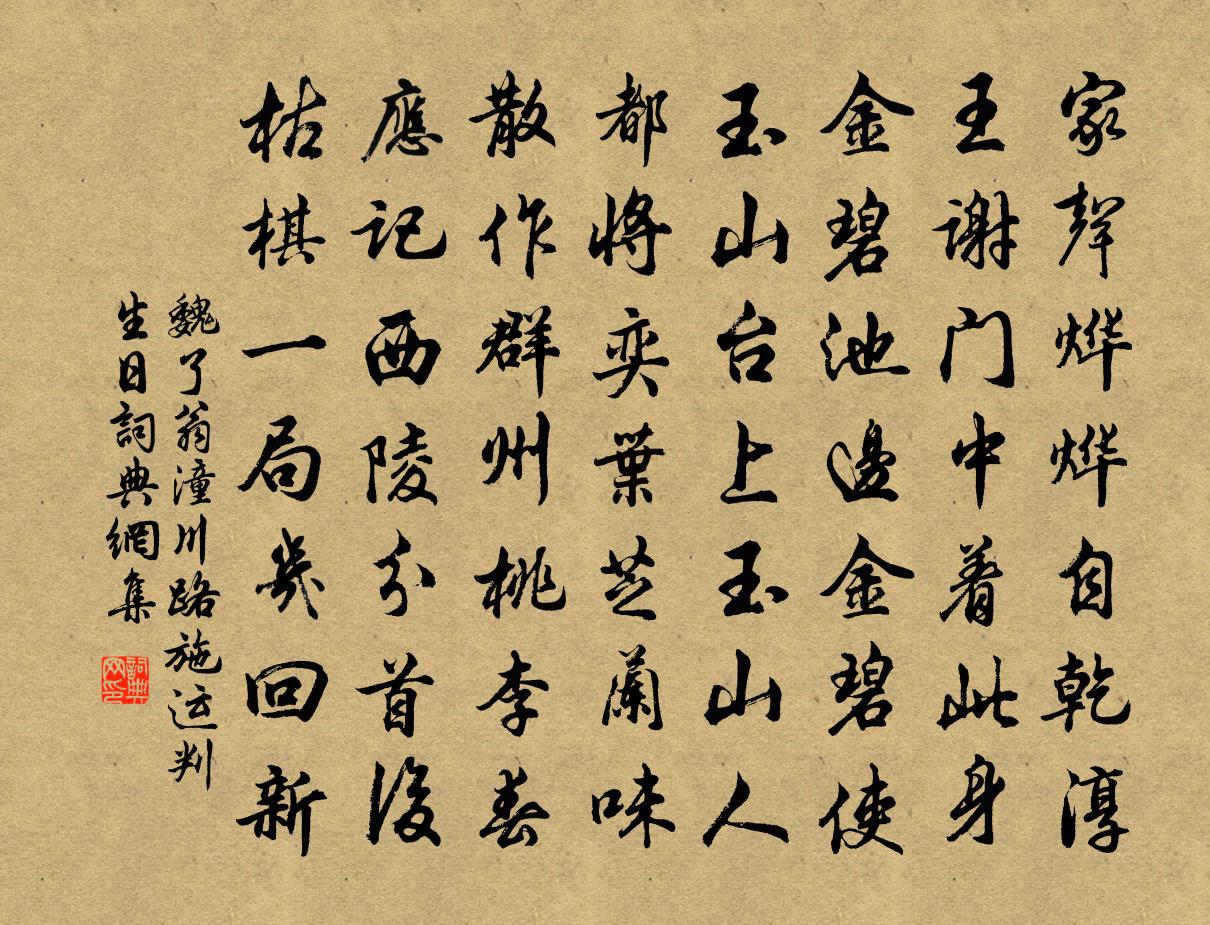 詩詞名句歷史字典書法欣賞書法字典國語詞典說文解字康熙字典古漢語字典標 題 作 者 詩 句 潼川路施運判生日作者:魏了翁 朝代:宋代潼川路施運判生日原文家聲燁燁自乾淳,王謝門中著此身。金碧池邊金碧使,玉山台上玉山人。都將奕葉芝蘭味,散作群州桃李春。應記西陵分首後,枯棋一局幾回新。詩詞問答問:潼川路施運判生日的作者是誰?答:魏了翁問:潼川路施運判生日寫於哪個朝代?答:宋代魏了翁潼川路施運判生日書法欣賞潼川路施運判生日書法作品詩詞推薦贈王典史五首熊禾〔宋代〕我愛熙然翁,識暢度亦夷。飾政必以儒,公餘只吟詩。利慾膠盆中,三嘆斯人希。安得公伯輩,萬宇陽春熙。姑蘇台陳允平〔宋代〕高樓三百尺,落日幾登臨。越國一嘗膽,吳娃頻捧心。野猿窺磷火,宮燕語秋霖。坐久忽聞笛,五湖煙水深。即事晁說之〔宋代〕幾歲田園得隱淪,忍將秋淚濕紅塵。一麾不得廬山去,何用他州寄此身。題汶藏主行巷釋雲岫〔宋代〕玲瓏岩畔看雲處,帢幘峰頭步月時。一句庭前柏樹子,何曾吟作五言詩。皇帝閣立春帖子王曾〔宋代〕北陸凝陰盡,千門淑氣新。年年金殿里,實字貼宜春。燕白玉蟾〔宋代〕新巢故園兩依依,似與春花秋葉期。雨過池塘得泥跡,日高台榭捲簾遲。鞦韆節後初相見,祓禊人歸有所思。雙侶題如夢堂壁范成大〔宋代〕勃姑午啼喚雨,鵯鵊曉囀留春。片雲不載歸夢,兩鬢全供客塵。送黃元吉陳傅良〔宋代〕荷君來意固非因,曾未深交意便傾。語到七篇無欠少,學從三畫已分明。每懷前此傷標置,頗欲從今近老成。為謝偈傾一百六十九首釋智朋〔宋代〕禮自已佛,燒自已香。容顏甚奇妙,光明照十方。游山白玉蟾〔宋代〕廬山山下倒芳樽, * 人家煙水村。千尺雲崖春上蘚,幾重月樹夜啼猿。人騎黃鶴去不返,草沒丹爐今尚存。攜子宿杳瀨楊萬里〔宋代〕寒流一帶檻前橫,落日諸峰霞外明。水斷新洲添五里,客尋舊路卻重行。江車自轉非人蹈,沙碓長舂徹夜鳴。疇昔和李倅游武夷楊時〔宋代〕濃淡煙鬟半雨晴,溪光初借晚霞明。鰲頭湧出三峰秀,天漢融成一鑒清。枌社有誰藏舊牒,賓雲無處問遺聲。幔亭初夏丘葵〔宋代〕一信楝花風,一年春事空。池荷還揭揭,櫻筍又匆匆。空嘆時光換,誰知造化工。盡將枝上色,並作石榴紅。送潮陽李孜主簿陳堯佐〔宋代〕潮陽山水東南奇,魚鹽城郭民熙熙。當時為撰玄聖碑,而今風俗鄒魯為。詠史下唐太宗陳普〔宋代〕文皇仁義播敷天,李氏無倫三百年。末路荒唐如煬帝,蜀江更起度遼船。木蘭花慢(送鄭伯昌)范成大〔宋代〕古人吾不見,君莫是、鄭當時。更築就山房,躬耕谷口,名動京師。諸公任他袞袞,與杜陵野 * 襟期。有客至門二月九日訪仰之聞德茂與婿鄧叔厚蚤作逍遙溪王洋〔宋代〕貪閒心不受囂塵,六十年餘自在身。愛水愛山三益友,如冰如玉兩閒人。言無拘畏詩多健,酒借豪華力有神。聞說登騎石山黃汝嘉〔宋代〕一亭平倚此山巔,展盡郊原極目天。高下樓台微帶雨,參差樹木遠含煙。品題物象詩聯軸,管領江山酒滿船。官冗生公講台殷堯藩〔唐代〕暝色護樓台,陰雲晝未開。一塵無處著,花雨遍蒼苔。哨遍劉克莊〔宋代〕日,遊方氏龍山別墅,試效顰為之,俾主人刻之崖石雲。勝處可宮,平處可田,泉土尤甘美。深復深,路絕住人稀名句推薦狐死首丘,代馬依風。范曄《後漢書·列傳·班梁列傳》 廢一善,則眾善衰。賞一惡,則眾惡歸。黃石公《三略·下略》 百年歌自苦,未見有知音。杜甫《南征》 綠竹入幽徑,青蘿拂行衣。李白《下終南山過斛斯山人宿置酒》 城小賊不屠,人貧傷可憐元結《賊退示官吏》 歸夢寄吳檣。水驛江程去路長。陸游《南鄉子·歸夢寄吳檣》 至今思項羽,不肯過江東。李清照《夏日絕句》 今人嗤點流傳賦,不覺前賢畏後生。杜甫《戲為六絕句》 君有妒臣,則賢人不至。荀子《荀子·大略》 時危見臣節,世亂識忠良。鮑照《代出自薊北門行》