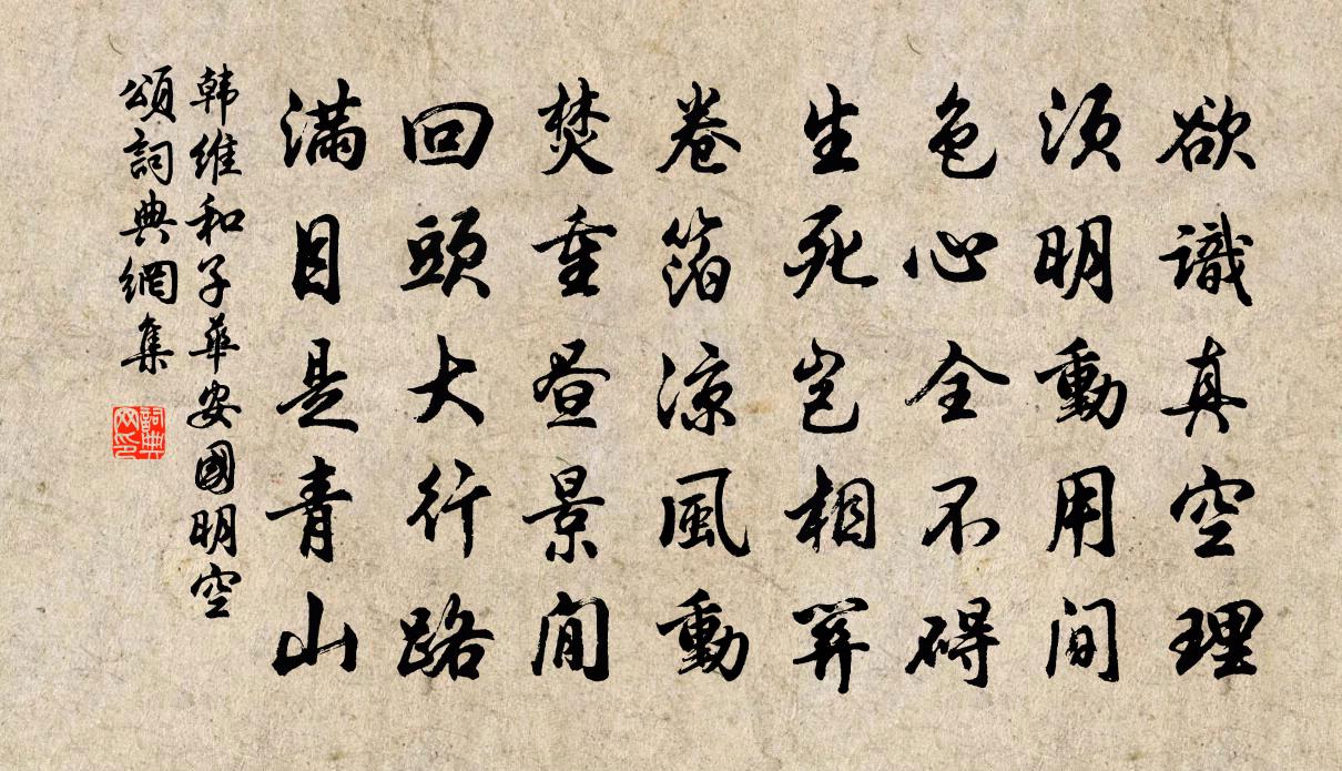 詩詞名句歷史字典書法欣賞書法字典國語詞典說文解字康熙字典古漢語字典標 題 作 者 詩 句 和子華安國明空頌作者:韓維 朝代:宋代和子華安國明空頌原文欲識真空理,須明動用間。色心全不礙,生死豈相關。卷箔涼風動,焚重晝景閒。回頭大行路,滿目是青山。詩詞問答問:和子華安國明空頌的作者是誰?答:韓維問:和子華安國明空頌寫於哪個朝代?答:宋代韓維和子華安國明空頌書法欣賞和子華安國明空頌書法作品詩詞推薦頌證道歌證道歌釋印肅〔宋代〕若將妄語誑眾生,永劫不來世上行。無縫塔中非相貌,劈頭坐卻老盧能。題覺心居士轉物軒釋大觀〔宋代〕兩沼灎寒碧,一堂納寬閒。高柳逢春新翠展,寒梅齊雪清香繁。好本栽培常爛熳,四序芳馨看互換。雜華境遍剎塵醉和范景仁賦子華東軒樹次其韻梅堯臣〔宋代〕樹影落東牆,影微人已醉。休看枝上綠,但對眉間翠。故南陽夫人樊氏輓歌王維〔唐代〕石[簾,“卯”代“巾”]恩榮重。金吾車騎盛。將朝每贈言。入室還相敬。疊鼓秋城動。懸旌寒日映。不言長不念奴嬌(八月十三夜,與宋卿對月賞桂花于光遠庵,和李漢老詞)佚名〔宋代〕素秋向晚,正洞庭木落,疏林凋綠。惟有岩前雙桂樹,翠葉香浮金粟。皓月飛來,徘徊樹杪,光射林間屋。夜深人次謝景思韻曾惇〔宋代〕埋沒雙岩已百年,班班勝事漫流傳。幸陪佳客揮犀塵,實欠傾城舞繡筵。故老風流寒似鐵,月卿英妙筆如椽。拂衣昭君怨(亦名宴西園)侯置〔宋代〕晴日烘香花睡。花艷浮杯人醉。楊柳綠絲風。水溶溶。留戀芳叢深處。懶上錦韉歸去。待得牡丹開。更同來。客愁陸游〔宋代〕騎馬出門無所詣,端居正爾客愁侵。蒼顏白髮入衰境,黃卷青燈空苦心。天下極知須雋傑,書生何恨死山林。消磨山齋史堯弼〔宋代〕禱公一邱壑,何似東山起。可憐丹青手,置之岩石里。自縣圃行梅化因成五絕王洋〔宋代〕我家阿大才名久,老筆能旋萬斛舟。竹外試題清淺句,莫教何遜獨風流。【中呂】賣花聲張可久〔元代〕席上半泓秋水金星硯,一幅寒雲玉版箋,美人索賦《鷓鴣天》。瓊杯爭勸,珠簾高卷,燕歸來海棠庭院。偶題落花方廣聖燈次敬夫韻林用中〔宋代〕燈長三世火長明,千里遺蹤子細尋。自是神光能永夜,不妨金偈更降心。村舍雜興陸游〔宋代〕堅臥非由病,端居不是齋。世情元自薄,人事固多乖。晨飯炊稊米,宵行點豆秸。昔人言可用,第一忌安排。蘇幕遮佚名〔宋代〕不憂貧,不戀富。大悟之人,開著波羅鋪。內有真如無價實,欲識真如,正照菩提路。貪愛心,須除去。清淨法身絕句二首張耒〔宋代〕晴江水滿長菰蒲,野鴨鵁鶄欲哺雛。誰為寄聲沙塞雁,春來朔野定如何。和子野見寄十二辰體仇遠〔宋代〕良工鼠須筆,戢戢囊潁露。抄詩節經史,汗牛車載路。信知文中虎,一代人不數。細聲笑蚯蠅,妙趣忘魚兔。東野句錢惟演〔宋代〕思滿離亭酒,魂驚客舍烏。霜天曉角(梅花)黃機〔宋代〕玉粲冰寒。月痕侵畫欄。客里安愁無地,為徙倚、到更殘。問花花不言。嗅香香欲闌。消得個溫存處,山六曲、翠四月末天氣陡然如秋遂御祫衣游北沙亭觀江漲黃庭堅〔宋代〕沙岸人家報急流,船官解纜正夷猶。震雷將雨度絕壑,遠水粘天吞釣舟。甚欲去揮白羽箑,可堪更著紫茸裘。平生嘉定二年秋重遊洞霄宮胡榘〔宋代〕重尋九鎖躡丹梯,回首空驚歲月移。風虎守閽寧易到,冰龍候路卻先馳。松筠老去俱全節,猿鶴迎來盡故知。更拂名句推薦玉屏風冷愁人。醉爛漫、梅花翠雲。吳文英《柳梢青·與龜翁登研意觀雪懷癸卯歲臘朝斷橋並馬之游》 斑騅只系垂楊岸,何處西南任好風。李商隱《無題·鳳尾香羅薄幾重》 豈曰無衣?與子同袍。佚名《秦風·無衣》 今日漢宮人,明朝胡地妾。李白《王昭君二首》 溪壑可盈,志欲無滿。姚察、姚思廉《梁書·列傳·卷五十三》 望處雨收雲斷,憑闌悄悄,目送秋光。柳永《玉蝴蝶·望處雨收雲斷》 怎不思量,除夢裡、有時曾去趙佶《宴山亭·北行見杏花》 龍吟虎嘯一時發,萬籟百泉相與秋李頎《聽安萬善吹觱篥歌》 秋色到空閨,夜掃梧桐葉。夏完淳《卜運算元·秋色到空閨》 壯歲旌旗擁萬夫,錦襜突騎渡江初。辛棄疾《鷓鴣天·有客慨然談功名因追念少年時事戲作》