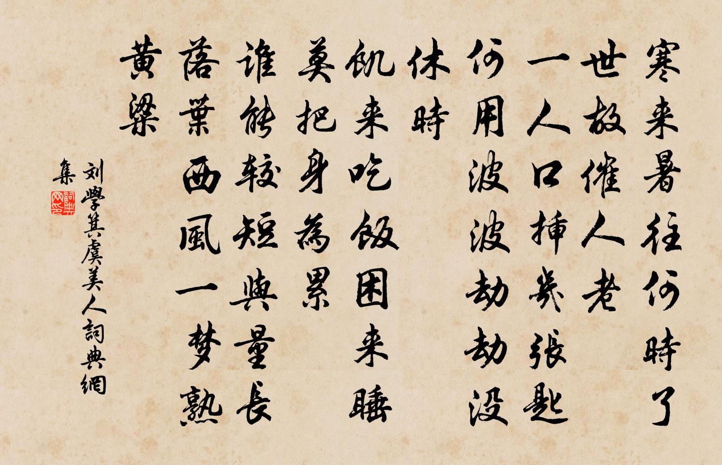 詩詞名句歷史字典書法欣賞書法字典國語詞典說文解字康熙字典古漢語字典標 題 作 者 詩 句 虞美人作者:劉學箕 朝代:宋代虞美人原文寒來暑往何時了。世故催人老。一人口插幾張匙。何用波波劫劫、沒休時。飢來吃飯困來睡。莫把身為累。誰能較短與量長。落葉西風一夢、熟黃粱。詩詞問答問:虞美人的作者是誰?答:劉學箕問:虞美人寫於哪個朝代?答:宋代問:虞美人是什麼體裁?答:詞劉學箕虞美人書法欣賞虞美人書法作品詩詞推薦石鼓寺晚歸李新〔宋代〕野鳥音喧豗,蒼欒翠轇轕。冷光雪色陵雲端,亂流江勢侵天末。蒙衲老僧初睡美,倚榻陂龍暗搖恬。竹庵虎子呼未和李端叔大夫從參寥子游許昌西湖十絕李廌〔宋代〕百物爭春竟可憐,清池綠淨但沉天。浮萍細碎從渠長,憎見差池點荇錢。東坡秋意,寄元八白居易〔唐代〕寥落野陂畔,獨行思有餘。秋荷病葉上,白露大如珠。忽憶同賞地,曲江東北隅。秋池少遊客,唯我與君俱。啼蛩失調名應傃〔宋代〕橫斜淡月黃昏,漏泄早春訊息。寄沈時仲李洪〔宋代〕論交肺腑獨深知,手札勤渠慰我思。郭泰墊巾頻念舊,休文減帶最能詩。常懷勝集無三友,坐想高談彼一時。明月使君席夜送嚴河南赴長水(得時字)岑參〔唐代〕嬌歌急管雜青絲,銀燭金杯映翠眉。使君地主能相送,河尹天明坐莫辭。春城月出人皆醉,野戍花深馬去遲。寄聲題無為秀溪亭王之道〔宋代〕畫橋雕檻接招提,新有幽人榜秀溪。十頃淨明天上下,兩奩光映水東西。飛樓涌殿參差見,古木修篁咫尺迷。此景全州礲岩陳峴〔宋代〕泉流縈帶戛冰玉,石壁深窈寒侵衣。開鑿應勞造化力,窟宅如待靈仙歸。松吳可〔宋代〕秋色何妨陪露菊,歲寒真欲友霜筠。只應澗底桃花笑,苦愛微官不避秦。塞上曲周朴〔唐代〕一陣風來一陣砂,有人行處沒人家。黃河九曲冰先合,紫塞三春不見花。踏莎行(賀宗人熙甫赴任)汪夢斗〔宋代〕選得官歸,黃埃滿面。難於奏賦明光殿。秋帆落日渡淮來,三杯酒濁憑誰勸。舊日佳詞,自吟一遍。綠袍不是嫦娥遊仙詞三十三首王鎡〔宋代〕金甲雷丁出巽宮,丹幢翠節擁靈童。五更飛去雌雄劍,一夜鹽池碧水紅。三斷石楊修〔宋代〕孫吳紀德舊刊碑,埋沒蟠螭與伏龜。惆悵石岡三斷在,至今猶似鼎分時。藍橋送客回謁張郎中鄭獬〔宋代〕都無歌管伴金杯,草草藍橋送客回。寒雨飄零不成雪,剡溪閒訪戴逵來。玩丹砂 起慈悲馬鈺〔元代〕馬鈺常憑佛作為。無為心內起慈悲。尋聲救苦做行持。一切女男如父母,見他生死十分危。須當立個上天梯。贈爭相士三首姚勉〔宋代〕人生有子萬事足,不問官稱有與無。老子希文何事好,踏渠腳步得堯夫。贈陰陽家鄧彬叔曾豐〔宋代〕舌本瀾翻郭璞書,試今措手驗何如。星辰聚處收玄武,江漢潮邊避尾閭。山水流形開闔後,陰陽受氣混淪初。要參採桑子納蘭性德〔清代〕冷香縈遍紅橋夢,夢覺城笳。月上桃花,雨歇春寒燕子家。箜篌別後誰能鼓,腸斷天涯。暗損韶華,一縷茶煙透碧對雪獻薛常侍韋莊〔唐代〕瓊林瑤樹忽珊珊,急帶西風下晚天。皓鶴褵褷飛不辨,玉山重疊凍相連。松裝粉穗臨窗亞,水結冰錐簇溜懸。門外徐家莊張堯同〔宋代〕節義窮方見,高名薦玉京。一封天子敕,千載故鄉榮。名句推薦言不中,行不謹,辱也。王通《中說·卷一·王道篇》 縱使有花兼有月,可堪無酒又無人。李商隱《春日寄懷》 曉看紅濕處,花重錦官城。杜甫《春夜喜雨》 一樹斜陽蟬更咽,曾綰灞陵離別納蘭性德《淡黃柳·詠柳》 白馬黃金塞,雲砂繞夢思。李白《塞下曲六首》 日上,正赤如丹,下有紅光,動搖承之。姚鼐《登泰山記》 賞賜不能喜,誅罰不能威。墨子《墨子·05章 七患》 酒市漸閒燈火,正敲窗、亂葉舞紛紛。孔夷《南浦·旅懷》 秋天一夜靜無雲,斷續鴻聲到曉聞。張仲素《秋閨思二首》 井中之無大魚也,新林之無長木也。呂不韋《呂氏春秋·覽·有始覽》