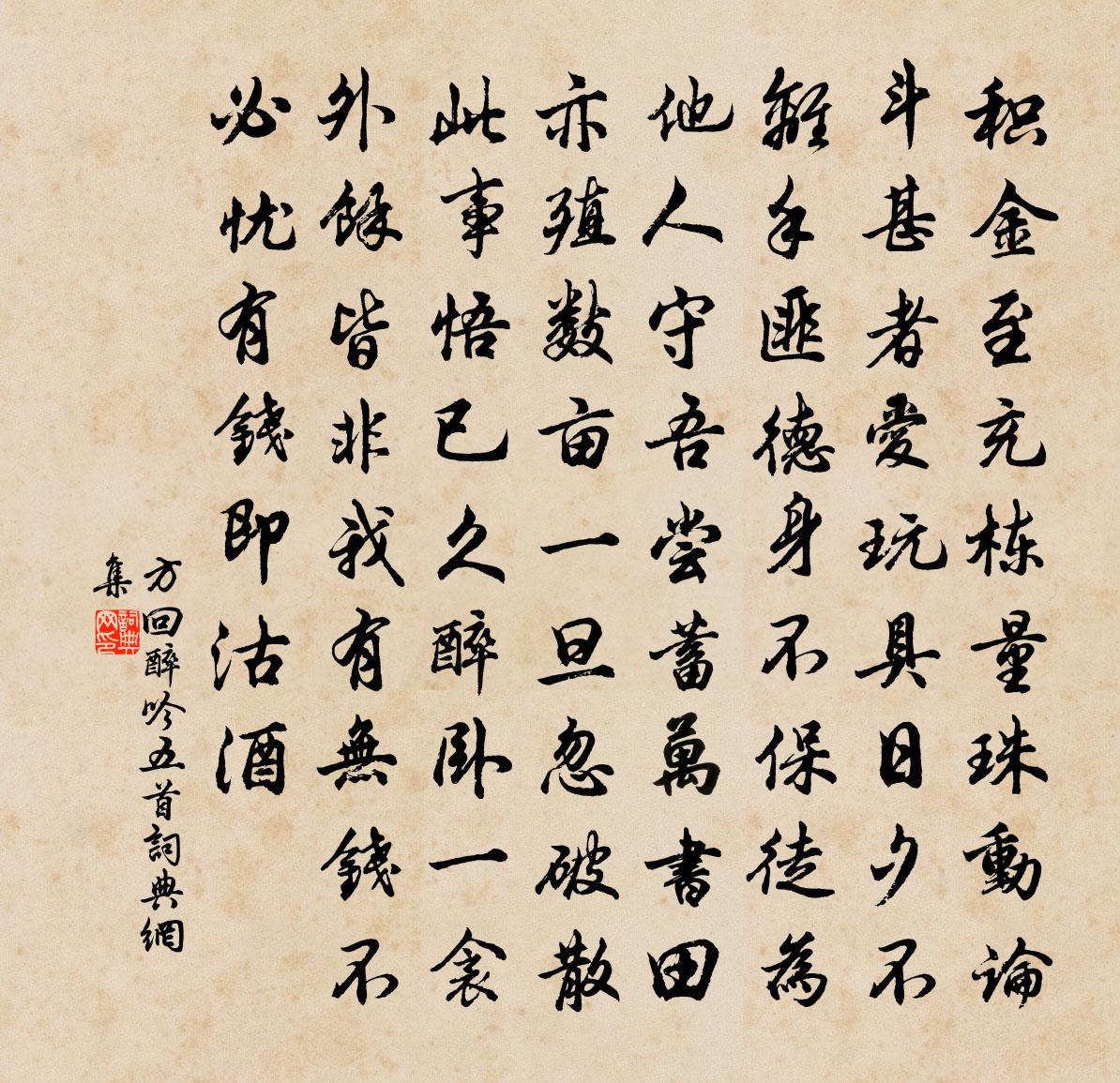 詩詞名句歷史字典書法欣賞書法字典國語詞典說文解字康熙字典古漢語字典標 題 作 者 詩 句 醉吟五首作者:方回 朝代:宋代醉吟五首原文積金至充棟,量珠動論斗。甚者愛玩具,日夕不離手。匪德身不保,徒為他人守。吾嘗蓄萬書,田亦殖數畝。一旦忽破散,此事悟已久。醉臥一衾外,余皆非我有。無錢不必憂,有錢即沽酒。詩詞問答問:醉吟五首的作者是誰?答:方回問:醉吟五首寫於哪個朝代?答:宋代方回醉吟五首書法欣賞醉吟五首書法作品詩詞推薦銅瓶杜甫〔唐代〕亂後碧井廢,時清瑤殿深。銅瓶未失水,百丈有哀音。側想美人意,應非寒甃沉。蛟龍半缺落,猶得折黃金。初到曲江六首朱翌〔宋代〕昭代人無棄,遐方住亦堪。司分大火舍,官作世南男。守拙休心匠,忘憂縱手談。平生不喜鬧,所欠一茅庵。次韻岩起綠萼梅李彌遜〔宋代〕村上未聞睍睆,杯中初薦屠酥。誰遣雲英萼綠,臨風搖曳輕裾。何先生月湖樓鄧深〔宋代〕青天素月古今流,奇觀還須自我謀。照有餘輝眾人共,取之不禁此湖收。水容天色交光處,玉鑒冰壺不夜秋。俯仰和紫岩老雪中觀梅吳芾〔宋代〕清寒地館靜沉沉,慘澹江梅弄晚陰。雪裡有誰能載酒,花前無語自傷心。低枝似欲迎人笑,清賞何妨倚樹吟。況有重遊楚國寺趙嘏〔唐代〕往事飄然去不回,空餘山色在樓台。池塘風暖雁尋去,松桂寺高人獨來。莊叟著書真達者,賈生揮涕信悠哉。老僧臘中得雪快晴成古風呈堯章銛老王炎〔宋代〕蒼頭熟睡喚不應,光射紙窗疑月明。更籌可數夜方半,杙上一雞先誤鳴。曉起飛花堆戶外,幻出人間無 * 。九街大暑同蔣明亞叟熙載夜登清微亭傅察〔宋代〕土潤伏新金,陽歊困亭午。曦御駐片驂,朱光徹厚土。鳥雀噪階除,蛙蚓鳴草莽。簿領抗塵容,茅檐庇環堵。蜂蠆章獻明肅皇太后恭謝太廟佚名〔宋代〕懿彼靈龜,在宮之池。芳蓮是吃,千歲奇資。裸將清廟,播於聲詩。神降之吉,永保壽祺。聲聲慢 贈王彥寶劉志淵〔元代〕癭除人我,冰冷高低,喚惺今是昨非。檢教靈質,枉受萬劫沉迷。況遇真風大闡,要諸仙、選陀名題。顯一志,敢詠史詩大澤胡曾〔唐代〕白蛇初斷路人通,漢祖龍泉血刃紅。不是鹹陽將瓦解,素靈那哭月明中。西江月吳儆〔宋代〕山色不隨春老,竹枝長向人新。桃蹊李徑已成陰。深院鶯啼人靜。塵世白駒過隙,人情蒼狗浮雲。不須計較謾勞神華山上方裴說〔唐代〕獨上上方上,立高聊稱心。氣沖雲易黑,影落縣多陰。有雲草不死,無風松自吟。會當求大藥,他日復追尋。寄征人廉氏〔唐代〕淒淒北風吹鴛被,娟娟西月生蛾眉。誰知獨夜相思處,淚滴寒塘蕙草時。重陽日有作杜荀鶴〔唐代〕一為重陽上古台,亂時誰見菊花開。偷撏白髮真堪笑,牢鎖黃金實可哀。是個少年皆老去,爭知荒冢不榮來。大家楊仲子攜詩見過次韻酬贈並呈誠齋二首張鎡〔宋代〕老監過陳實,賢郎似竇群,共將奇句了,不許外人分。訪我三竿日,縈檐一炷雲。當家相見處,那此世情欣。上已領客魏了翁〔宋代〕流觴元已奚所因,更指三日為良辰。山陰坐上皆豪逸,長安水邊多麗人。臨流有許豪與麗,元無一個能知津。韓嬰甲午年正月初四日得春王冕〔元代〕昨宵嫌凍雨,今日喜春風。野草浮新綠,園花結小紅。漸將農事動,無奈病魔攻。向晚登高望,江山杳靄中。訴衷情(中秋微雨,入夜開霽,呂履謙座上賦此)袁去華〔宋代〕曉來猶自雨冥冥。投晚卻能晴。姮娥為誰著意,洗得十分明。人自老,兔長生。酒徐傾。杯行到手,休更推辭,轉予長女歸叔尚偕往江津作詩送之晁公溯〔宋代〕薛郎吾嬌客,昨肯過彭濮。相從雖雲久,一歲如轉燭。外堂忽有請,歸駕行當促。自稱先君子,嗣以病家督。焉能名句推薦花氣襲人知驟暖,鵲聲穿樹喜新晴。陸游《村居書喜》 惟心會而不可口傳,可神通而不可語達。曹雪芹《紅樓夢·第五回》 疏籬下、試覓重陽,醉擘青露菊。吳文英《一寸金·秋感》 德彌盛者文彌縟,德彌彰者人彌明。王充《論衡·卷二十八·書解篇》 檳榔無柯,椰葉無陰。左思《三都賦》 君子戰雖有陳,而勇為本焉。墨子《墨子·02章 修身》 帆影依依楓葉外,灘聲汩汩碓床間查慎行《雨過桐廬》 庫無備兵,雖有義,不能征無義。墨子《墨子·05章 七患》 志不可不高,志不高,則同流合污,無足有為矣王永彬《圍爐夜話·第三十則》 苕之華,其葉青青。佚名《苕之華》
