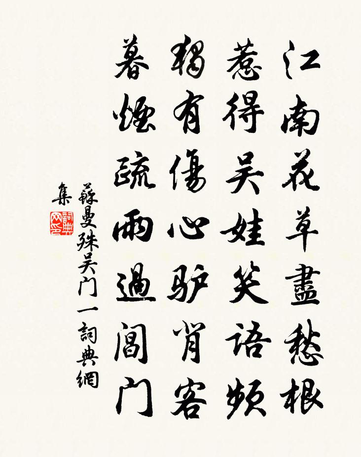 詩詞名句歷史字典書法欣賞書法字典國語詞典說文解字康熙字典古漢語字典標 題 作 者 詩 句 吳門 一作者:蘇曼殊 朝代:近現代吳門 一原文江南花草盡愁根,惹得吳娃笑語頻。獨有傷心驢背客,暮煙疏雨過閶門。詩詞問答問:吳門 一的作者是誰?答:蘇曼殊問:吳門 一寫於哪個朝代?答:近現代書法欣賞吳門 一書法作品詩詞推薦沁園春(壽春陵史君叔)蕭仲芮〔宋代〕五馬南來。一騎東馳,詔黃已催。正尋幽擇勝,閒邊點檢,吟風弄月,忙處徘徊。玉井蓮房,碧筒酒熟,趁得長年和李憲使吳泳〔宋代〕關上青牛去,林間白鶴歸。月函書味澹,霜浸道根肥。草樹連生色,魚梁閟殺機。晚年偏好易,落處是 * 。春日雪酬潘孟陽回文權德輿〔唐代〕酒杯春醉好,飛雪晚庭閒。久憶同前賞,中林對遠山。游大滌山陳宗古〔宋代〕洞天三十六,奇邃此無儔。笙鶴有時下,神仙何處游。岩花自照水,谷鳥不啼秋。盡日松陰底,閒聽寒澗流。偈十首釋慧暉〔宋代〕外罷諸緣絕言語,內無喘息合幽玄。心如牆壁忘功處,以入道源空劫前。湯壽鄉察推寫真求贊釋正覺〔宋代〕形儀潦倒,氣貌寒槁。野雲自閒,岩樹誰老。性元靜而妙存,體本真而空了。幻世應諸緣,荒田不揀草。風煙望斷漢陰庭樹趙嘏〔唐代〕掘溝引水澆蔬圃,插竹為籬護藥苗。楊柳如絲風易亂,梅花似雪日難消。曉行聞竹雞二首楊萬里〔宋代〕一番行路一番愁,還自兒時到白頭。路不喚君君自去,為誰著急不歸休。對酒行曹植〔魏晉〕蒲鞭葦杖示有刑。次韻李侯喜雨牟巘五〔宋代〕誰似當年召信臣,天教來此活疲民。水鄉怕旱相傳古,甘澍隨車總是春。坐看豐登成樂歲,只將愷悌對明神。已聞寄謝三井山禱雨二首陳襄〔宋代〕曾禱神龍井,雲林杳莽間。苹蘩朝薦廟,風雨夜離山。百里田疇熟,一年囹圄間。因循失報謝,石險路難攀。陪范明府與諸同官飲新亭是夕以莞爾榜之因賦林亦之〔宋代〕把燭新亭下,迂疎聊爾歌。酒緣人品勝,官要野情多。燕豆客俱好,漁竿人亦過。誰知武城笑,深自惜蹉跎。古興權德輿〔唐代〕月中有桂樹,無翼難上天。海底有龍珠,下隔萬丈淵。人生大限雖百歲,就中三十稱一世。晦明烏兔相推遷,雪霜詠懷阮籍〔魏晉〕二妃游江濱,逍遙順風翔。交甫懷環佩,婉孌有芬芳。猗靡情歡愛,千載不相忘。傾城迷下蔡,容好結中腸。感激將歸贈孟東野房蜀客(蜀客名次卿)韓愈〔唐代〕君門不可入,勢利互相推。借問讀書客,胡為在京師。舉頭未能對,閉眼聊自思。倏忽十七年,終朝苦寒飢。宦途用李參政韻並錄寄舟峰師四首曹勛〔宋代〕海色琉璃照我肝,何疑飛電掣晴岩。山留畫鷁風從怒,珠炯翔龍夜亦銜。蓮社經徒能能摘句,玉川茶興自開緘。從和張倅唐英詠梅十四首陳傅良〔宋代〕花芳以養性,花陰以休影。更欲從旁謀,種秫可半頃。沖寒時一觴,我醉花獨醒。醉醒兩相忘,久矣系歸艇。奉和翁千四知千十四隱居山中作徐璣〔宋代〕翁侯兩兄弟,志尚等高獨。閒心沒江鷗,逸興狎山鹿。難兄早登第,高風動喬木。湘南琴滿汀,百里正膏沐。歸作夜賦陸游〔宋代〕練色亭皋月,江聲木杪風。開書燈煜煜,傳漏鼓冬冬。流落諸生老,呻吟四壁空。生涯君勿笑,淡話有兒同。歸來曲侯善淵〔元代〕虛無道,元*自相和。玄覽滌除賢士少,合塵背覺俗徒多。終日謾蹉跎。開法眼,一性貫娑婆。瑩淨淨髮秋月冷,名句推薦聲無小而不聞,行無隱而不形。荀子《荀子·勸學》 不知命,無以為君子也;不知禮,無以立也;不知言,無以知人也。孔子弟子《論語·堯曰篇》 家貧則思良妻,國亂則思良相司馬遷《史記·魏世家》 紅臉青腰,舊識凌波女。晏幾道《蝶戀花·笑艷秋蓮生綠浦》 將壇醇酒冰漿細,元夜邀賓燈火新。趙時春《元宵飲陶總戎家二首》 江南幾日又天涯,誰與寄相思?董士錫《木蘭花慢·武林歸舟中作》 此路無知己,明珠莫暗投。高適《送魏八》 天外鳳凰誰得髓?無人解合續弦膠。杜牧《讀韓杜集》 吳姬越艷楚王妃,爭弄蓮舟水濕衣。王昌齡《採蓮曲二首》 末路驚風雨,窮邊飽雪霜文天祥《除夜》