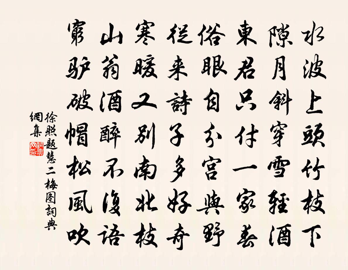 詩詞名句歷史字典書法欣賞書法字典國語詞典說文解字康熙字典古漢語字典標 題 作 者 詩 句 題慧二梅圖作者:徐照 朝代:宋代題慧二梅圖原文水波上頭竹枝下,隙月斜穿雪輕酒。東君只付一家春,俗眼自分宮與野。從來詩子多好奇,寒暖又別南北枝。山翁酒醉不復語,窮驢破帽松風吹。詩詞問答問:題慧二梅圖的作者是誰?答:徐照問:題慧二梅圖寫於哪個朝代?答:宋代徐照題慧二梅圖書法欣賞題慧二梅圖書法作品詩詞推薦御舟應制曹勛〔宋代〕玉蓮翠葉粲成川,十里湖光碧浸天。桂楫壓波橫斷浦,鉤簾絲管接薰弦。寄題君山亭送呂天衢秀才蔡肇〔宋代〕百川赴下流,江海互吞吐。回瀾薄空日,老岸不立土。坡陀出巨石,鰲背啟窗戶。我來俯凝碧,萬頃過微雨。南沙陸宣城輓詞樓鑰〔宋代〕奕世承家學,諸公薦吏能。政傳花縣美,心與練江澄。易簀去何遠,攀轅悲不勝。傷哉嬴博葬,淚盡老延陵。賦得池上雙丁香樹錢起〔唐代〕得地移根遠,交柯繞指柔。露香濃結桂,池影斗蟠虬。黛葉輕筠綠,金花笑菊秋。何如南海外,雨露隔炎洲。禪人並化主寫真求贊釋正覺〔宋代〕山高早雪,水深先秋。功勳極處退一步。黑白前時贏一籌。相隨來也還知否,南北東西得自由。步虛陸游〔宋代〕一瓢小如繭,芳醪溢其中,醉此一市人,吾瓢故無窮。不言術神奇,要是心廣大;觴豆有德色,笑子乃爾隘。岳陽六月二十四日秋夜書方回〔宋代〕昨朝交末伏,今日立新秋。故是涼猶未,終須熱漸休。酒醒興午夜,月上倚西樓。暍死端能免,江天問去舟。乞雨題四方院蔡襄〔宋代〕年年乞雨問山神,羞見耕耘隴上人。太守自知才德薄,彼蒼何事罪斯民。題張獲軒詩卷吳子實〔宋代〕句法親傳得,江湖老獲軒。推敲深得趣,窮達可曾論。好爵無三字,清名有五言。還知綺奇處,難弟復難昆。踏莎行(太易生日)朱敦儒〔宋代〕梅倚江娥,日舒宮線。老人星喚群仙宴。泛杯玉友暖飛浮,堆盤金橘光零亂。聽命寬心,隨緣適願。痴狂贏取身長旅中示同輩何應龍〔宋代〕與君同出已多時,費盡囊金典盡衣。只待春江煙浪暖,小舟先趁白鷗歸。春晚二絕呂江〔宋代〕年華冉冉暗中移,倦客傷春只自知。雨後桃花紅未減,人情早自向荼醾。題道林寺杜荀鶴〔唐代〕身未立間終日苦,身當立後幾年榮。萬般不及僧無事,共水將山過一生。和子瞻鳳翔八觀八首其七李氏園蘇轍〔宋代〕有客騎白駒,揚鞭入青草。悠悠無遠近,但擇林亭好。蕭條北城下,園號李家媼。系馬古車門,隨意無灑掃。鳴禽過溫湯石介〔宋代〕驪山山下水洋洋,一勺之多解破唐。敢告後人商鑒近,溫湯今日是唐湯。酬周從事望海亭見寄元稹〔唐代〕年老無流輩,行稀足薜蘿。熱時憐水近,高處見山多。衣袖長堪舞,喉嚨轉解歌。不辭狂復醉,人世有風波。挽師步理牟巘五〔宋代〕卓爾見成鐻,超然驚絕塵。形骸脫邊幅,肝膈炯精神。正自關天分,應難語俗人。誰收身後稿,雋逸更清新。武陵春(正月二日,天寒欲雪,孫使君置酒作樂,賓客插花劇飲,明日當立春)毛滂〔宋代〕城上落梅風料峭,寒馥逼清尊。爽興天教屬使君。雪意壓歌雲。插帽殷羅金縷細,燕燕早隨人。留取笙歌直到明。經史閣李廌〔宋代〕隱君扁舟離五湖,初聞邑子驚陶朱。多金不用五{左牛右孛}術,高閣惟藏萬卷書。牙籤玉軸比四庫,縹帙錦囊過石魚樓楊簡〔宋代〕個裡包坤更括乾,精神微動便紛然。桃紅柳綠春無跡,魚躍鳶飛妙不傳。菱浪豈緣風袞袞,荷珠不為露涓涓。分明名句推薦提三尺劍以定四海吳兢《貞觀政要·卷八·論貢賦》 百結愁腸郁不開,此生惆悵異鄉來。秋瑾《九日感賦》 死殃殘亡,非自至也,惑召之也。呂不韋《呂氏春秋·紀·孟春紀》 一言既出,駟馬難追。佚名《增廣賢文·上集》 攻取者先兵權,建本者尚德化。陳壽《三國志·魏書·荀彧攸賈詡傳》 郵亭無人處,聽檐聲不斷,困眠初熟。周邦彥《大酺·越調春雨》 路出寒雲外,人歸暮雪時。盧綸《李端公 / 送李端》 天下有道,卻走馬以糞。天下無道,戎馬生於郊。老子《老子·德經·第四十六章》 徒把金戈挽落暉,南冠無奈北風吹。虞集《挽文丞相》 三載重陽菊,開時不在家。文森《九日》