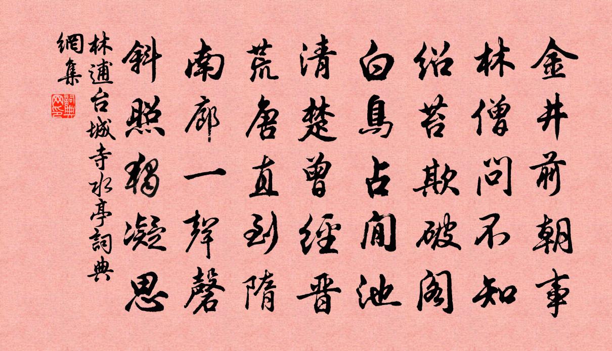 詩詞名句歷史字典書法欣賞書法字典國語詞典說文解字康熙字典古漢語字典標 題 作 者 詩 句 台城寺水亭作者:林逋 朝代:宋代台城寺水亭原文金井前朝事,林僧問不知。紹苔欺破閣,白鳥占閒池。清楚曾經晉,荒唐直到隋。南廊一聲磬,斜照獨凝思。詩詞問答問:台城寺水亭的作者是誰?答:林逋問:台城寺水亭寫於哪個朝代?答:宋代林逋台城寺水亭書法欣賞台城寺水亭書法作品詩詞推薦失調名董武子〔宋代〕疇昔尋芳秘殿西。日壓金鋪,宮柳垂垂。江北梅開殊晚和林實之別駕韻孫應時〔宋代〕許氏南園十裡間,蹉跎勝賞 * 。寄聲行客如回首,莫把尋常醉眼看。足弱二首姜特立〔宋代〕腳力雖雲弱,心靈尚宛然。休輕刖孫臏,猶解殺龐涓。秋涼閒臥白居易〔唐代〕殘暑晝猶長,早涼秋尚嫩。露荷散清香,風竹含疏韻。幽閒竟日臥,衰病無人問。薄暮宅門前,槐花深一寸。含珠林舒坦〔宋代〕何代神僧機匠深,手栽珠樹作珠林。獰龍離穴頷初鑿,老蚌出泥光易尋。海近鮫人工迸泣,山深木客費愁吟。開窗贈李十四四首王勃〔唐代〕野客思茅宇,山人愛竹林。琴尊唯待處,風月自相尋。風筵調桂軫,月徑引藤杯。直當花院裡,書齋望曉開。春從天上來姬翼〔元代〕枯木寒灰。寄野墅茅堂,冷淡林隈。地偏人靜,月朗風清,窗戶絕點塵埃。有自然訊息,銀霞璨、珠玉瓊瑰。信悠贈別歐陽全真三首趙蕃〔宋代〕幾日暄寒候,渾如到嶺南。岑岑無藥療,憒憒只書耽。雨止隅仍漏,鳶飛潦政涵。君來得披豁,萬里散晴嵐。枕上陸游〔宋代〕呼兒 * 上門關,怕冷貪眠自笑孱。月色橫分窗一半,秋聲正在樹中間。暮年不復樽前樂,浮世無如枕上閒。鏈句和鞏宰送牡丹三首姜特立〔宋代〕品格高低各自春,大如玉斗滿如輪。前賢曾譜花王說,唯有姚黃始是真。吳清翁石橋方鳳〔宋代〕金椎誰奮破山霆,趨石渾疑走六丁。間道便須橫螮蝀,長竿先已豎晴蜓。濟川作略君堪紀,吟雪行藏我欲經。領取金峰寺陳自新〔宋代〕金峰寺外望藍橋,只尺溪山路許遙。世事昏人心似醉,倚欄無計遺愁消。頌古十首釋普岩〔宋代〕洗缽家家事一同,新羅不在海門東。因行掉臂趙州老,身在煙蘿第幾重。高宗皇帝韋杜三詩御書贊岳珂〔宋代〕古者賦詩,惟以言志。或陳卒章,或摭首意。惟聖秉籙,啟於多艱。北鄉之悲,鑾輿未還。歲時雇瞻,雪涕凝竚。靜處釋文珦〔宋代〕常於靜處著閒身,別是清虛冷澹人。禪里斷除千種法,吟中消受一生貧。聲名豈必存編簡,林壑從來有隱淪。雲中天池寺董嗣杲〔宋代〕吳說天池兩字真,梵坊突兀鼓鐘聲。聖燈逐夜朝文閣,雷火何年損相輪。足下有雲如隔世,眼前無地可容塵。追嚴答海上翁(一作答玉師)蘇軾〔宋代〕山翁不復見新詩,疑是河南石壁曦。海水豈容鯨飲盡,然犀何處覓瓊枝。示從侄茂易祓〔宋代〕萬事皆從忙處錯,寂然不動乃能通。君看開濟規模事,卻屬南陽高臣翁。楊侍郎項安世〔宋代〕漕河水入漢江流,逆浪吹鄰上比州。為送新篇歸峴首,亦知舊蔭滿沙頭。每思吾道長城在,常喜斯民命脈留。聖宋如夢令 朱存理鐵網珊瑚卷四王容溪〔元代〕林下一溪春水。林上數峰嵐翠。中有隱居人,茅屋數間而已。無事。無事。石上坐看雲起。名句推薦桃花春水淥,水上鴛鴦浴。韋莊《菩薩蠻》 里仁為美,擇不處仁,焉得知?孔子弟子《論語·里仁篇》 鄰國相望,雞犬之聲相聞,民至老死不相往來。老子《老子·德經·第八十章》 總是愁媒,欲訴誰消遣蘇軾《蝶戀花·蝶懶鶯慵春過半》 山邊幽谷水邊村,曾被疏花斷客魂。張嵲《墨梅》 天下傷心處,勞勞送客亭。李白《勞勞亭》 醉月頻中聖,迷花不事君李白《贈孟浩然》 一聲已動物皆靜,四座無言星欲稀。李頎《琴歌》 十年生死兩茫茫,不思量,自難忘。蘇軾《江城子·乙卯正月二十日夜記夢》 綠葉翠莖,冒霜停雪。左思《三都賦》