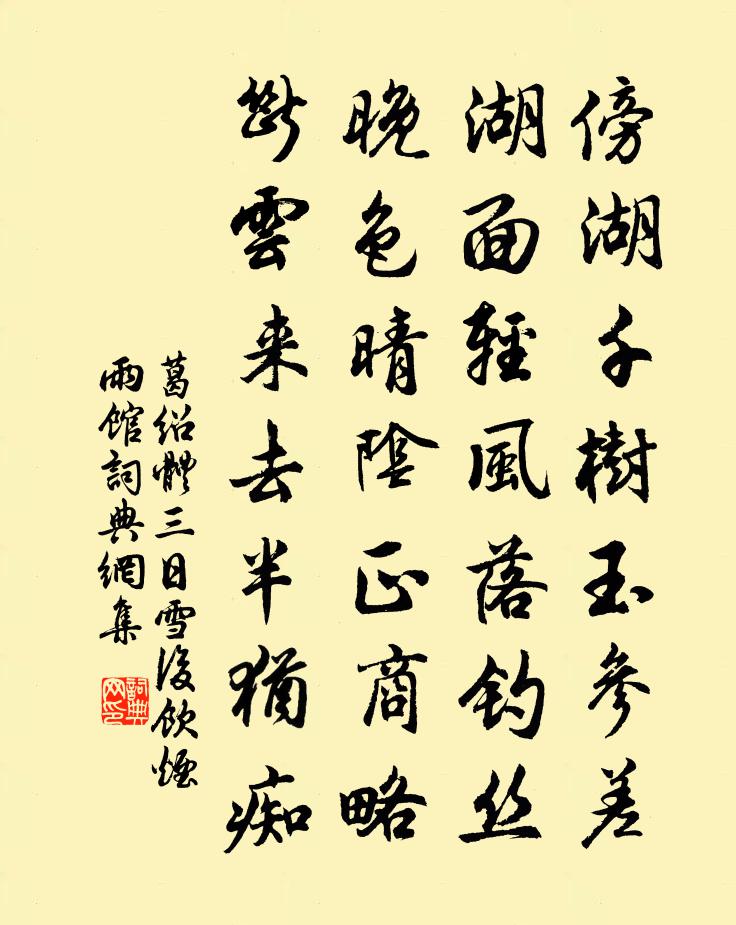 詩詞名句歷史字典書法欣賞書法字典國語詞典說文解字康熙字典古漢語字典標 題 作 者 詩 句 三日雪後飲煙雨館作者:葛紹體 朝代:宋代三日雪後飲煙雨館原文傍湖千樹玉參差,湖面輕風落釣絲。晚色晴陰正商略,斷雲來去半猶痴。詩詞問答問:三日雪後飲煙雨館的作者是誰?答:葛紹體問:三日雪後飲煙雨館寫於哪個朝代?答:宋代葛紹體三日雪後飲煙雨館書法欣賞三日雪後飲煙雨館書法作品詩詞推薦壽蕭東海丘葵〔宋代〕樂哉東海老,天與以遐齡。前一輩人物,為諸生典型。頭因嗜書白,眼不要人青。歲歲桑蓬旦,人間活壽星。使至嵩山尋杜四不遇慨然復傷田洗馬韓觀主…贈杜侯杜四宋之問〔唐代〕洛橋瞻太室,期子在雲煙。歸來不相見,孤賞弄寒泉。與君闊松石,於茲二十年。田公謝昭世,韓子秘幽埏。憶昔送殷華之洪州陳羽〔唐代〕離堂悲楚調,君奏豫章行。愁處雪花白,夢中江水清。扣船歌月色,避浪宿猿聲。還作經年別,相思湖草生。【正宮】小梁州_春夜張可久〔元代〕春夜玉簫吹斷鳳釵分,瘦損真真。小詞空制錦回文,孤眠恨,翠被寶香溫。【麼】故人一去無音信,望蓬萊隔幾重王君貺宣徽輓詞三首蘇轍〔宋代〕妙年收賈傅,白首貴王陽。志氣文章在,功名歲月長。遺孫依舊德,故吏滿諸方。河朔三持節,斯民定不忘。謫墮趙元信近來得小鬟歌曲便須熟寐此還是有所得鄭剛中〔宋代〕清歌聲里便高眠,古老詩中借一聯。猿抱子歸青嶂里,鳥啼花落碧岩前。寄蛩光上人陸希聲〔唐代〕筆下龍蛇似有神,天池雷雨變逡巡。寄言昔日不龜手,應念江頭洴澼人。畫墨竹贊黃庭堅〔宋代〕人有歲寒心,乃有歲寒節。何能貌不枯,虛心聽霜雪。射殿引諸班出官人拽垛子二首魏了翁〔宋代〕控矢張弓十作朋,射余回首列前榮。須臾當殿聽宣授,首下尻高萬歲聲。秋日即事三首王之道〔宋代〕挽仰黃花集,澄清九月秋。預愁新任迫,難為故人留。嵐去山光合,江回水氣浮。何當脫羈絆,同辦五湖舟。送從叔牧永州盧綸〔唐代〕五侯軒蓋行何疾,零陵太守登車日。零陵太守淚盈巾,此日長安方欲春。虎府龍節照岐路,何苦愁為江海人。彼方示詩僧了信胡寅〔宋代〕伊誰遣子著袈裟,幸自同源又一家。尚喜深山閟珍璞,曾看枯卉粲奇葩。空言組繡真無用,實際津途亦易差。衣敝寄題詮律師院貫休〔唐代〕錦溪光里聳樓台,師院高凌積翠開。深竹杪聞殘磬盡,一茶中見數帆來。焚香只是看新律,幽步猶疑損綠苔。莫訝茂叔兄還鄉北郊酌別魏了翁〔宋代〕動是三年別,才堪十日留。蒼頭相與並,軟語未能休。只攪趙遙夢,真成浪泊游。相期各努力,歲月鬢邊遒。和阻風潛江以詩禱神廖行之〔宋代〕江行幾日風打頭,江上客子添牢愁。人言水神喜作祟,客欲精禱姑維舟。平生結習口語業,篇詩敢告波神休。欣然歸練潭釋永頤〔宋代〕孤舟東下涉苹溪,兩岩幽花送客西。到得山房綠陰滿,午窗猶有了規啼。游竹林寺方乾〔唐代〕得路到深寺,幽虛曾識名。蘚濃陰砌古,煙起暮香生。曙月落松翠,石泉流梵聲。聞僧說真理,煩惱自然輕。偈頌七十六首釋師範〔宋代〕劫灰飛盡見靈蹤,突兀凌霄對五峰。意在目前誰共委,相同扶起舊家風。袁州北崇勝寺二首趙蕃〔宋代〕故人貽我壁間詩,何處飄零負此期。蹭蹬我今慚薄宦,飛騰君合趁明時。雖然不用逢人說,老矣何庸覓世知。借問頌石頭和尚草庵歌釋印肅〔宋代〕成時初見茅草新,權披百衲強看經。賴得藥山重決破,別傳一句醒人心。名句推薦曾與美人橋上別,恨無訊息到今朝。劉禹錫《楊柳枝 / 柳枝詞》 錦瑟無端五十弦,一弦一柱思華年。李商隱《錦瑟》 朝見馬嶺黃沙合,夕望龍城陣雲起。盧思道《從軍行》 行高者,名自高。人所重,非貌高。李毓秀《弟子規·泛愛眾》 血染征袍透甲紅,當陽誰敢與爭鋒!古來沖陣扶危主,只有常山趙子龍。羅貫中《三國演義·第四十一回》 好風朧月清明夜,碧砌紅軒刺史家。白居易《清明夜》 相逢秋月滿,更值夜螢飛。王績《秋夜喜遇王處士》 人歸落雁後,思發在花前。薛道衡《人日思歸》 一聲聲,一更更。万俟詠《長相思·雨》 脊令各有思歸恨,日月相催雪滿顛。黃庭堅《次元明韻寄子由》