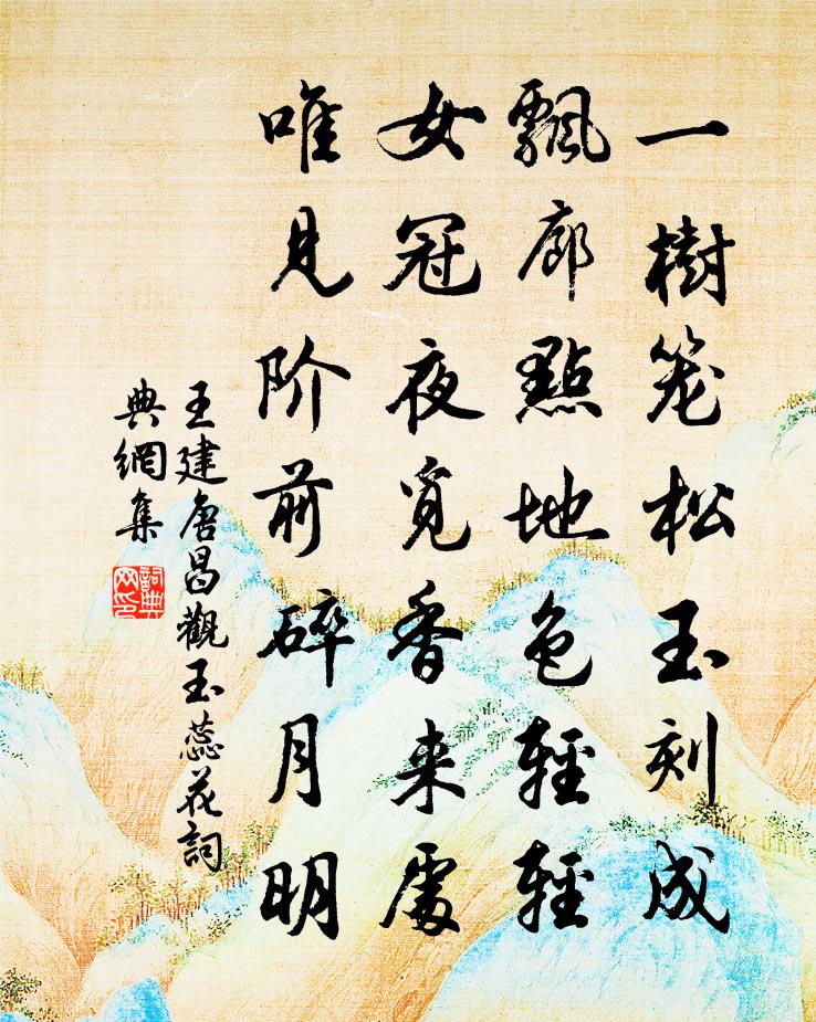 詩詞名句歷史字典書法欣賞書法字典國語詞典說文解字康熙字典古漢語字典標 題 作 者 詩 句 唐昌觀玉蕊花作者:王建 朝代:唐代唐昌觀玉蕊花原文一樹籠松玉刻成,飄廊點地色輕輕。女冠夜覓香來處,唯見階前碎月明。詩詞問答問:唐昌觀玉蕊花的作者是誰?答:王建問:唐昌觀玉蕊花寫於哪個朝代?答:唐代問:王建的名句有哪些?答:王建名句大全王建唐昌觀玉蕊花書法欣賞唐昌觀玉蕊花書法作品詩詞推薦城南蔣莊四首李長民〔宋代〕郊居人事絕,倦暑每晨興。蓮□池中佛,筍供林下僧。吟餘厭蟬噪,望遠喜禾登。朝市忘懷久,何勞羨賜冰。次韻謝平心胡祠監見惠生日五首方回〔宋代〕酒可吾中孰聖賢,定開愁眼聳吟肩。共憐雪鬢雙垂叟,時到花屏萬仞巔。暫借松陰消永日,敢求藥訣覬長年。風驚以使事過成都訖事而歸虞萬州成都尉高表史拉魏了翁〔宋代〕天運無窮成變化,水流不息作江淮。須知瞪處非無事,莫著仙人舊草鞋。望江南黃公紹〔宋代〕思晴好,晨起望籬東。畢竟陰晴排日子,大都行止聽天公。且住此山中。村居書事陸游〔宋代〕修身世世詩書業,營利明明市井人。安得後生俱自好,百年門戶本來貧。歲暮夜雪招二王詩人菲果小飲徐渭〔明代〕斗酒那能不醉休,醉來可使不歌不? 黃金雖我無顏色,秋水還誰辨馬牛? 笑插落梅花亂鬢,起看城雪筋冰樓。黃公濟徐照〔宋代〕石色丹砂文,林木翠相合。靈源一派長,近與銀漢接。老眼掛千仞,吟步繞百匝。雲遮忽有無,路坳見重疊。鳳響門外姜特立〔宋代〕門外青山列髻螺,園中花木錦成窠。慚無功業報明主,空占閒居樂事多。送王使君赴太原行營錢起〔唐代〕太白明無象,皇威未戢戈。諸侯持節鉞,千里控山河。漢驛雙旌度,胡沙七騎過。驚蓬連雁起,牧馬入雲多。不賣文公書院新創方回〔宋代〕新堂育士煥榱椽,突起文公故宅邊。孟子向來推亞聖,鄒人誰不企先賢。遺書會萃垂千古,缺典因循近百年。為問沁園春侯善淵〔元代〕道德陰符,寶藏靈文,賢聖盡欽。論杳冥恍惚,精微至道,有無升降,動靜浮沉。六洞飛玄,三宮妙化,*匹雙關橄欖葉茵〔宋代〕落盡紅鹽子更青,余甘風韻未為珍。從來獨有茶知已,勘破生生一點仁。念奴嬌(梅花)陳紀〔宋代〕斷橋流水,見橫斜清淺,一枝孤裊。清氣乾坤能有幾,都被梅花占了。玉質生香,冰肌不粟,韻在霜天曉。林間姑句釋曉瑩〔宋代〕可堪時序苦侵尋,留滯誰知此日心。才上人處見圓機五字輒用其韻作晁說之〔宋代〕振錫千峰下,觀空萬象前。水深猱臂直,雪厚虎諦圓。工部淚徒感,贊公燈不眠。當年郭有道,今日更談禪。寄李處州趙蕃〔宋代〕自入湖南路,驅車得屢停。流傳雖有句,次舍或無亭。險絕猶雲未,艱危不易聽。真宜太白醉,未信屈原醒。我去冬盡日睢陽感事強至〔宋代〕天邊愁緒細如毛,眼底詩情付濁醪。張許忠魂空日月,鄒枚樂事委蓬蒿。積成鄉思心頻折,送盡年華首重搔。杜子晚登會真道堂望廬山大江作方回〔宋代〕春風燠江城,樓台眩桃李。高堂一臨眺,傍觀謂予喜。予心實不然,俯視憫群蟻。通衢共塵埃,委巷困泥滓。膏火七夕仇遠〔宋代〕歲歲今宵乞巧樓,疏星如弈月如鉤。莫將寒信侵房屋,肯把閒情問女牛。兒笑無書空曬腹,婦言有酒可澆愁。鵲慵柳梢青魏了翁〔宋代〕不果,又以簡書不克往侍缺,然於懷,再遣小闋,托諸兄代勸。記得年年。阿奴碌碌,常在眼前。彩舫吳天,錦輪名句推薦有功於前,有敗於後,不為損刑。有善於前,有過於後,不為虧法。商鞅《商君書·賞刑》 獨有宦遊人,偏驚物候新。杜審言《和晉陵陸丞早春遊望》 春風得意馬蹄疾,一日看盡長安花。孟郊《登科後》 靜女其姝,俟我於城隅。佚名《靜女》 顛沛之揭,枝葉未有害,本實先撥詩經《盪》 一輪秋影轉金波,飛鏡又重磨。辛棄疾《太常引·建康中秋夜為呂叔潛賦》 帝里重清明,人心自愁思。孟浩然《清明即事》 春山煙欲收,天淡星稀小牛希濟《生查子·春山煙欲收》 月華如練,長是人千里。范仲淹《御街行·秋日懷舊》 又送王孫去,萋萋滿別情。白居易《草 / 賦得古原草送別》