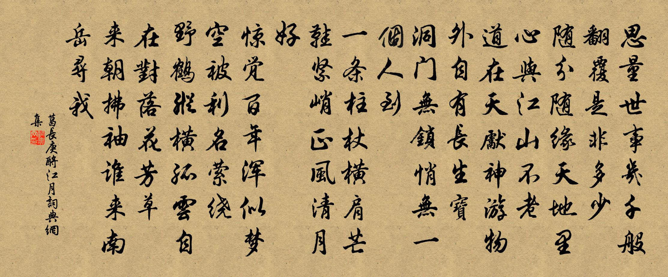 思量世事,幾千般翻覆,是非多少。隨分隨緣天地里,心與江山不老。
