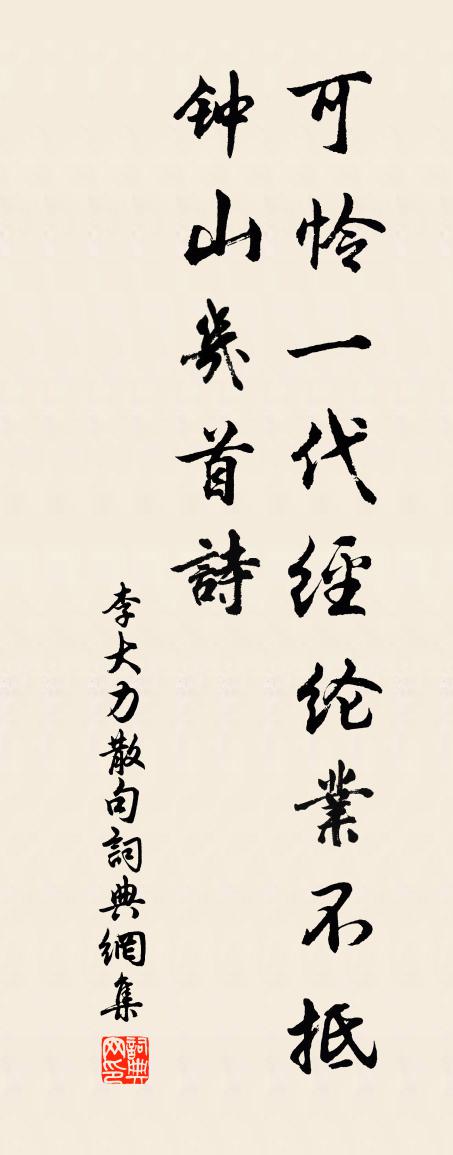 詩詞名句歷史字典書法欣賞書法字典國語詞典說文解字康熙字典古漢語字典標 題 作 者 詩 句 句作者:李大力 朝代:宋代句原文可憐一代經綸業,不抵鐘山幾首詩。詩詞問答問:句的作者是誰?答:李大力問:句寫於哪個朝代?答:宋代李大力句書法欣賞句書法作品詩詞推薦游丈人觀謁先帝御容徐氏〔唐代〕共謁御容儀,還同在禁闈。笙歌喧寶殿,彩仗耀金徽。清淚沾羅袂,紅霞拂繡衣。九疑山水遠,無路繼湘妃。古意六首艾性夫〔宋代〕佳人買明鏡,意重輕千金。結以雙羅帶,欲照盪子心。盪子渺不歸,鏡影春雲深。沁園春李彌遜〔宋代〕敧床深軒床,散帙虛床堂,畏景屢移。漸披襟臨水,搘床就月,蓮香拂床,竹色侵衣。壓玉為醪,折荷當盞,臥看萬山寺王逵〔宋代〕眾狀皆窮險,茲形獨擅方。坦夷中砥礪,端正外青蒼。上帝圍棋局,炎君避暑床。回嗟太行路,更近利名場。食鷓鴣楊萬里〔宋代〕江南厭聽鷓鴣曲,嶺南初嘗鷓鴣肉。年年細雨落花春,鉤輈格磔惱 * 。竹雞泥滑報行客,鷓鴣更道行不得。方兄次韻周子直四首張嵲〔宋代〕寰宇安危異,乾坤歲序同。投身雲嶠碧,落膽戰塵紅。晉馬成南渡,宗周入國風。操戈誰衛社,群盜正爭雄。陪李監稅飲劉園曹彥約〔宋代〕剩栽花木市低牆,滿刻詩文榜畫堂。郁李齊開枝尚弱,牡丹垂謝蕊猶香。書生野趣人間少,遊子佳時客里忙。準擬飲方君舍晚歸韓維〔宋代〕慘澹秋原思,歸鞍暮向城。野風吹酒散,寒日上衣明。躑躅樵兒聚,喧呼獵騎輕。村醪處處熟,準擬數來行。減字木蘭花王哲〔元代〕心低大小。細細搜尋玄里妙。大小心低。酉上為東卯作西。心高火出。走了三田餳與蜜。火出心高。轉轂輪迴又一菩薩蠻蔡伸〔宋代〕當時攜手今千里。可堪重到相逢地。觸目盡關心。流鶯尚好音。無人知我意。只有涓涓淚。寂寞到斜陽。羅衣裛舊書齋十詠壓紙獅子劉子翬〔宋代〕鎮浮須假重,刻石作狻猊。偶以形模好,兒童競見知。送友人游蜀喻坦之〔唐代〕為儒早得名,為客不憂程。春盡離丹闕,花繁到錦城。雪消巴水漲,日上劍關明。預想回來樹,秋蟬已數聲。同皇甫兵曹天官寺浴室新成招友人賞會寇坦〔唐代〕溫室歡初就,蘭交託勝因。共聽無漏法,兼濯有為塵。水潔三空性,香沾四大身。清心多善友,頌德慰同人。送王季海敷文赴閩漕喻良能〔宋代〕諫省歸來三載餘,君王應渴見鴻儒。七閩重地誰能漕,聊出長才為轉輸。和芙蓉和尚四句偈頌鐵鋸舞三台釋慧暉〔宋代〕鐵牛無角臥山坡,鞭起如飛見也么。鬧市橫騎人不會,抬頭鷂子過新羅。貧甚戲作絕句陸游〔宋代〕貸米東村待不回,缽盂過午未曾開。飢腸雷動尋常事,但誤生台兩鵲來。複次前韻答潛師蘇轍〔宋代〕憐君古木依岩槁,西江飲盡須彌倒。野花幽草亦何為,嶮韻高篇空自惱。萬點浮溪輒長嘆,一枝過嶺仍夸早。拾香無題陳允平〔宋代〕鮫綃簾卷錦屏開,弱柳絲絲拂吹台。閒品琵琶不成調,落花飛趁曉風來。秋聲釋文珦〔宋代〕商飆何厲疾,群籟盡囂囂。回穴生崖谷,淜滂度泬寥。恍疑沙漠戰,誤聽浙江潮。遮莫頻相聒,羈魂易得消。東溪言事寄于丹方乾〔唐代〕日月晝夜轉,年光難駐留。軒窗才過雨,枕簟即知秋。草際鳥行出,溪中虹影收。唯君壯心在,應笑臥滄洲。名句推薦摩頂放踵利天下,為之。孟子《孟子·盡心章句上·第二十六節》 相逢秋月滿,更值夜螢飛。王績《秋夜喜遇王處士》 將之器,其用大小不同。諸葛亮《將苑·卷一·將器》 應傾謝女珠璣篋,盡寫檀郎錦繡篇。羅隱《七夕》 人之敵,非奸亦奸;人之友,其奸亦忠。來俊臣《羅織經·察奸卷第八》 虛靜無事,以暗見疵。韓非及後人《韓非子·主道》 到家應是,童稚牽衣,笑我華顛。吳激《訴衷情·夜寒茅店不成眠》 雨雪自飛千嶂外,榆林只隔數峰西。朱彝尊《出居庸關》 窈窕淑女,君子好逑。佚名《關雎》 寒山幾堵,風低削碎中原路,秋空一碧無今古。陳維崧《醉落魄·詠鷹》