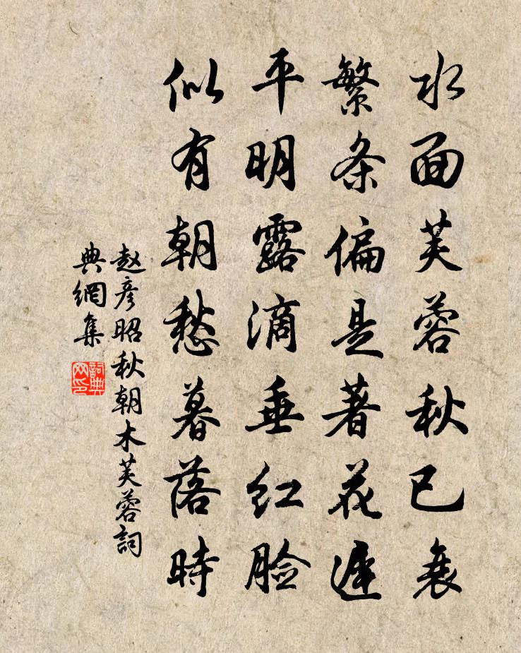 詩詞名句歷史字典書法欣賞書法字典國語詞典說文解字康熙字典古漢語字典標 題 作 者 詩 句 秋朝木芙蓉作者:趙彥昭 朝代:唐代秋朝木芙蓉原文水面芙蓉秋已衰,繁條偏是著花遲。平明露滴垂紅臉,似有朝愁暮落時。詩詞問答問:秋朝木芙蓉的作者是誰?答:趙彥昭問:秋朝木芙蓉寫於哪個朝代?答:唐代問:秋朝木芙蓉是什麼體裁?答:七絕趙彥昭秋朝木芙蓉書法欣賞秋朝木芙蓉書法作品注釋全唐詩:卷103_20詩詞推薦漁家傲(壽季武博)吳泳〔宋代〕翠隱紅藏春尚薄。百花頭上梅先覺。清曉寒城聞畫角。雲一握。鴉翻詔墨天邊落。碧眼稜稜言諤諤。諫書猶自留黃過竹田西堂無相庵房釋如珙〔宋代〕懶舉話頭嫌鼻祖,燒香那肯禮西方。空房消盡閒心識,日往月來不見長。贈別鄭谷〔唐代〕南遊曾共游,相別倍相留。行色回燈曉,離聲滿竹秋。穩眠彭蠡浪,好醉岳陽樓。明日逢佳景,為君成白頭。通玄觀黃庚〔宋代〕雲氣深深護石壇,紅塵飛不到闌乾。清陰滿地無人跡,一徑松風鶴夢寒。和趙生二首胡寅〔宋代〕遍游南北與西東,欲訪人間國士風。處世甚疎皆笑我,宅心無累獨奇公。詩才自愧非三上,酒聖相從又一中。芍藥吳越三王判牘帖贊岳珂〔宋代〕玉冊之樓壓吳杭,三川錦繡開故鄉。英姿颯颯熊虎相,紅袍金印交煒煌。百年霸府儀物龐,山判近出功臣堂。鳳宅代答楊億〔宋代〕徵車苦迢遞,節物感愁辛。已入授衣月,那經落帽辰。金樽難獨酌,寶瑟任生塵。把菊流雙淚,誰知憶遠人。憩連嶺店楊萬里〔宋代〕此館初明眼,前山正接眉。熱嫌連日甚,涼惜兩朝遲。雨竹何其重,風鷗不自持。庭闈猶百里,早已豁愁思。題海棠二首李石〔宋代〕林光皎皎弄青枝,頗怪東風解凍遲。一夜前溪流雪汁,余花別岸不須吹。元日胡仲弓〔宋代〕元日復元日,吟邊閱歲華。淺斟浮柏葉,清坐對梅花。人事年年改,生涯步步差。詩情無厚薄,春意又萌芽。晚望孫應時〔宋代〕倚杖柴門外,蟬聲晚正清。水涵初月白,山對落霞明,心跡真無事,行藏付此生。鄰翁過相語,有喜近西城。金丹詩四十八首張繼先〔宋代〕塵寰道友萬千人,幾個虛名幾個真。不悟汞鉛為至寶,卻將爐灶學燒銀。內中採藥方端的,外里求丹謾苦辛。何況郊行陸游〔宋代〕春郊無處不堪行,滿路人家笑語聲。賣劍買牛知盜息,乞漿得酒喜時平。西村日落川雲暝,東嶺虹收海氣清。農事投老高翥〔宋代〕投老才營一把茅,前臨官路後林坳。最宜雞犬無鄰舍,好放牛羊有近郊。春韭采來勝市食,秋鱸留取續山餚。吾廬用蔣成甫韻賀虞退夫生子且以相名之魏了翁〔宋代〕秦雍孫曾尚典刑,只將一念答天明。震雷殷地勾萌達,解雨鳴春澗谷聲。階玉正看聯羯末,籯金安足擬賢成。相門鹿城晚眺林景熙〔宋代〕古城仙鹿遠,百感赴斜曛。海氣千年聚,山形九斗分。神鴉飢吸蘚,宰木蠹藏雲。何處鳴鉦發,春屯又易軍。同友行山峰隱僧語釋文珦〔宋代〕我本忘世人,有志在岩穴。欣逢會心友,提攜步林樾。雲中野僧居,樹梢清磬發。不憚登陟勞,遂得造石窟。門前水龍吟 王瓠山承旨以賞牡丹水龍吟見寄,且劉敏中〔元代〕者。則知瓠山所居,乃余向者所寓李氏居也。次韻答之牡丹何可無言,廣平曾有梅花賦。蹉跎老矣,愁多歡少,花天育二老禪惠示經佛偈答以十詩鄭清之〔宋代〕龍宮海藏自分明,搕撟灘頭一任傾。因果若還終不昧,政須防作野狐鳴。送祖心還嶺南顧夢遊〔清代〕一春風雨愁中去,春去還添送別愁。心事兩年同下淚,鶯聲舊日獨憑樓。舟車已斷尋前路,城郭重歸失舊遊。只恐名句推薦勿營華屋,勿謀良田。朱柏廬《朱子家訓·全文》 梅子黃時日日晴,小溪泛盡卻山行曾幾《三衢道中》 百歲落半途,前期浩漫漫。李白《登敬亭山南望懷古贈竇主簿》 南軒有孤松,柯葉自綿冪。李白《南軒松》 五更鐘動笙歌散,十里月明燈火稀。賀鑄《思越人·紫府東風放夜時》 白日依山盡,黃河入海流。王之渙《登鸛雀樓》 秋風別蘇武,寒水送荊軻。庾信《擬詠懷二十七首·其二十六》 善之生如春,惡之死如秋,故民勸極力而樂盡情,此之謂上下相得。韓非及後人《韓非子·守道》 猶有遺簪,不展秋心,能卷幾多炎熱。張炎《疏影·詠荷葉》 野花不種年年有,煩惱無根日日生。馮夢龍《警世通言·卷二十》