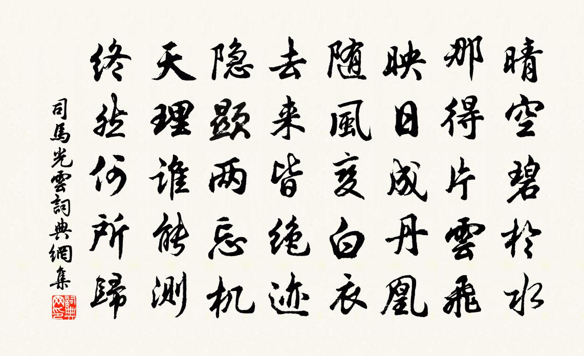 詩詞名句歷史字典書法欣賞書法字典國語詞典說文解字康熙字典古漢語字典標 題 作 者 詩 句 雲作者:司馬光 朝代:宋代雲原文晴空碧於水,那得片雲飛。映日成丹凰,隨風變白衣。去來皆絕跡,隱顯兩忘機。天理誰能測,終然何所歸。詩詞問答問:雲的作者是誰?答:司馬光問:雲寫於哪個朝代?答:宋代問:司馬光的名句有哪些?答:司馬光名句大全司馬光雲書法欣賞雲書法作品詩詞推薦景德四年為中江令後為益州轉運賦詩薛田〔宋代〕一同舊治居芸閣,八使新銜忝柏台。父老出郊迎馬首,人情似到故鄉來。偶成丘葵〔宋代〕風雨三間屋,乾坤一腐儒。營生妻笑拙,學古客言迂。坐久燈花落,吟成硯水枯。方書俱遍覽,無藥可醫愚。八月十六夜月盧延讓〔唐代〕十六勝三五,中天照大荒。只訛些子緣,應號沒多光。桂老猶全在,蟾深未煞忙。難期一年事,到曉泥詩章。夜坐燈滅戲作陸游〔宋代〕冷飯黃齏傲太平,鬢絲原不為愁生。忽因燈死得奇觀,明月滿窗梅影橫。題昭君圖王灼〔宋代〕朔風吹鬢影,猶抱琵琶立。胡兒在何許,邊頭羽書急。宿洞霄虛白房張煒〔宋代〕列岫宗奇觀,藤蘿結翠門。隔岩龍喚雨,雲走半窗昏。送智門祥師便呈斯遠兄趙蕃〔宋代〕寺後溪亭我所開,春風應已長莓苔。南州高士如臨賦,為把新詩寫寄來。重午王鎡〔宋代〕絲絲梅雨濕榴花,處處釵符裊鬢鴉。醉聽畫樓思遠曲,艾枝簪滿碧巾紗。【中呂】快活三過朝天子_芝蘭種不生佚名〔元代〕芝蘭種不生,荊棘亂縱橫。偶因命快得個虛名,只管望前掙。緊行,慢行,趕不上休擊競。干戈蠻觸枉了戰爭,世雜詠一百首二衍劉克莊〔宋代〕雖以賓師待,幾於妾婦然。不羞君割地,謾對客談天。【越調】小桃紅_湖上和劉時張可久〔元代〕湖上和劉時中二首一聲嬌燕綠楊枝,滿眼尋芳事。塔影雷峰水邊寺,夕陽時,畫船無數圍花市。三弦玉指,雙鉤草江亭曉望王炎〔宋代〕天在空濛外,山橫杳靄中。潮翻江水白,日射海霞紅。旅食思鄉社,歸舟待便風。老懷誰共語,注目送飛鴻。送顧非熊及第歸茅山厲玄〔唐代〕故山登第去,不似舊歸難。帆卷江 * ,梅生洞少寒。採薇留客飲,折竹掃仙壇。名在儀曹籍,何人肯掛冠。九懷嶀山雨高似孫〔宋代〕砥蒼岩兮燕危磐,枕淵洄兮夏留寒。谷懷煙兮川引霧,出漁鄉兮人樵路。屋如懸兮石將危,盪蘭舟兮揚桂旗。江有冬至日寄小侄阿宜詩杜牧〔唐代〕小侄名阿宜,未得三尺長。頭圓筋骨緊,兩眼明且光。去年學官人,竹馬繞四廊。指揮群兒輩,意氣何堅剛。今年送陳和仲常博倅嘉禾吳泳〔宋代〕俗士騎戶限,痴官摸床唇。名節與官爵,豈以全畀人。子方貴良貴,我亦仁景仁。終始議論間,但保一色醇。水調歌頭(庚戌壽靜齋叔)李曾伯〔宋代〕喬木老盤谷,仙李盛峨岷。參橫井轉,月邊猶賴有長庚。傳得丹溪正派,更是平庵宅相,夷路早蜚英。十載星沙幕侯郎中新置西湖方乾〔唐代〕遠近利民因智力,周回潤物像心源。菰蒲縱感生成惠,鱣鮪那知廣大恩。瀲灩清輝吞半郭,縈紆別派入遙村。砂泉用十梅韻簽馮簿王炎〔宋代〕霏霏玉麈談,鄙吝堪澡雪。每見輒有聞,敢憚頻磬折。擬感興二首項安世〔宋代〕日出鬼群動作,鬼日入萬物鬼休。君看鬼霄壤間,還有二本否。鬼神浩來往,一穟不可投。殺機甫毫芒,舉世極戈名句推薦冰合井泉月入閨,金缸青凝照悲啼。李白《夜坐吟》 春去秋來也,愁心似醉醺。歐陽炯《巫山一段雲·春去秋來也》 會稽愚婦輕買臣,余亦辭家西入秦。李白《南陵別兒童入京》 野橋梅幾樹,並是白紛紛。洪升《雪望》 黃昏鼓角似邊州,三十年前上此樓。李益《上汝州郡樓》 江上幾人在,天涯孤棹還。溫庭筠《送人東遊》 千丈之堤,以螻蟻之穴潰;百步之室,以突隙之煙焚。韓非及後人《韓非子·喻老》 哀哀父母,生我勞瘁。佚名《蓼莪》 三年遇寒食,盡在洛陽城。白居易《洛橋寒食日作十韻》 道人庭宇靜,苔色連深竹。柳宗元《晨詣超師院讀禪經》