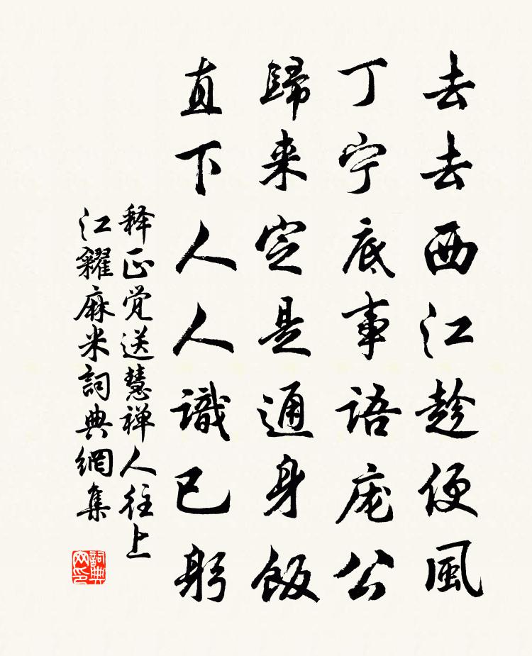 詩詞名句歷史字典書法欣賞書法字典國語詞典說文解字康熙字典古漢語字典標 題 作 者 詩 句 送慧禪人往上江糴麻米作者:釋正覺 朝代:宋代送慧禪人往上江糴麻米原文去去西江趁便風,丁寧底事語龐公。歸來定是通身飯,直下人人識已躬。詩詞問答問:送慧禪人往上江糴麻米的作者是誰?答:釋正覺問:送慧禪人往上江糴麻米寫於哪個朝代?答:宋代釋正覺送慧禪人往上江糴麻米書法欣賞送慧禪人往上江糴麻米書法作品詩詞推薦奉和恩賜樂遊園宴應制蘇頲〔唐代〕樂游光地選,酺飲慶天從。座密千官盛,場開百戲容。綠塍際山盡,緹幕倚雲重。下上花齊發,周回柳遍濃。奪晴憶上苑錫宴宋祁〔宋代〕長懷禁御宴嬉年,帳殿深沉望碧蓮。秦地河流疑象漢,上林宮繚欲捫天。恩盃蘭末流霞溢,蹕道梧陰綷羽鮮。紫陌大琛沽酒趙蕃〔宋代〕吾州大琛酒,名不謝孤洲。女子亦知價,行人皆繫舟。西來灘過險,東上寺逢幽。未說千憂散,姑為一醉謀。對梅分韻得堂字釋斯植〔宋代〕霜風吹短髮,值此天氣涼。行行陰壑中,萬樹皆含芳。相對發微詠,巡用持華觴。嗟彼鹹平人,清風生我腸。花非秋蕊香令黃鑄〔宋代〕花外數聲風定。煙際一痕月淨。水晶屏小敧醉枕。院靜鳴蛩相應。香銷斜掩青銅鏡。背燈影。寒砧夜半和雁陣。秋即度賡喜雪韻衛宗武〔宋代〕崇巒九疊破天慳,地遠塵囂隔幾關。方恨重雲封皓月,俄驚半夜老青山。莫嫌臘後欠三白,且喜春前露一斑。幾度晚春吳璞〔宋代〕開盡荼醾白晝沉,枝頭聲已變春禽。落花莫遣東風惱,小立閒庭愛綠陰。五家林四首張鎡〔宋代〕散亂飛鴻掠快晴,嗈嗈那復苦寒聲。定知已入新詩了,才過余舟便不鳴。東京賦張衡〔兩漢〕安處先生於是似不能言,憮然有間,乃莞爾而笑曰:“若客所謂,末學膚受,貴耳而賤目者也!苟有胸而無心,不過漁浦王冕〔元代〕十八里河船不行,江頭日日問潮生。未同待詔於金馬,卻異看花在錦城。萬里春風歸思好,四更寒雨一燈明。故人河傳黃庭堅〔宋代〕心情老懶。對歌對舞,猶是當時眼。巧笑靚妝,近我衰容華鬢。似扶著、賣卜算。思量好個當年見。催酒催更,只午飯羅漢寺白玉蟾〔宋代〕林間一徑似驚蛇,中有禪關隱紫霞。煙鎖蒼松遮寺額,風搖翠竹撼檐牙。客來寂寞盤香穗,飯罷從容瀹茗花。到此和張秀才落花有感李商隱〔唐代〕晴暖感餘芳,紅苞雜絳房。落時猶自舞,掃後更聞香。夢罷收羅薦,仙歸敕玉箱。迴腸九回後,猶有剩迴腸。無咎兄郡齋燕集有詩末章見及敬次元韻陸游〔宋代〕城樓畫角吹晚晴,梅花墮地草欲生。綺盤翠杓春滿眼,我胡不樂君將行。君歸吾黨共增氣,往往怪我衰涕橫。我來野興陸游〔宋代〕去去歷山寸,行行並廟垣。湍流鱠魚小,仄徑鮓花繁。白鷺飛如導,青蘿險可捫。歸途不寂寞,迎笑有諸孫。示諸弟陳舜俞〔宋代〕吾家崛起蓬蒿間,先君為學良苦艱。典衣買書教我讀,平生貧窶不此慳。歲晚才沾寸祿養,天禍無何頹泰山。況時吊草堂禪師李洞〔唐代〕杖屨疑師在,房關四壁蛩。貯瓶經臘水,響塔隔山鍾。乳鴿沿苔井,齋猿散雪峰。如何不見性,倚遍寺前松。呈江主簿及茗源諸公陳普〔宋代〕章甫公西愧點雩,斷纓子路羨柴愚。天知人棄終從福,道屈身伸賴讀書。有日官曹須忍耐,薰天聲利盡欷噓。行藏夏雲峰(初秋有作)趙長卿〔宋代〕露華清。天氣爽、新秋已覺涼生。朱戶小窗,坐來低按秦箏。幾多妖艷,都總是、白雪餘聲。那更、玉肌膚韻勝,羅湖八首劉克莊〔宋代〕五更海底涌金輪,咫尺蓬萊不遠人。欲和蘇詩臨絕頂,可憐漢節尚隨身。名句推薦山隨平野盡,江入大荒流。李白《渡荊門送別》 崑崙之高有積雪,蓬萊之遠常遺寒。王令《暑旱苦熱》 客睡何曾著,秋天不肯明杜甫《客夜》 假作真時真亦假,無為有處有還無。曹雪芹《紅樓夢·第一回》 音塵遠,楚天危樓獨倚。陸游《月上海棠·斜陽廢苑朱門閉》 紅豆生南國,春來發幾枝。王維《相思》 動失之繁,靜失之寡。王通《中說·卷十·關朗篇》 人生一世,草長一春。佚名《增廣賢文·上集》 春無主!杜鵑啼處,淚灑胭脂雨陳子龍《點絳唇·春日風雨有感》 雨中山果落,燈下草蟲鳴。王維《秋夜獨坐 / 冬夜書懷》